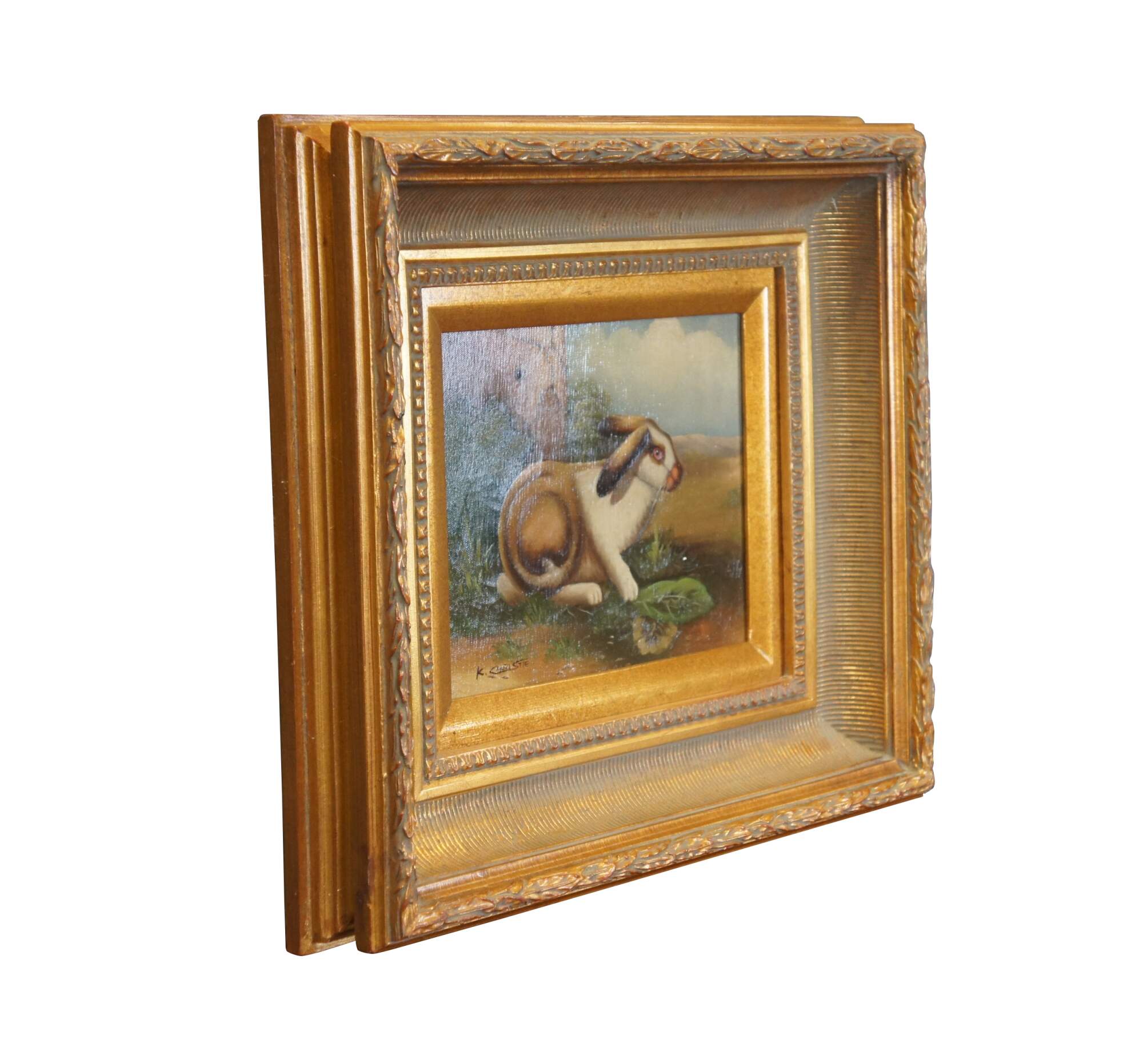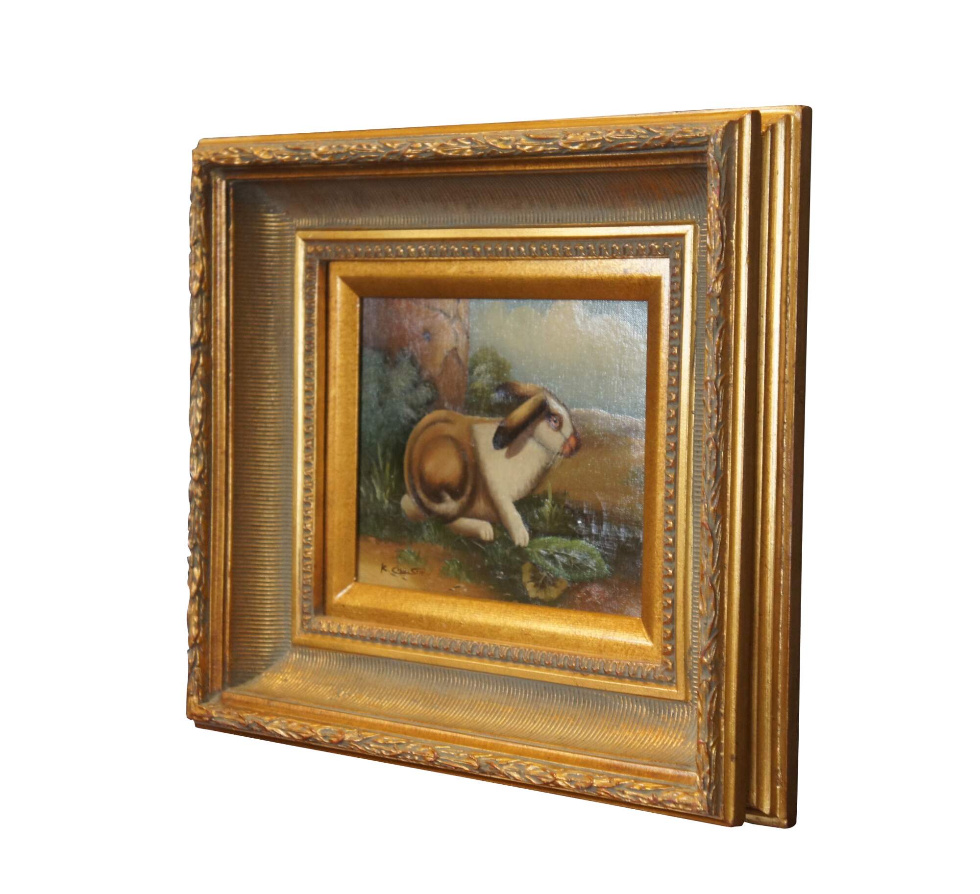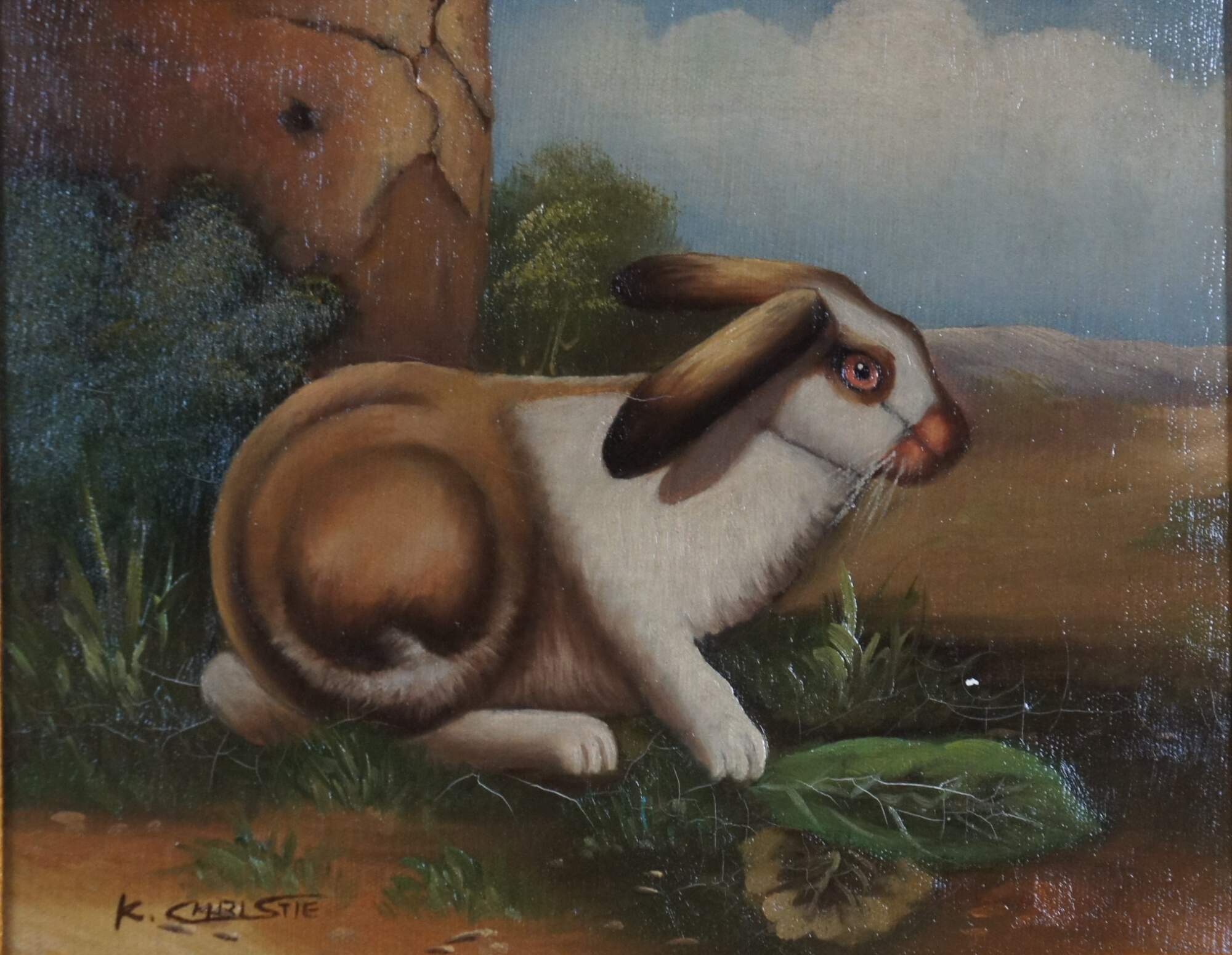 Late 20th century realist oil on canvas painting depicting a brown and white rabbit near a cracked stone wall. Signed K. Christie in lower left corner. Carved and beveled giltwood frame. Marked "Bought Stegman's June 1992 M.D." SKU No: 4-0-987 - Description: Bunny - 8 x 10 - Frame No: G8266 - S1.
