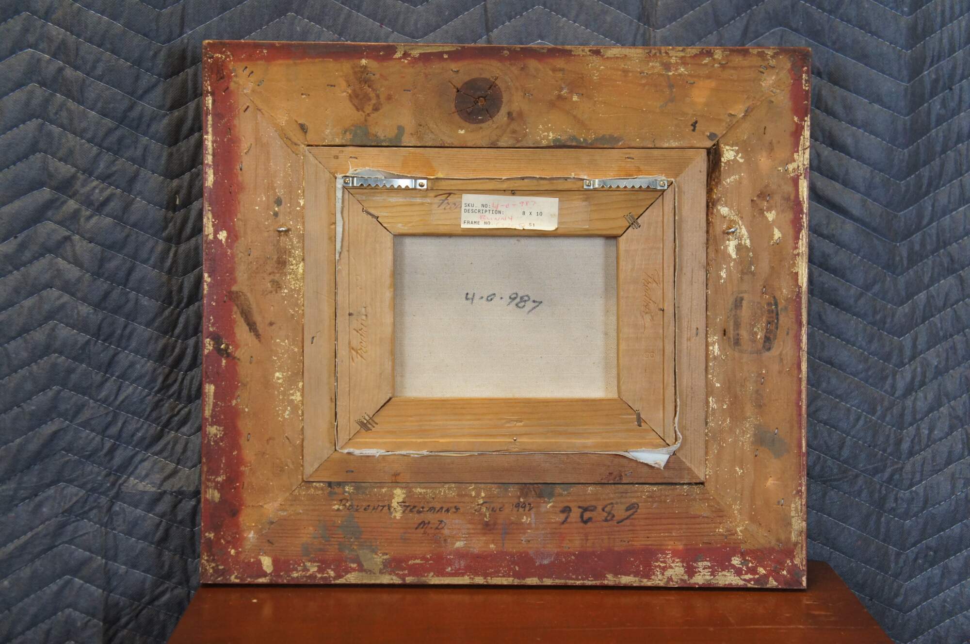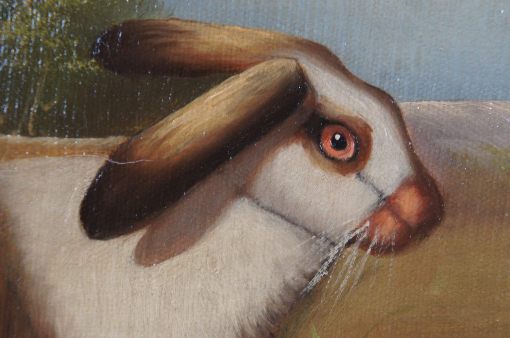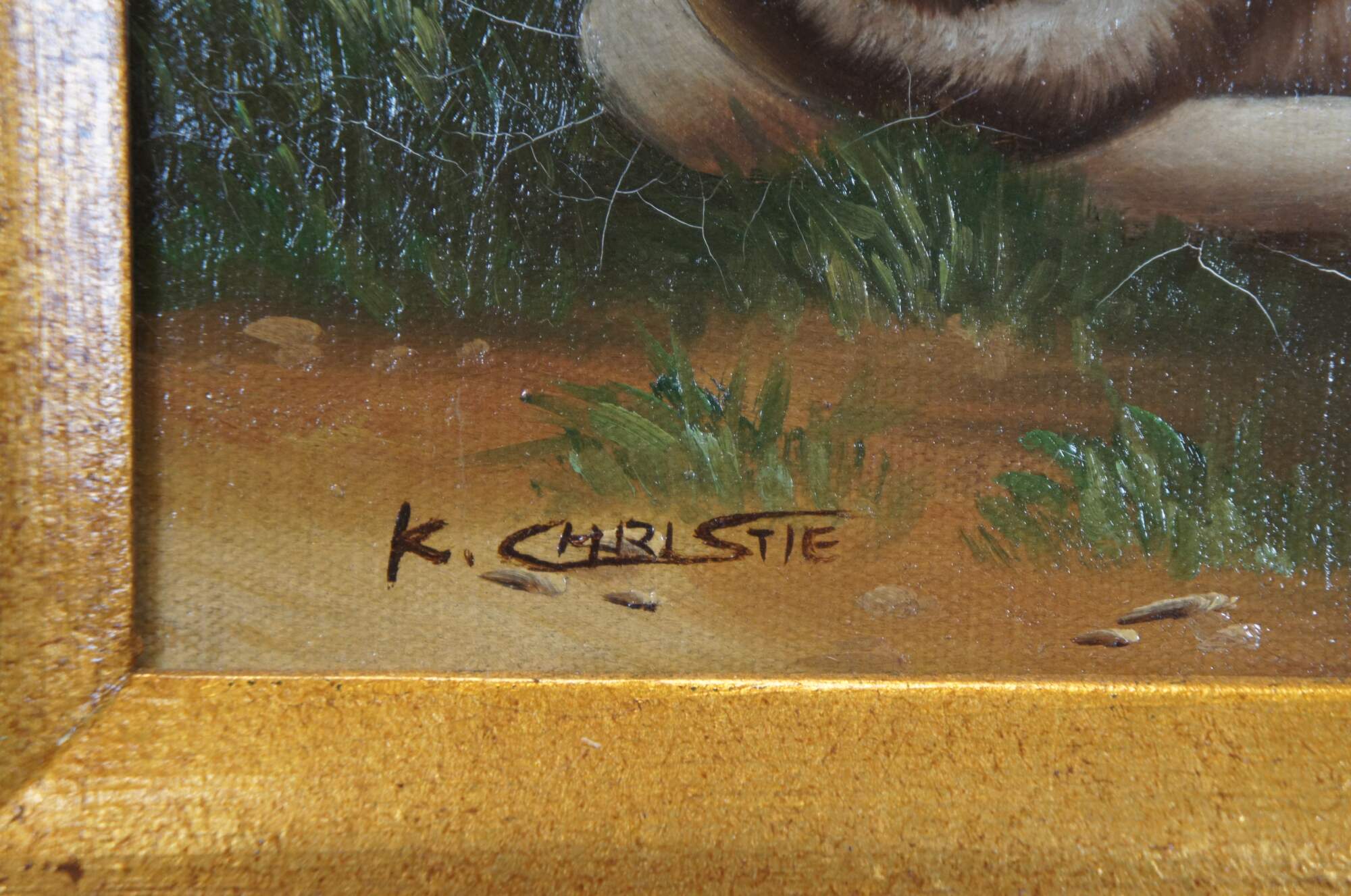 Late 20th century realist oil on canvas painting depicting a brown and white rabbit near a cracked stone wall. Signed K. Christie in lower left corner. Carved and beveled giltwood frame. Marked "Bought Stegman's June 1992 M.D." SKU No: 4-0-987 - Description: Bunny - 8 x 10 - Frame No: G8266 - S1.