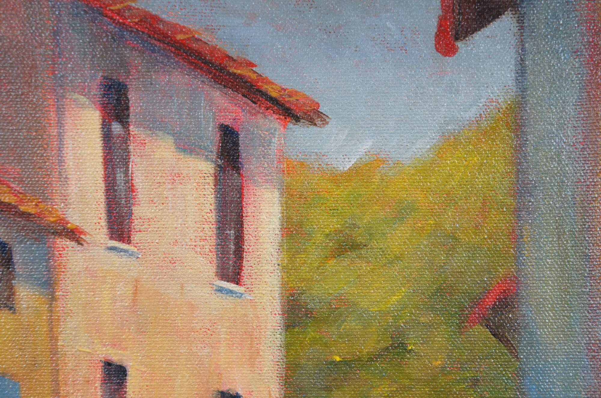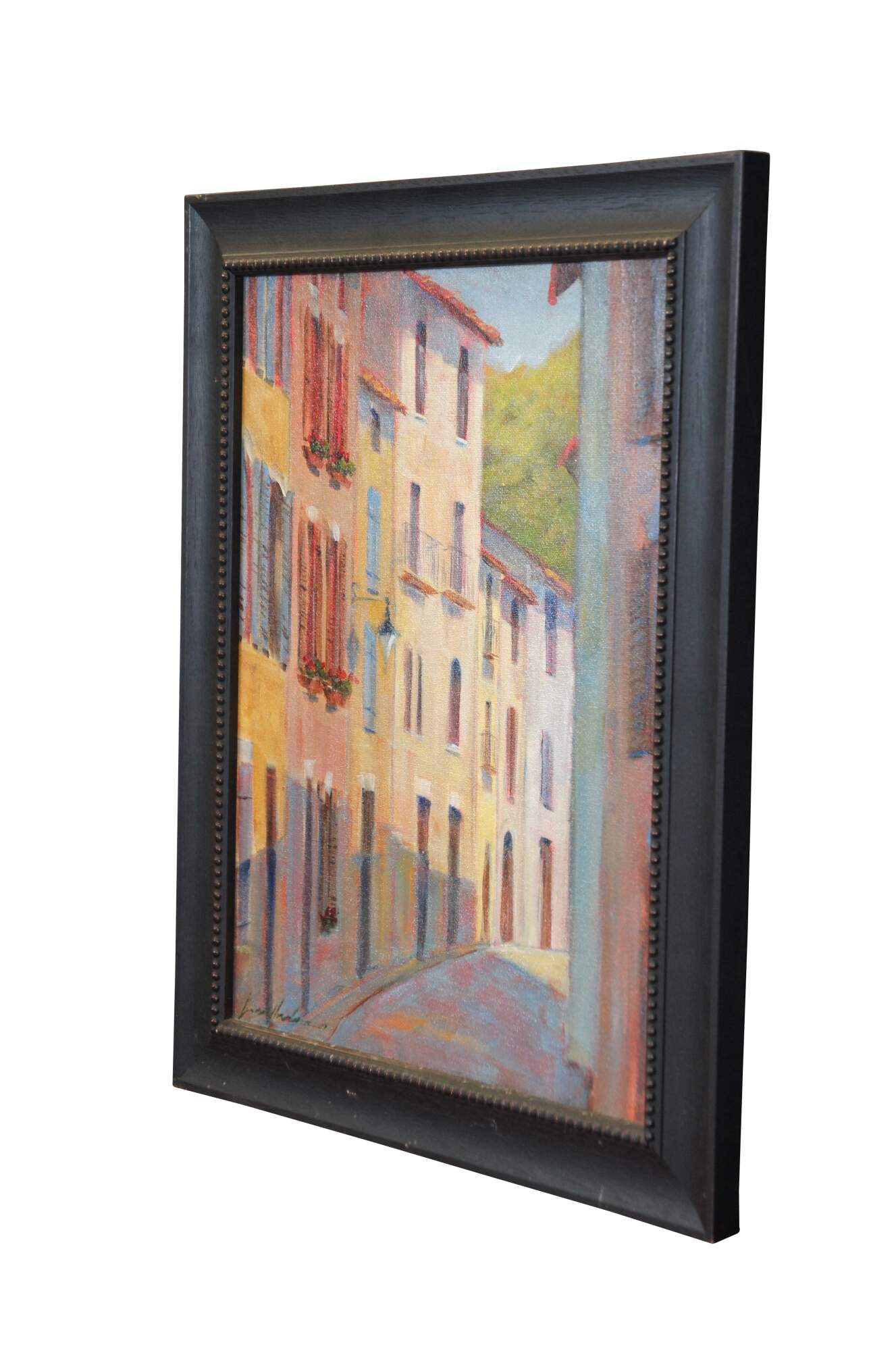 Late 20th century oil on canvas cityscape painting showing a quiet Mediterranean style city street with white buildings and red tile roofs. Illegible signature in lower left corner. Blavk beveled wood frame with beaded border.