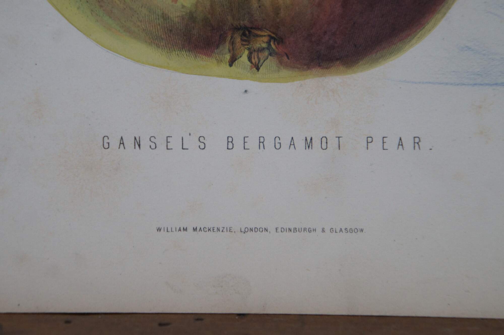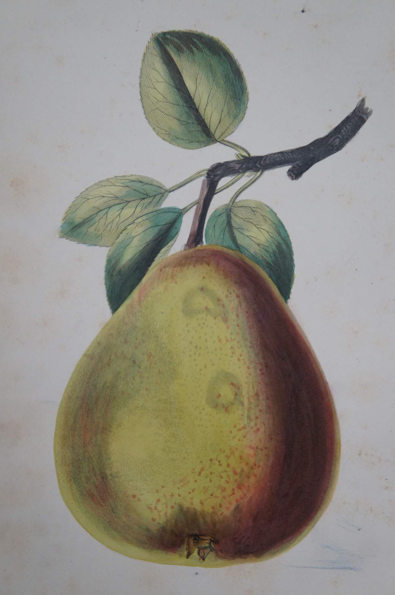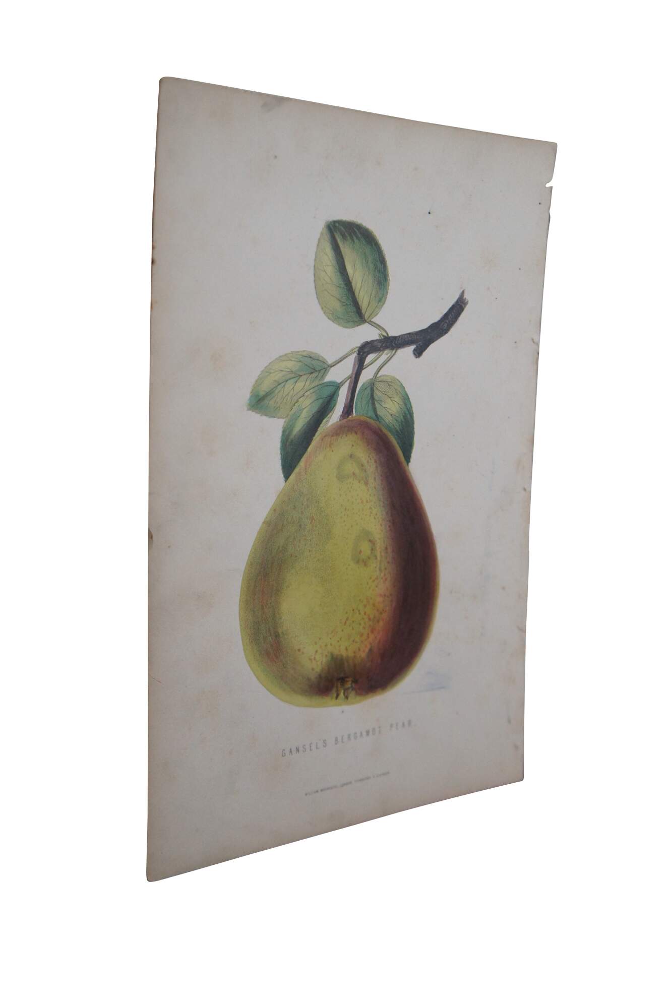 Late 19th century hand colored horticulture engraving of a yellow and red Gansel's Bergamot Pear on a branch, a plate taken from a volume published by William Mackenzie circa 1874.