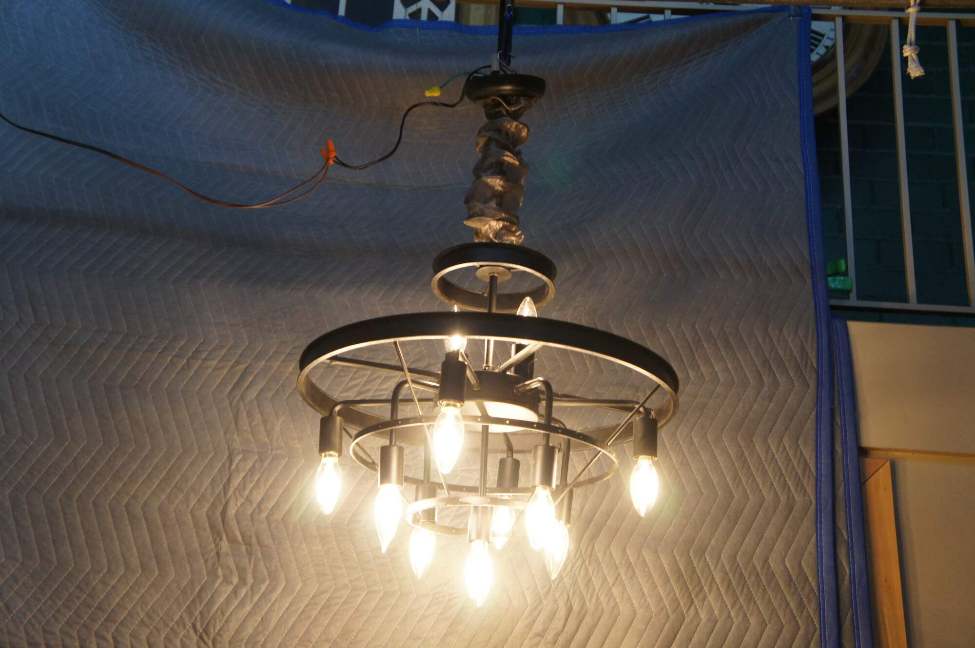 Charming modern chandelier with round tiered design featuring 9 downlights and two uplights along the top.