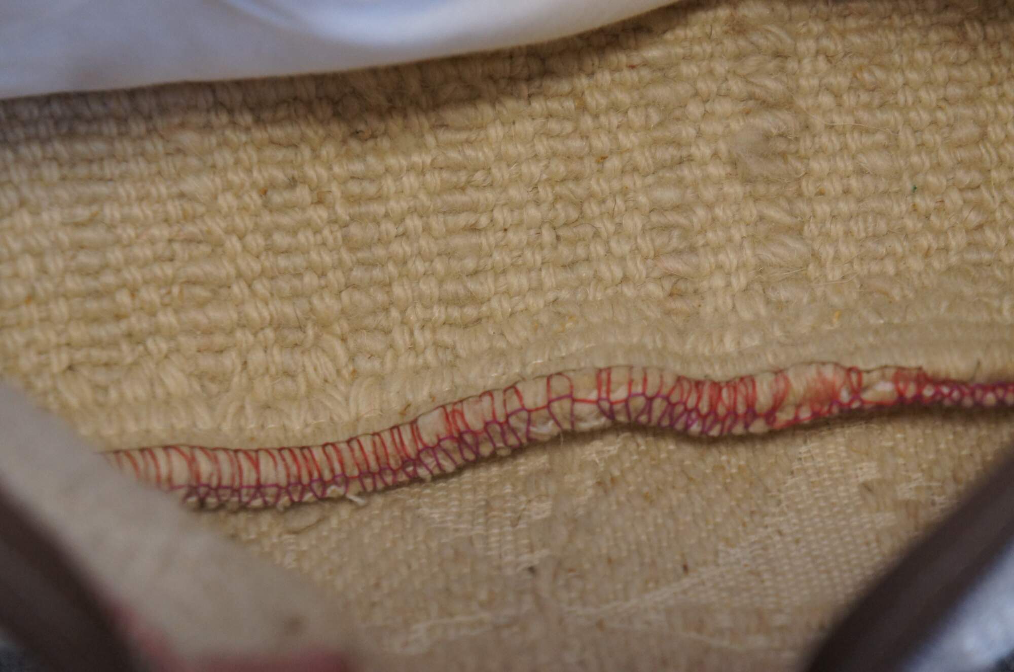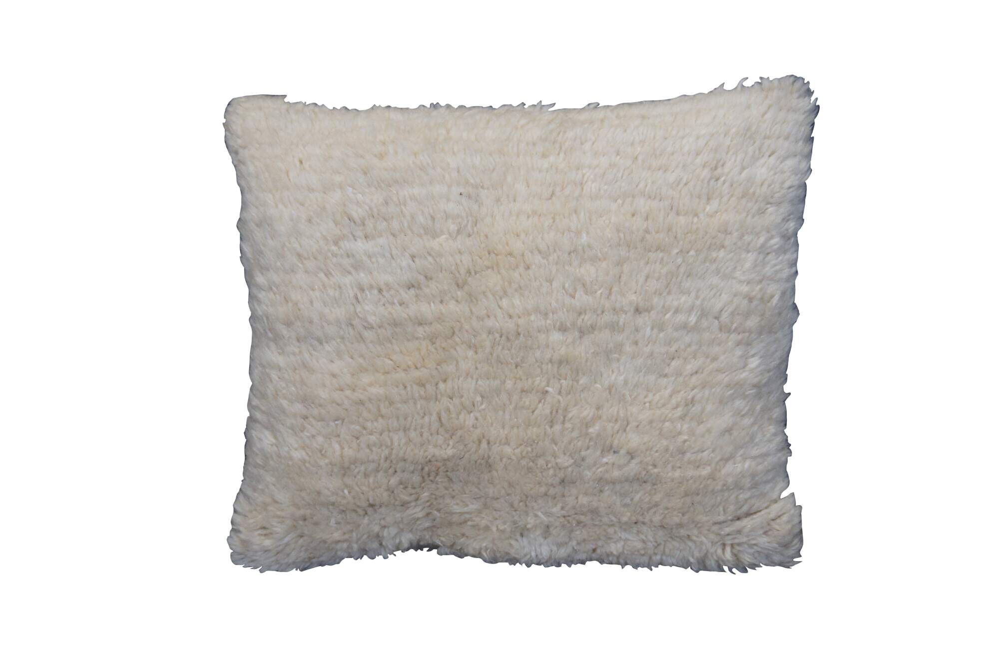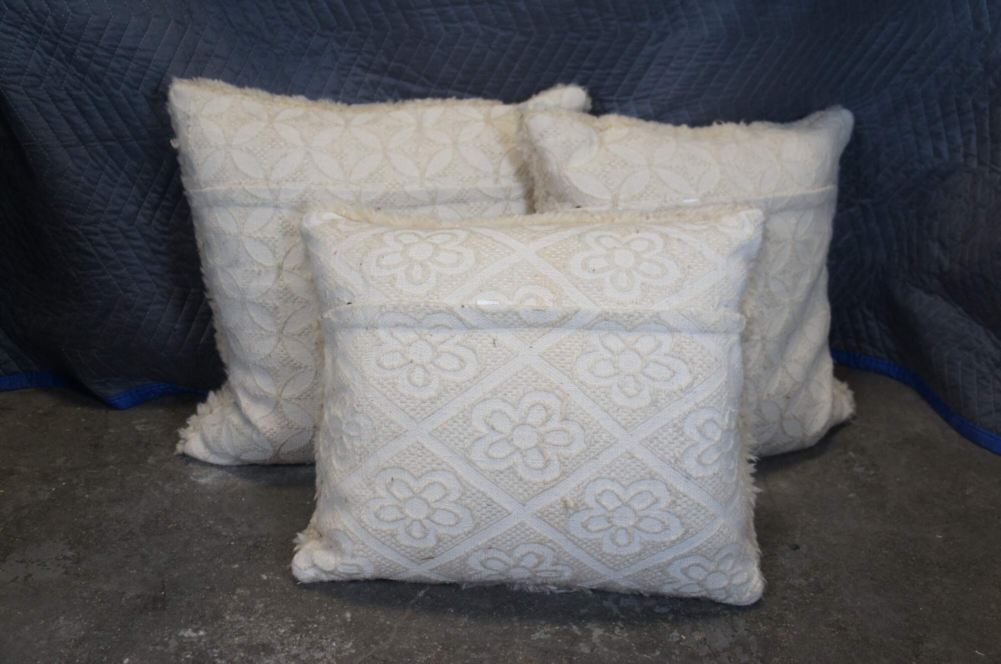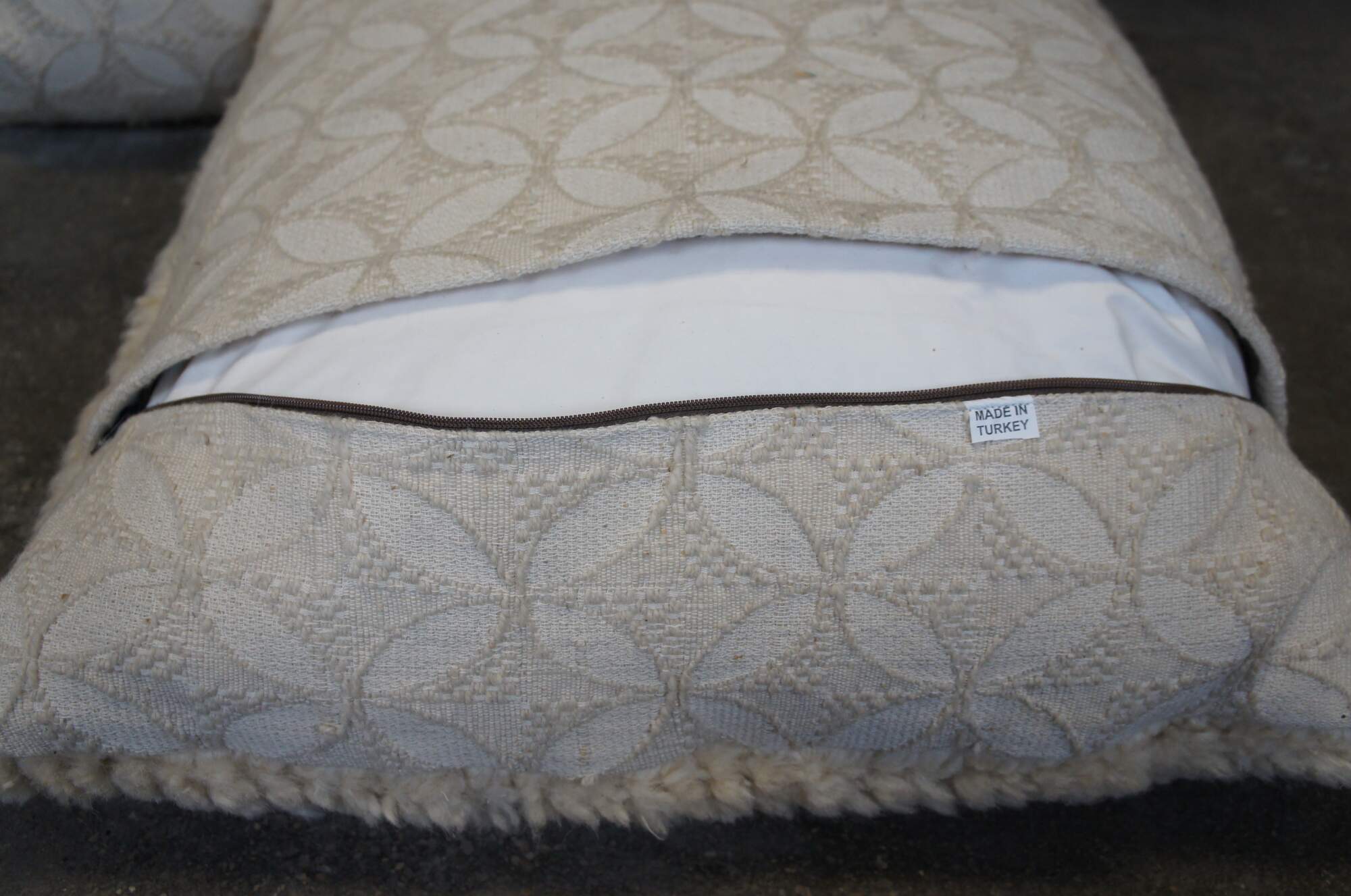 Set of 3 late 20th century white wool kilim / tulu accent pillows, with fuzzy fronts and floral / geometric embroidered backs. Down / white duck feather filled. Zipper closure. Made in Turkey.