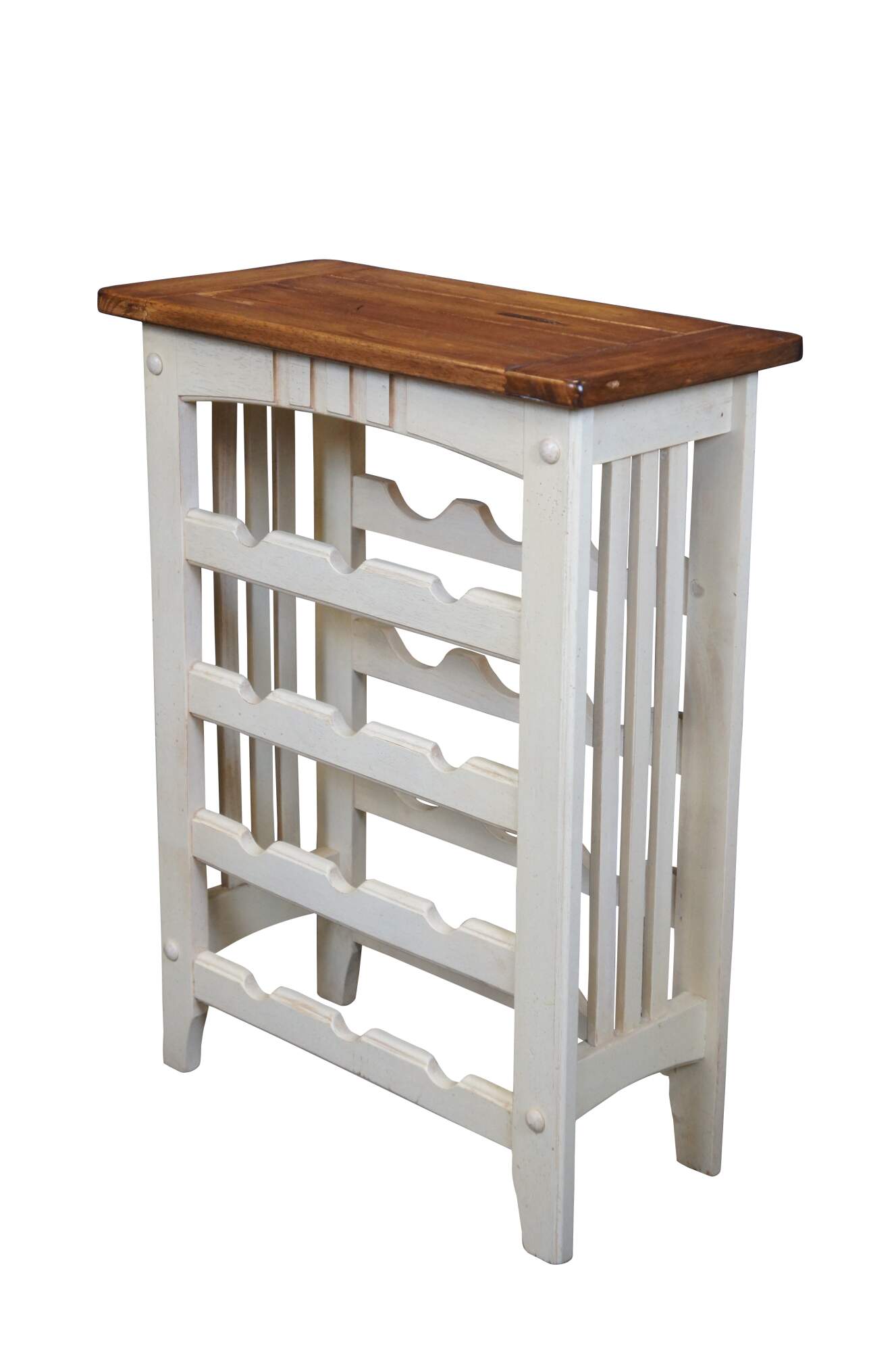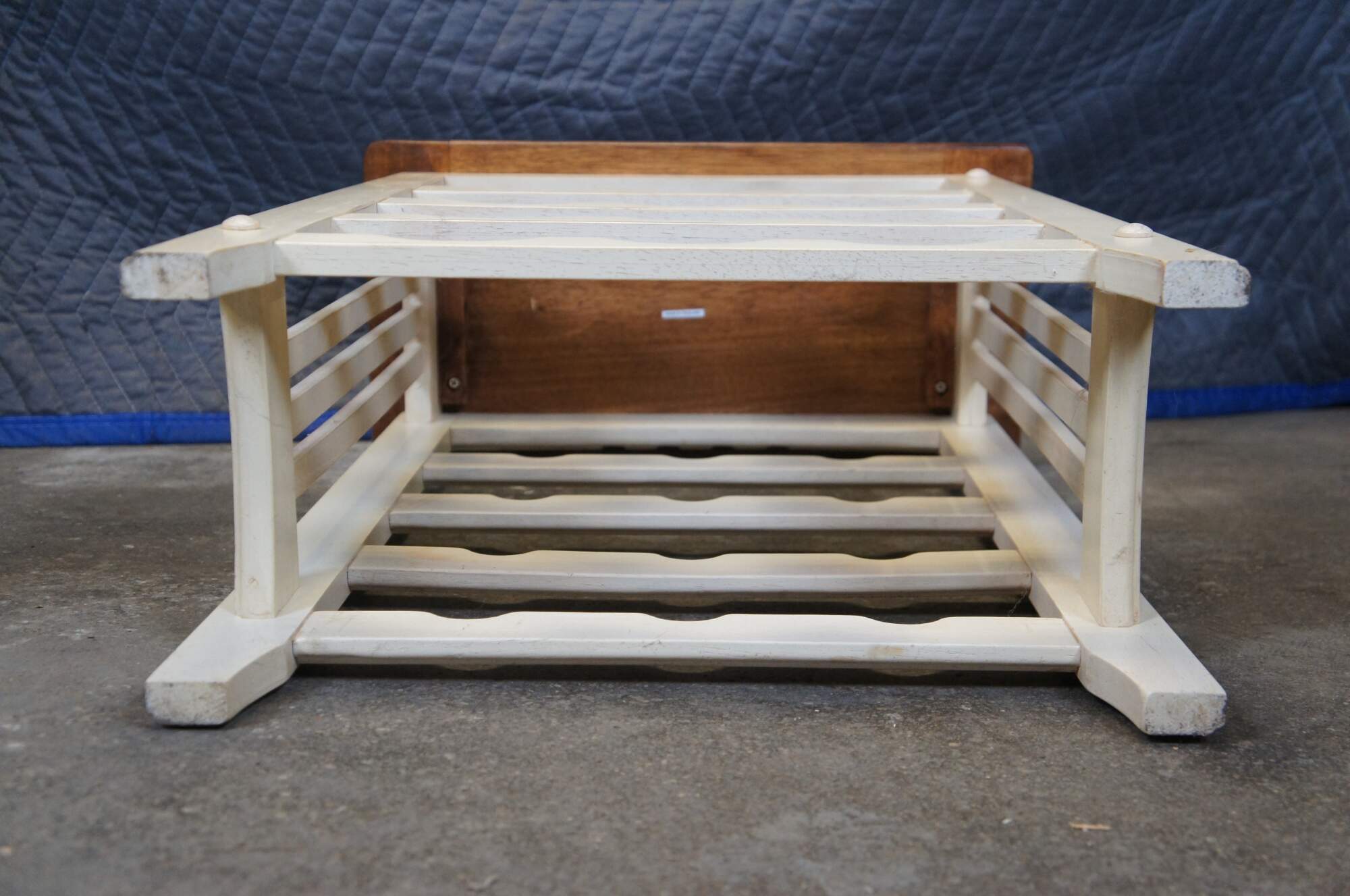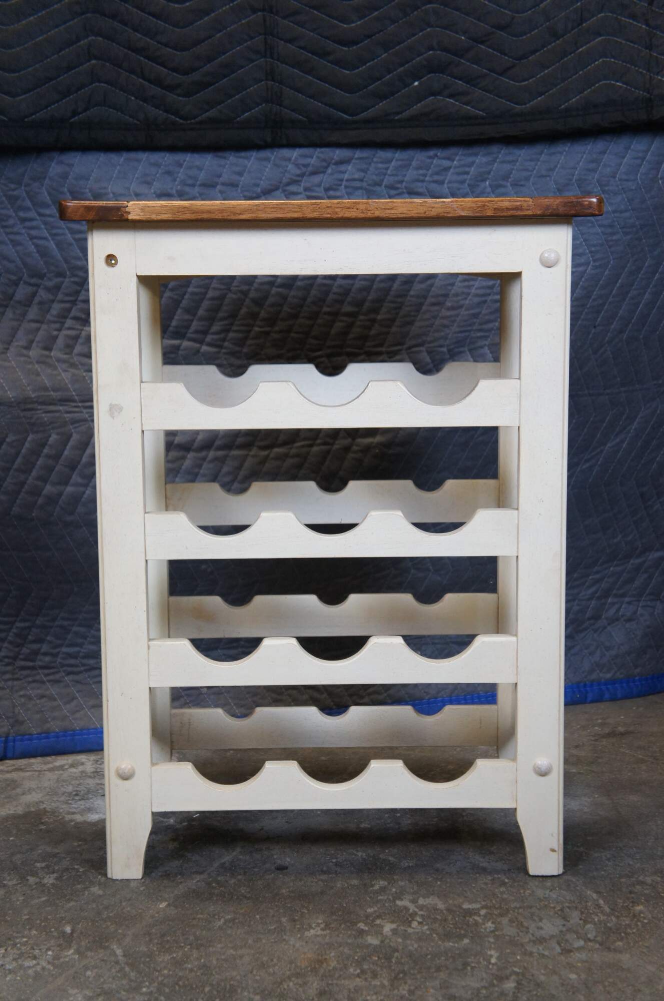 Late 20th century wooden wine bottle rack / holder with capcity for 12 bottles. White painted base with wood tone top for serving. Made in Thailand.