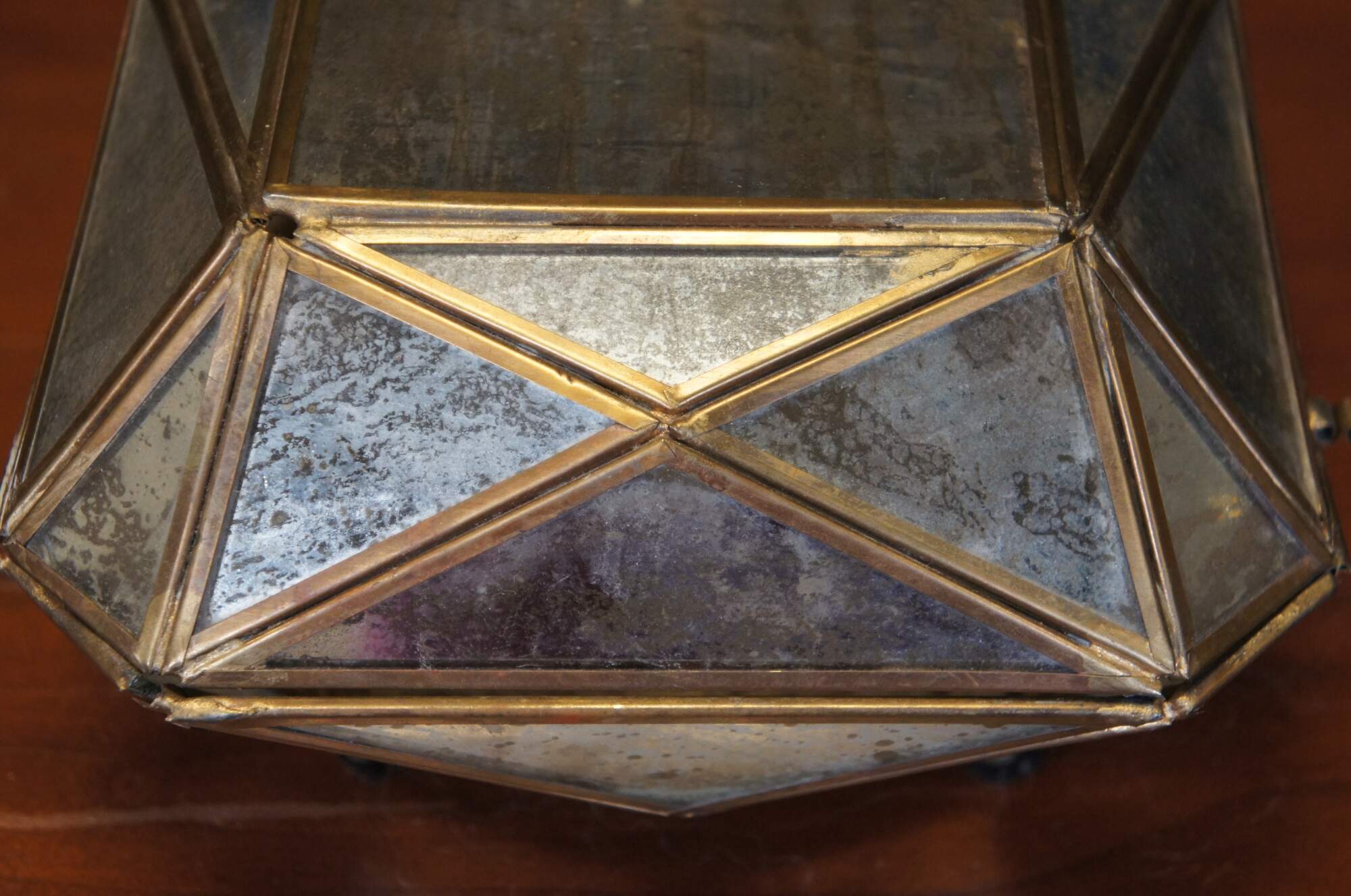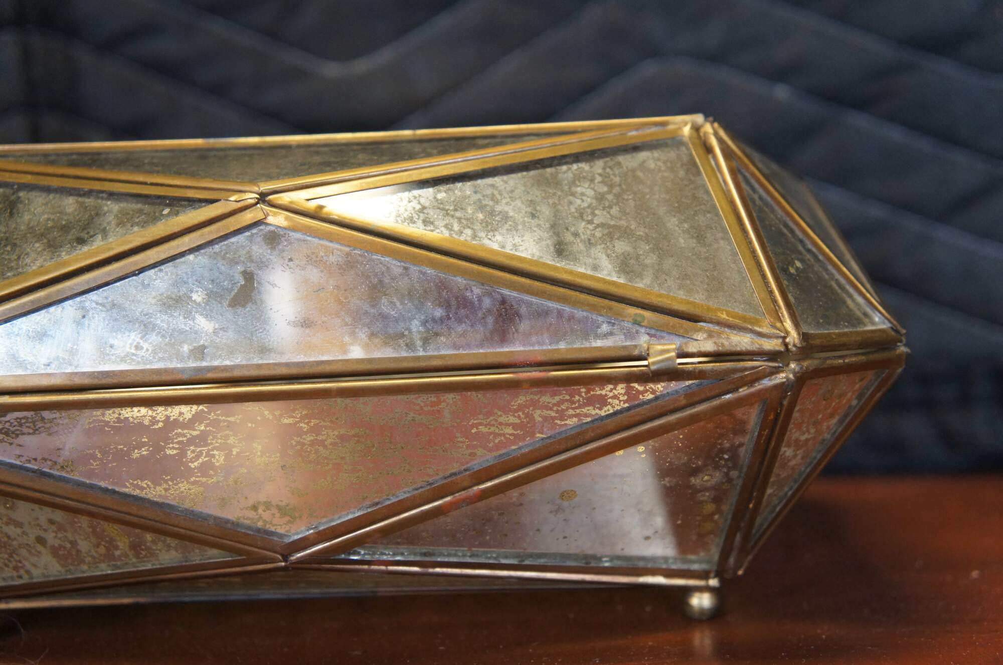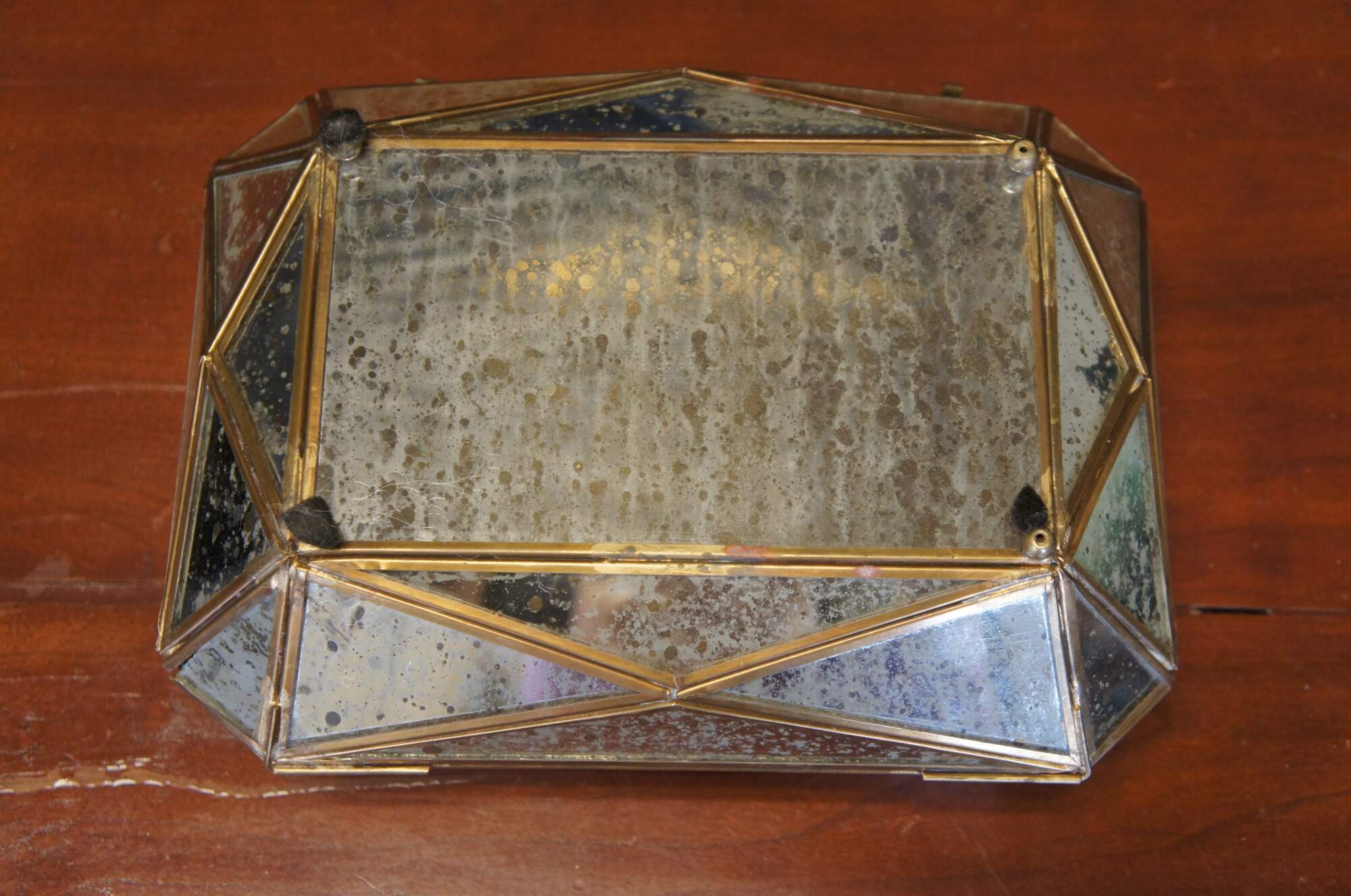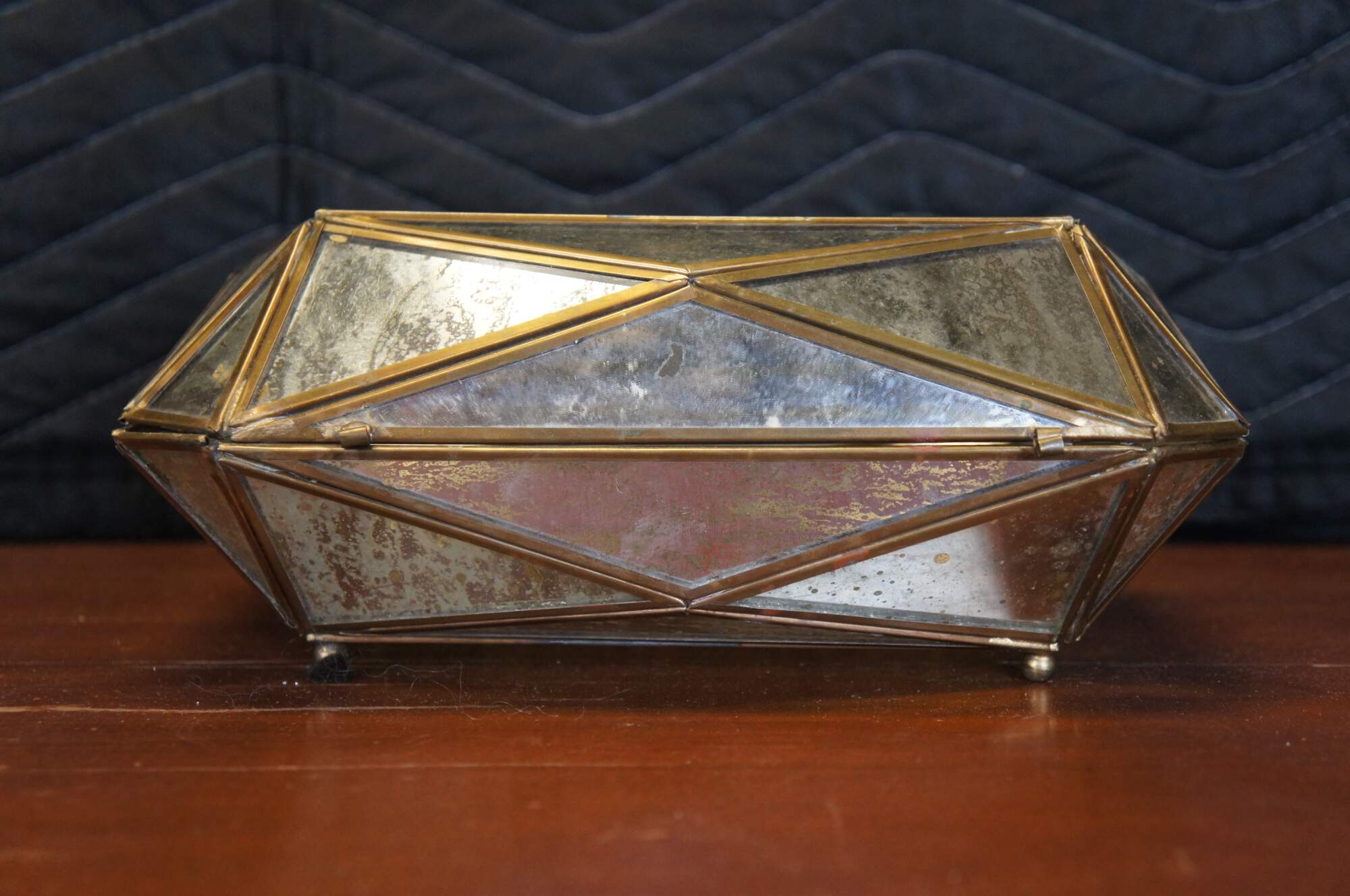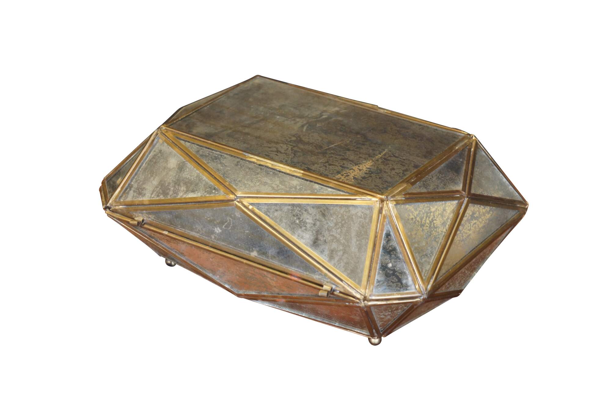 Late 20th century Diamond #2 jewelry / trinket box by Aidan Gray. Multi-faceted geometric form with a brass frame holding gold flecked mirrored glass panels. Item number: AIDAN-D349. Discontinued.