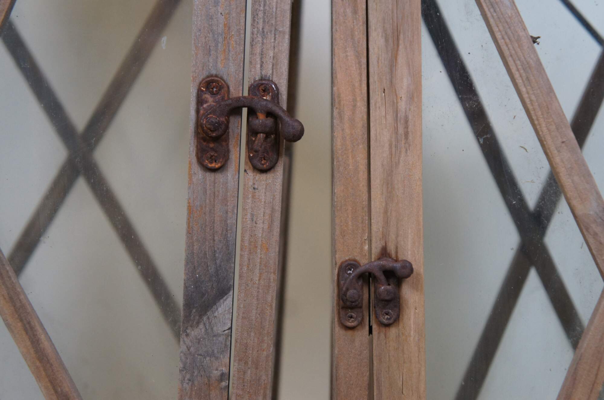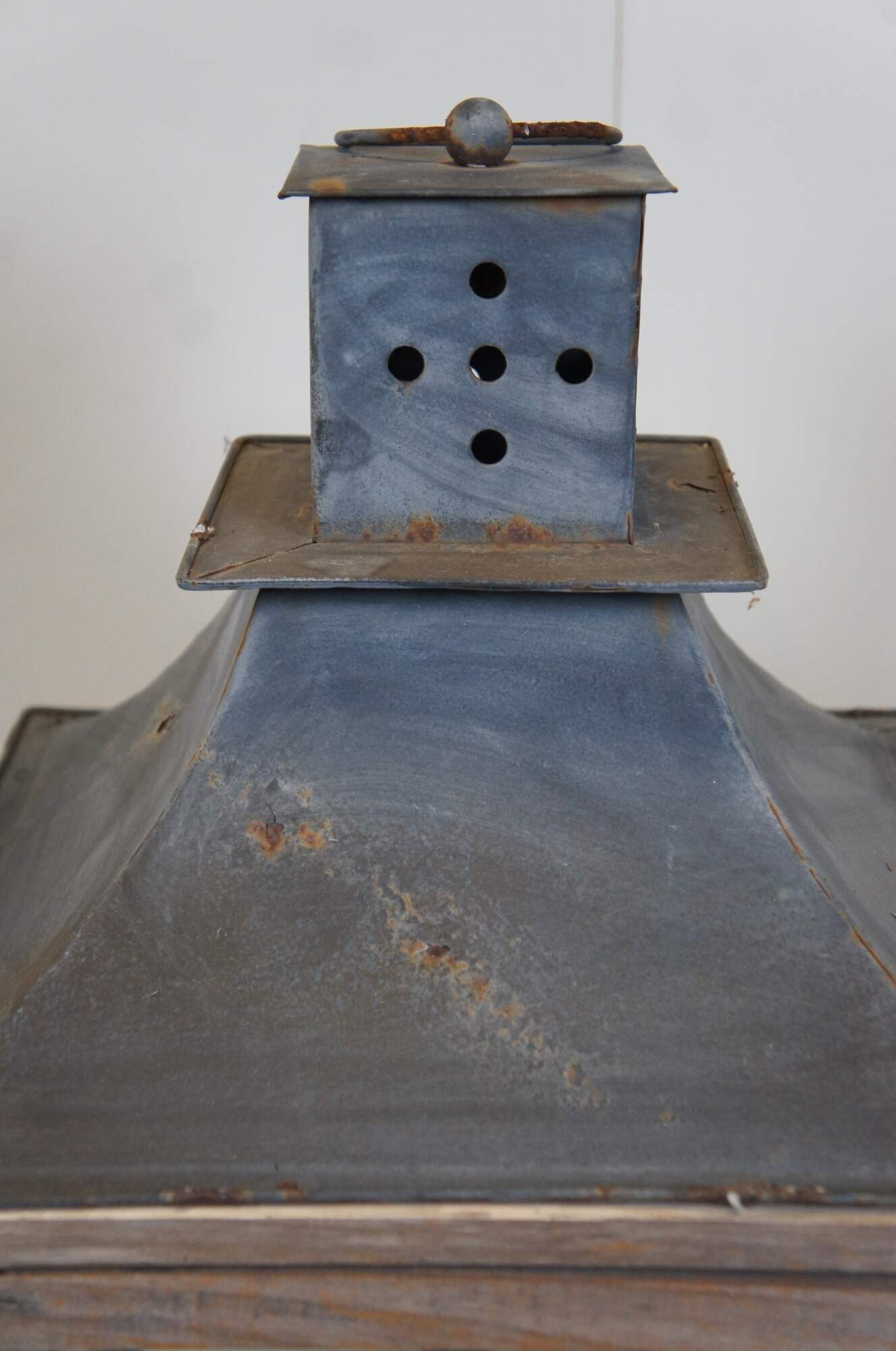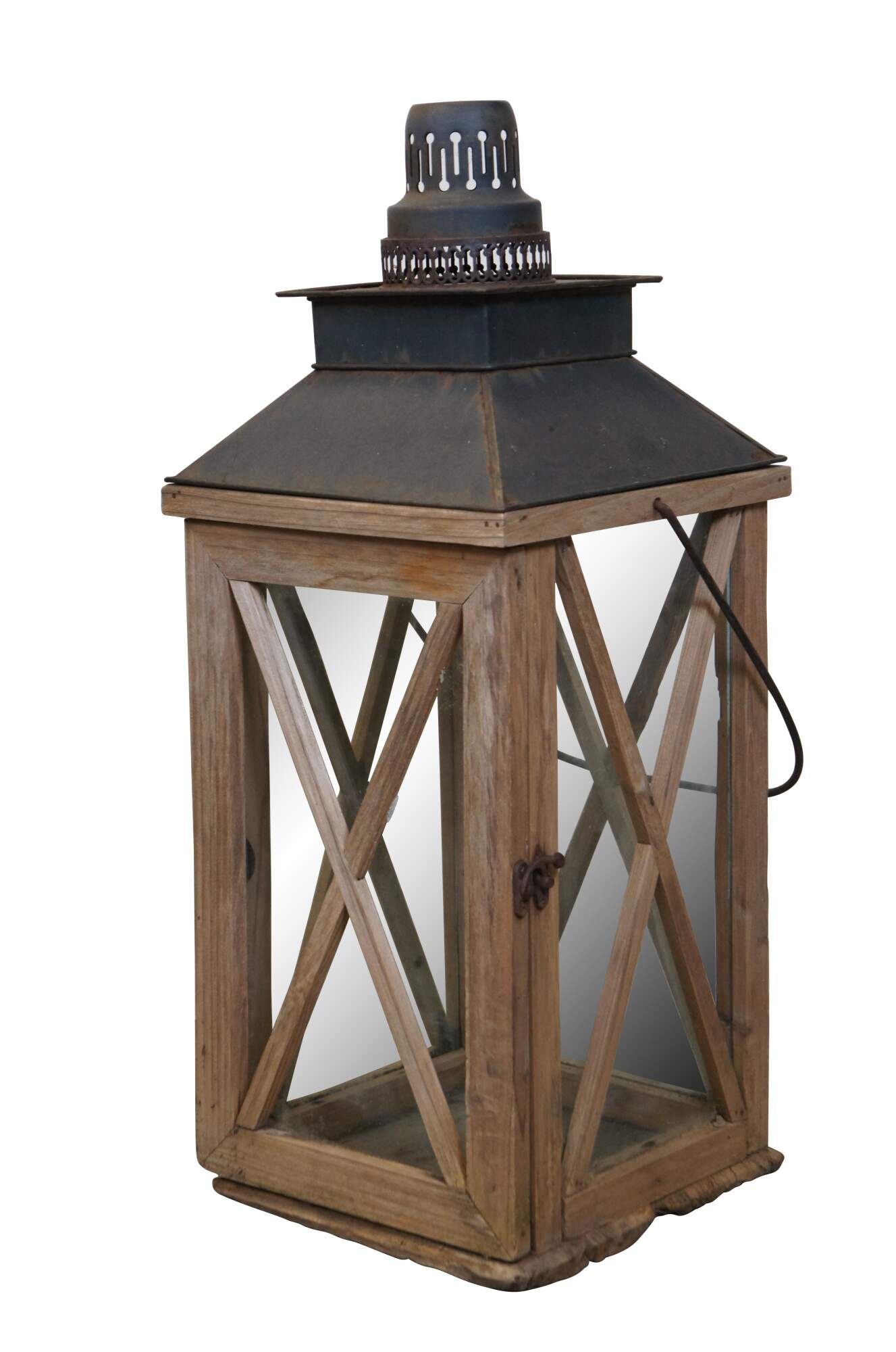 Pair of late 20th century indoor / outdoor rustic oversized candle holding lanterns featuring primitive wood frames and crossbars over the glass sides and sloped tin tops with rotating handles.