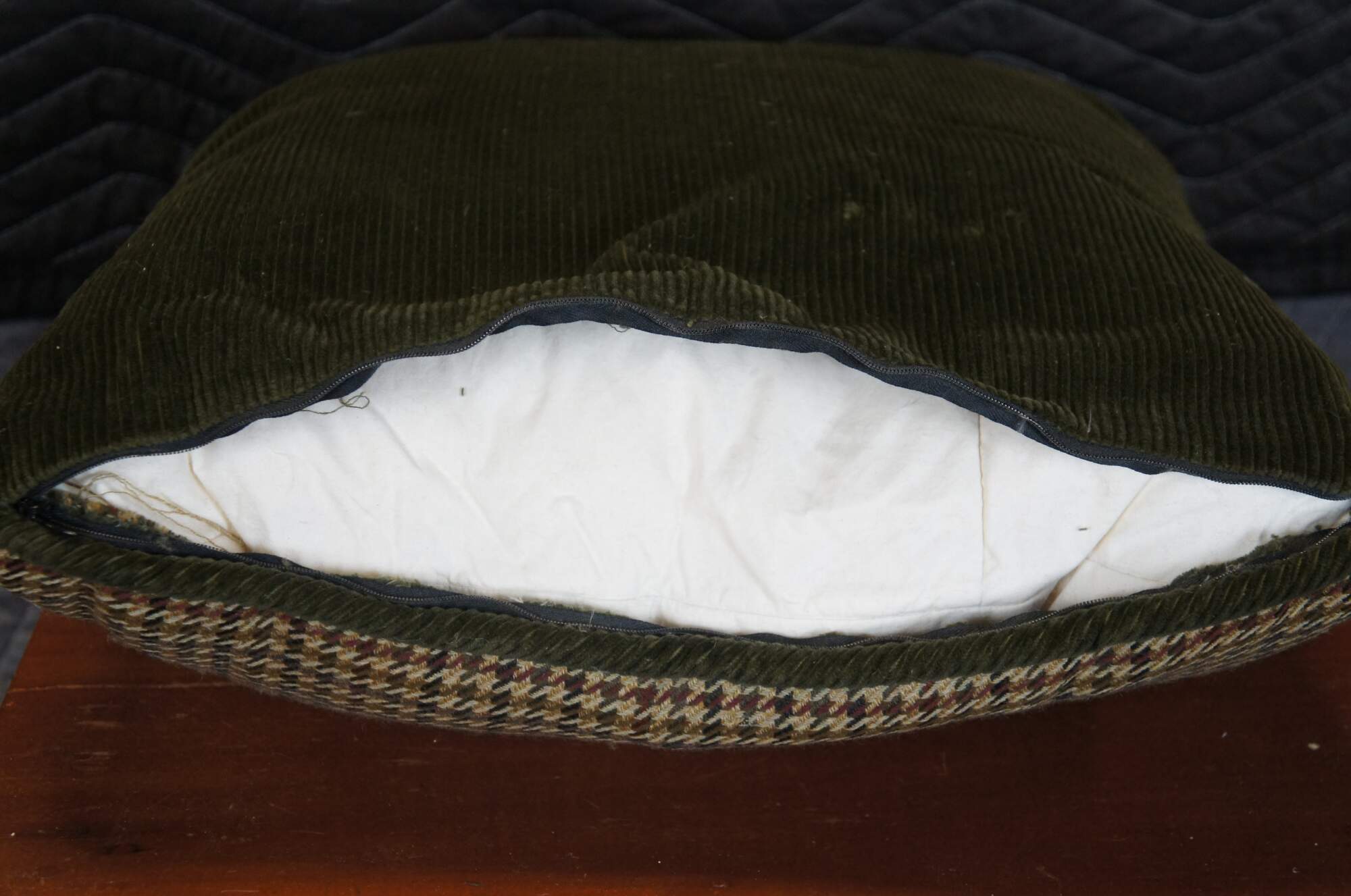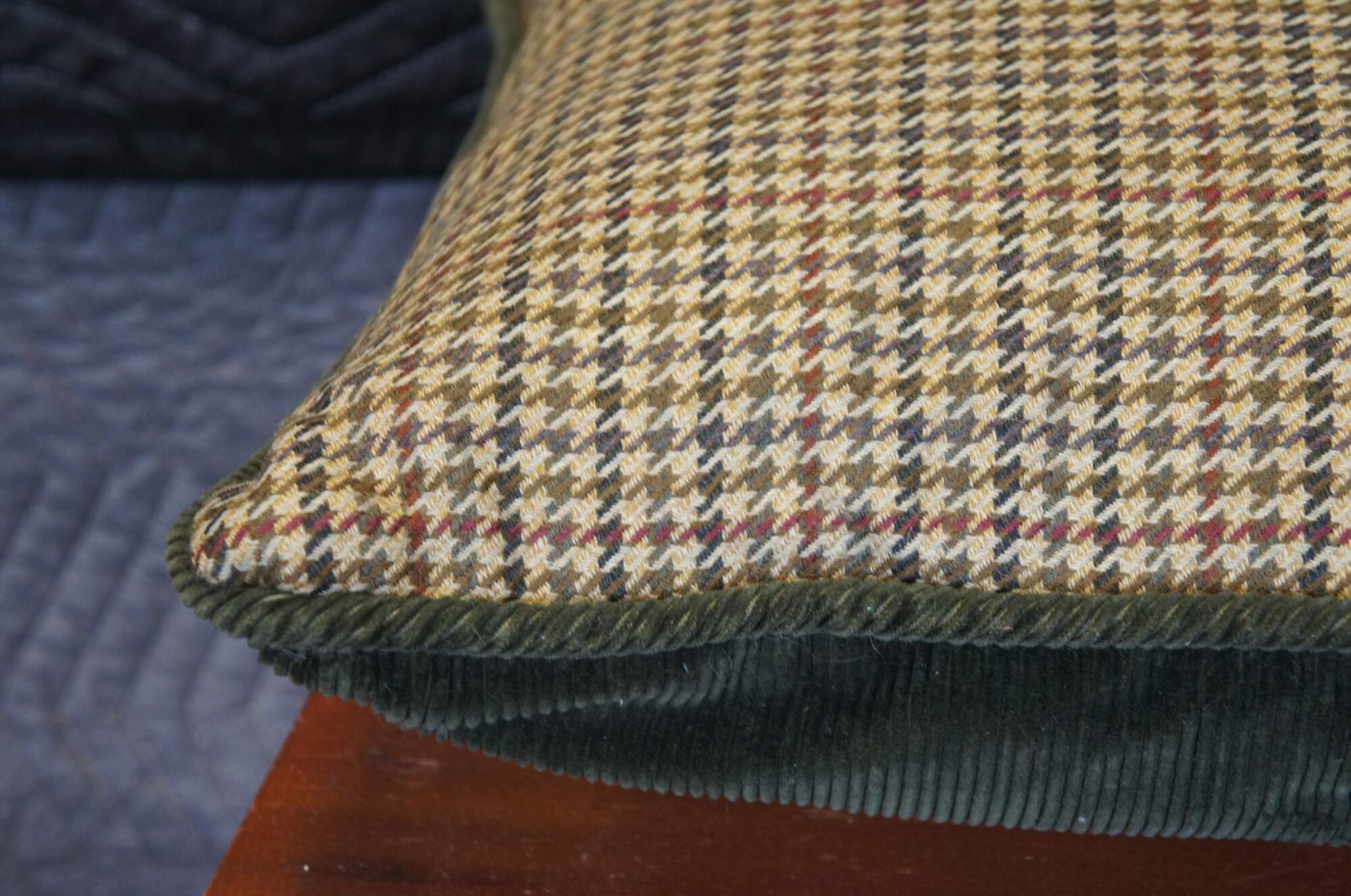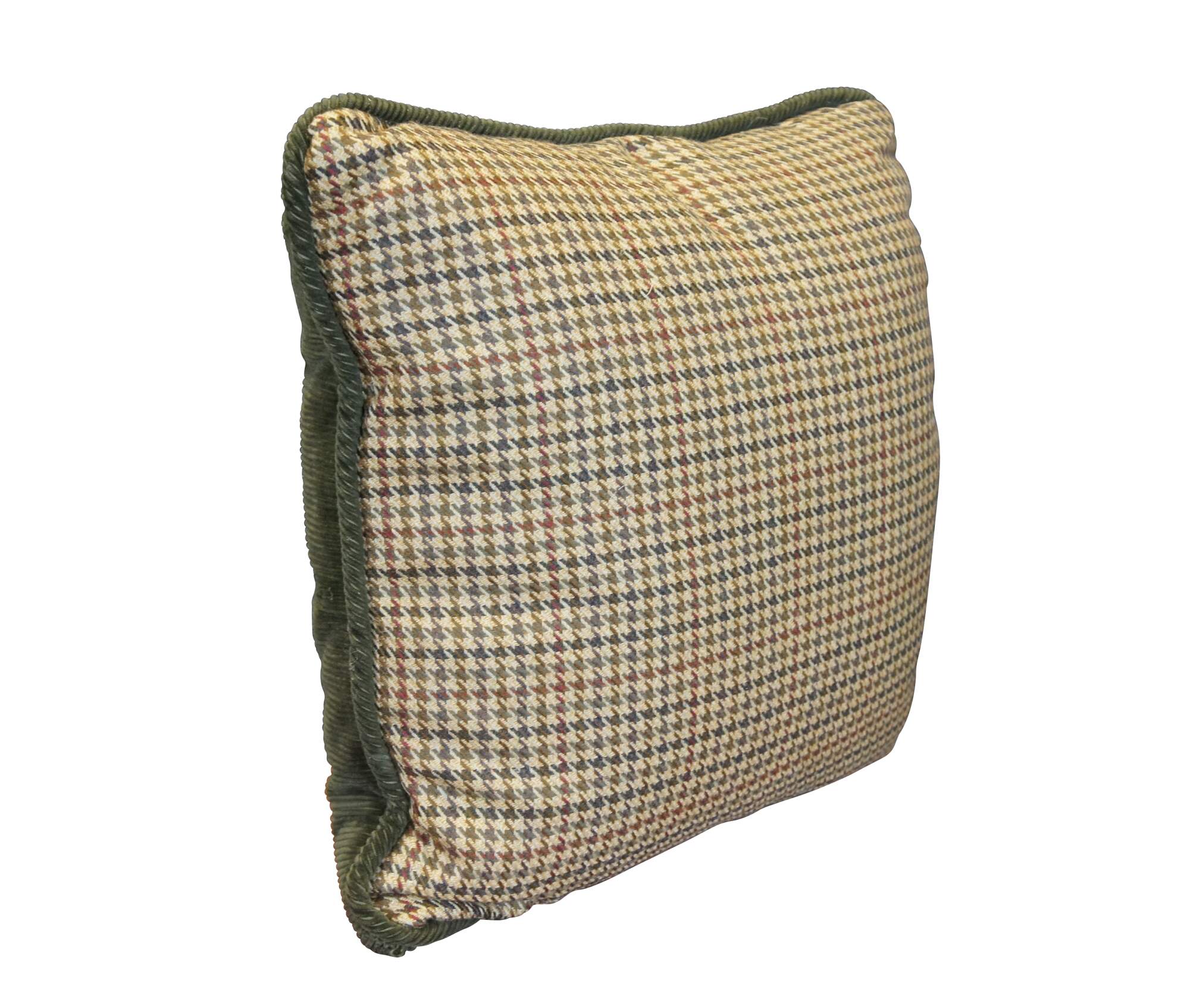 Late 20th century down filled square throw / accent pillow, houdnstooth tween in beige, gray, olive green, and red front with olive green courderoy back and piping. Zipper closure.
