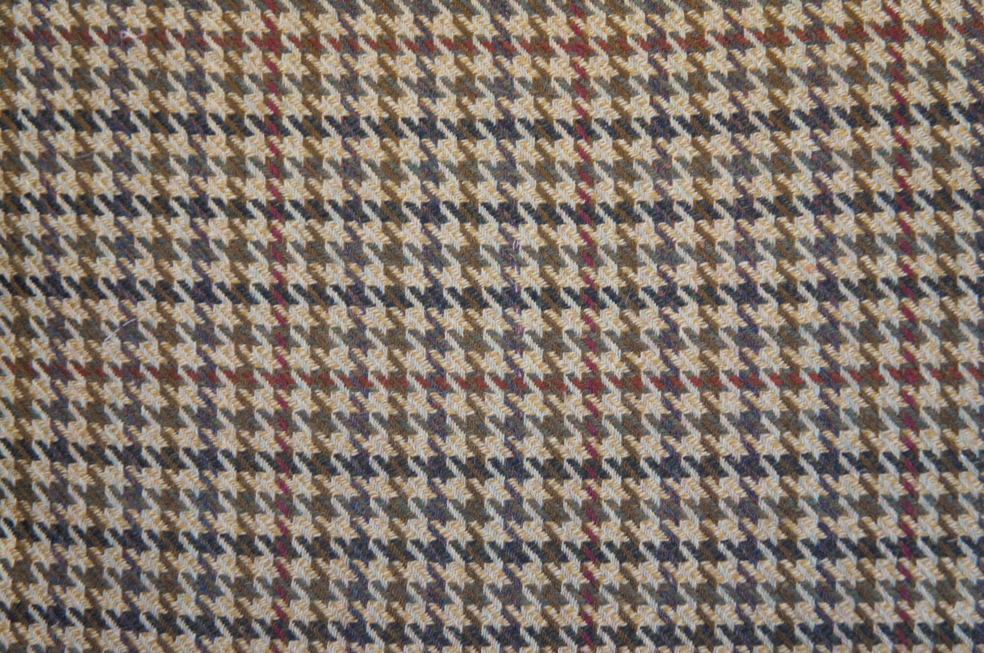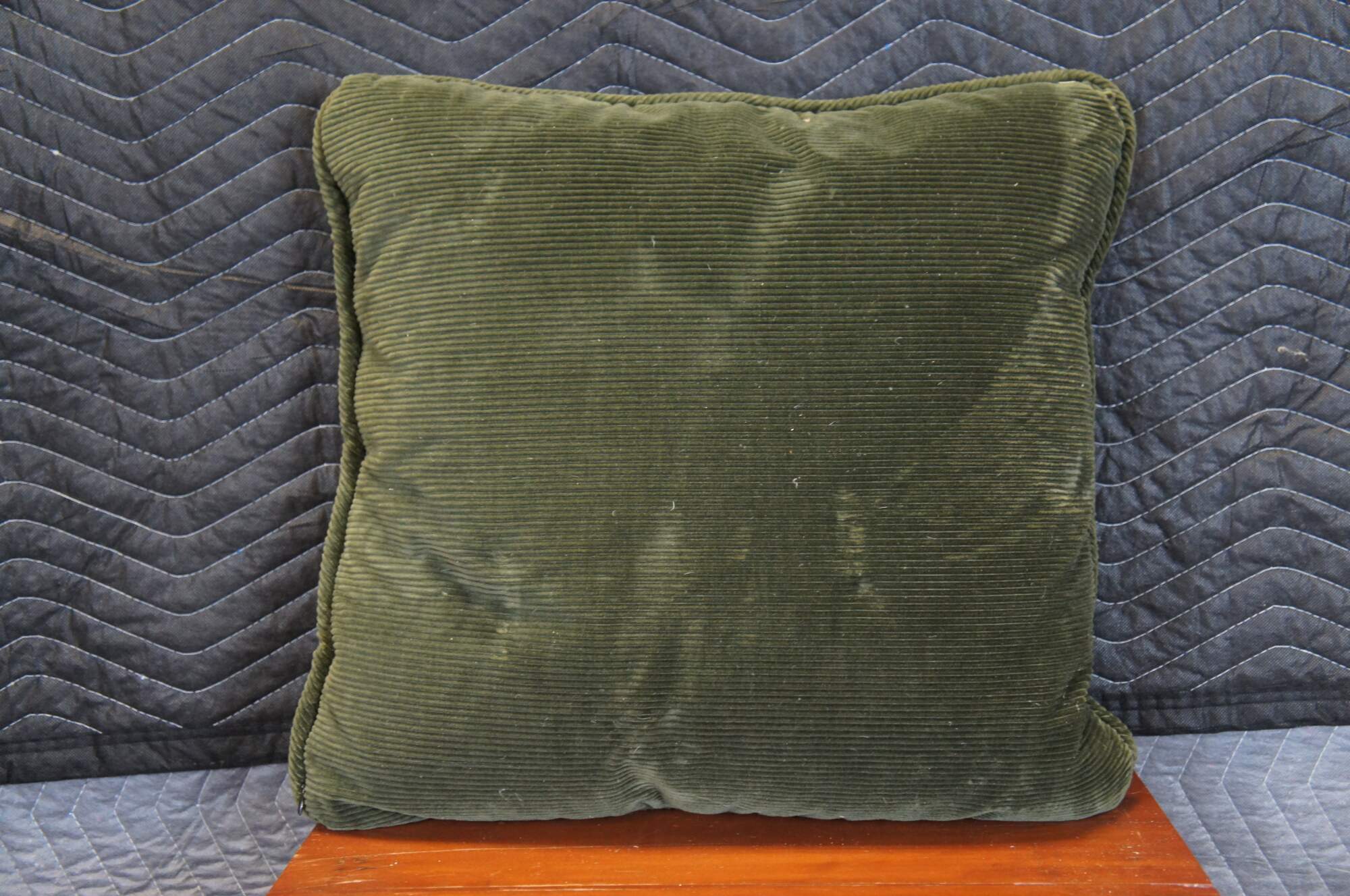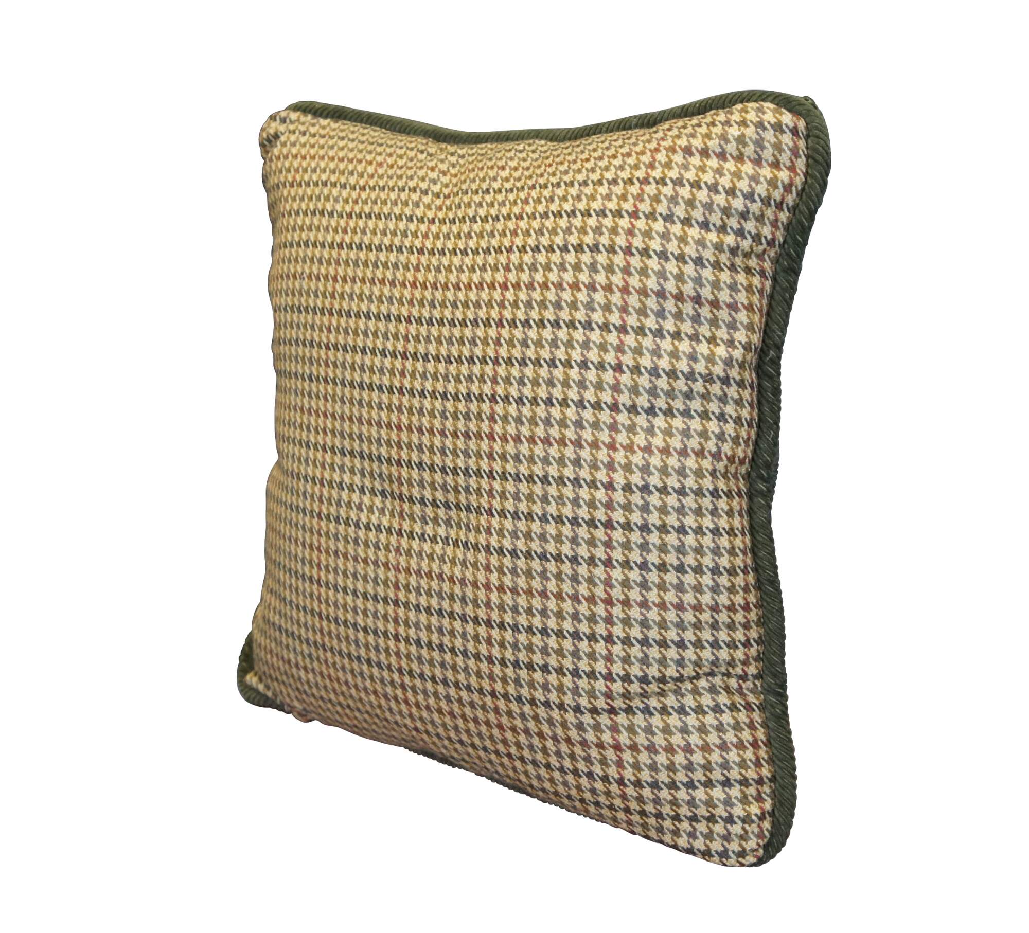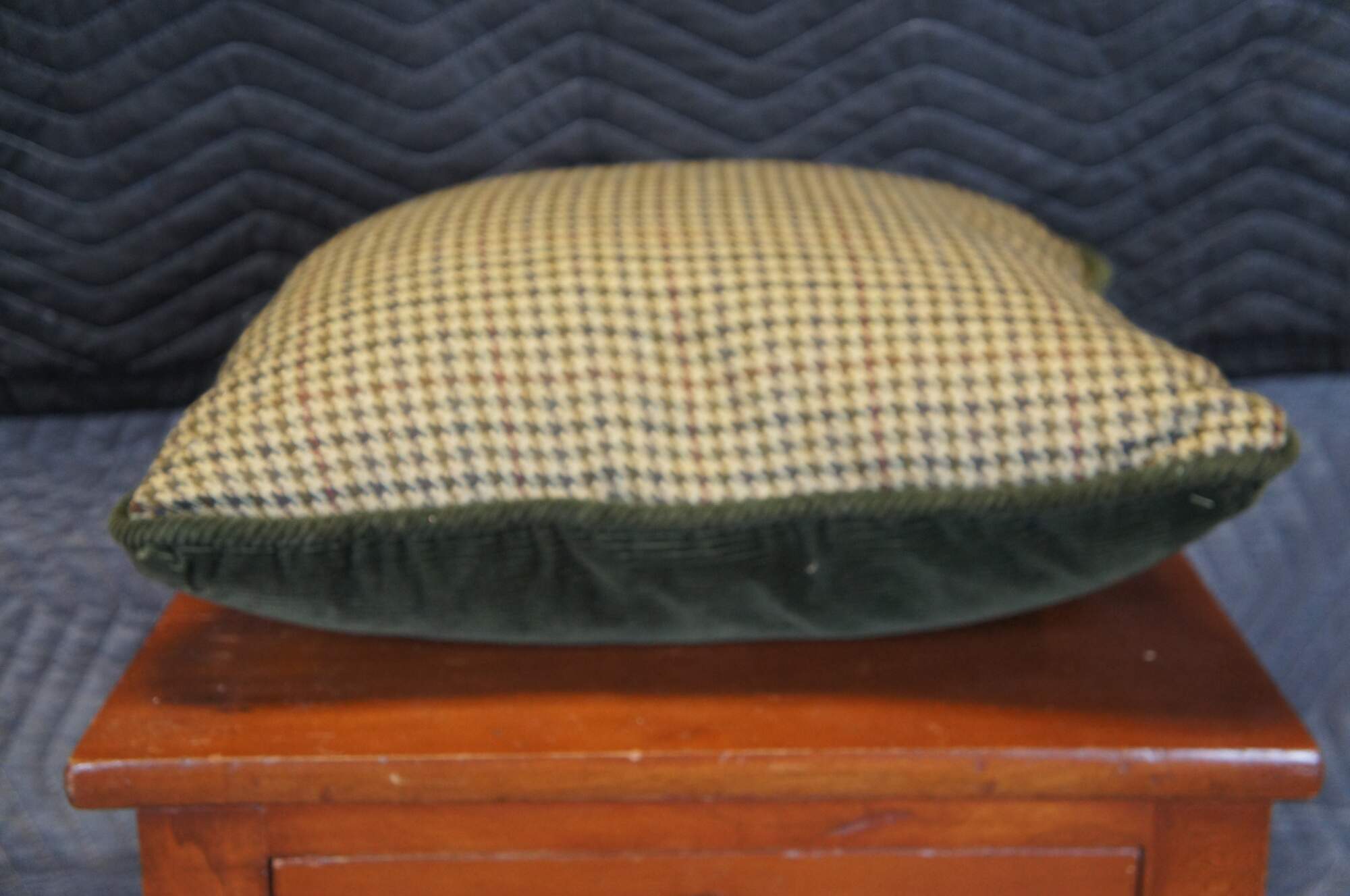 Late 20th century down filled square throw / accent pillow, houdnstooth tween in beige, gray, olive green, and red front with olive green courderoy back and piping. Zipper closure.