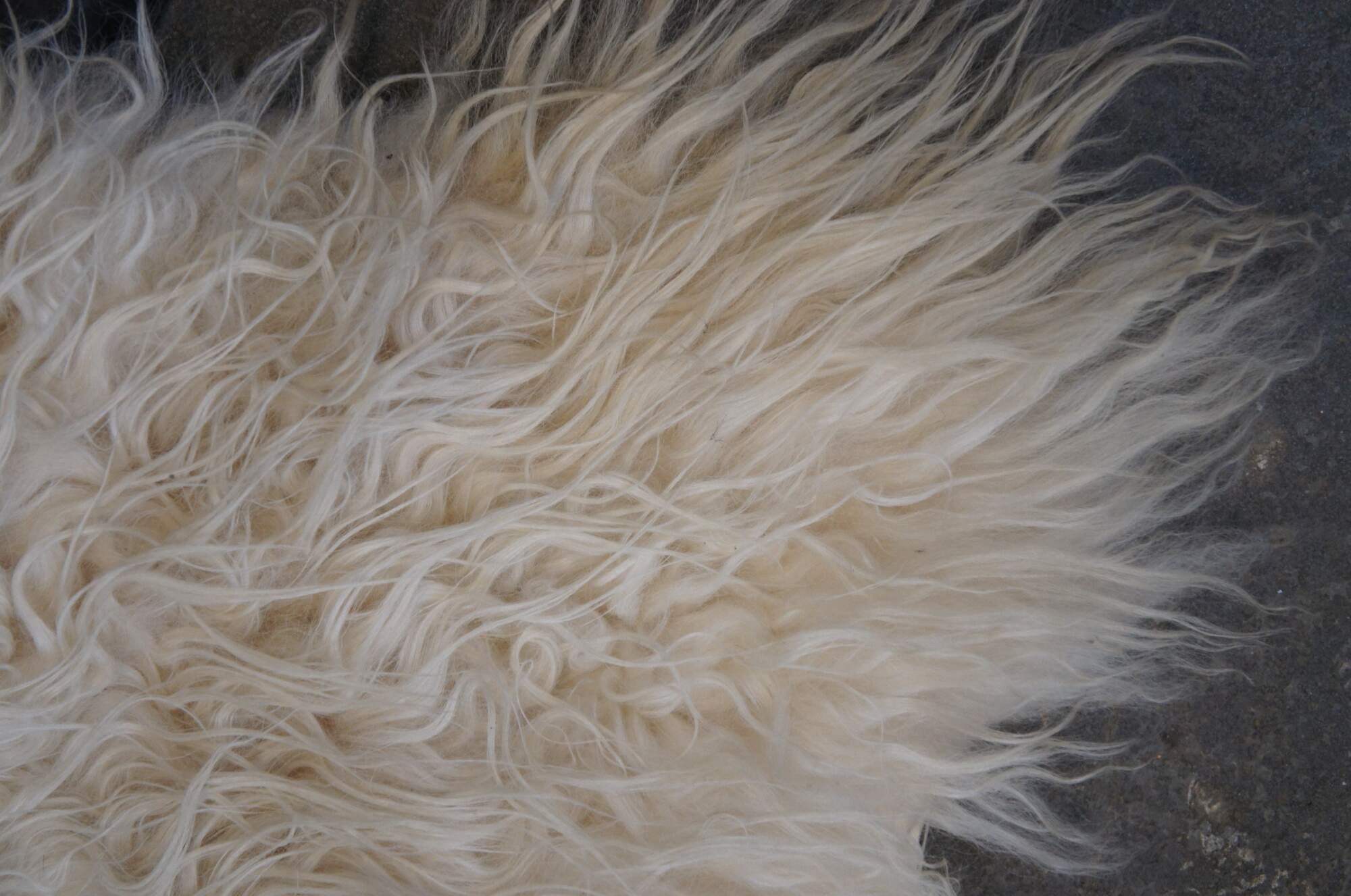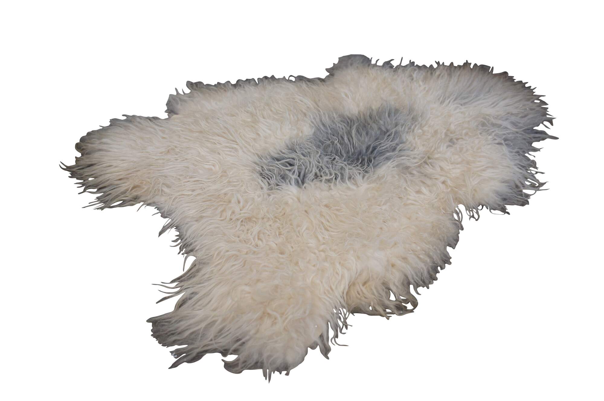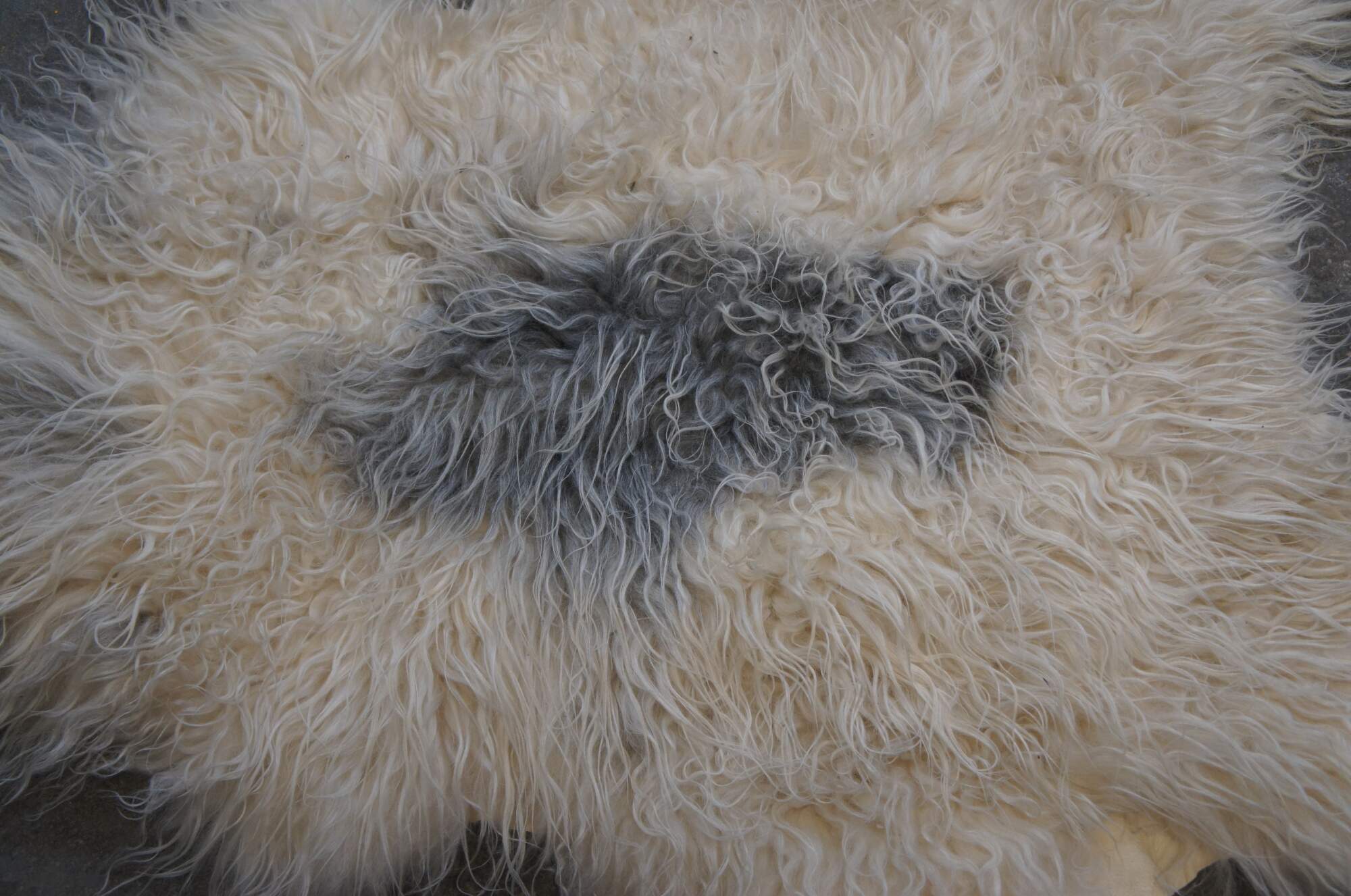 Late 20th century Eco Products Icelandic sheepskin rug - white long-haired / curly sheep hide with large gray spot at the center. Sueded back.