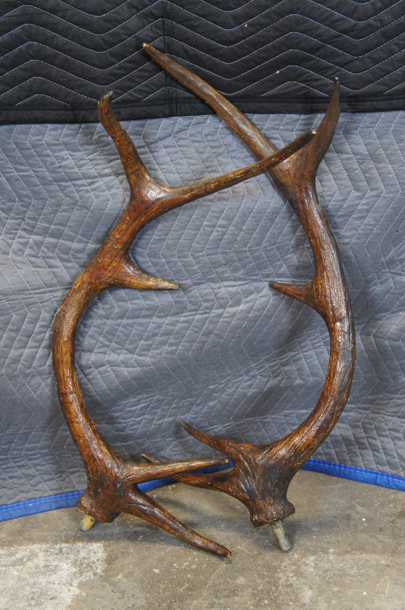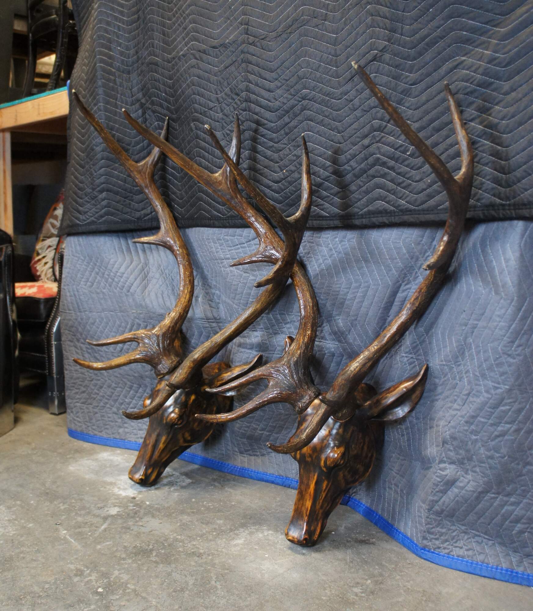 Pair of late 20th century wall hanging faux taxidermy deer / buck head sculptures with long antlers. Made of resin and painted to resemble carved wood.