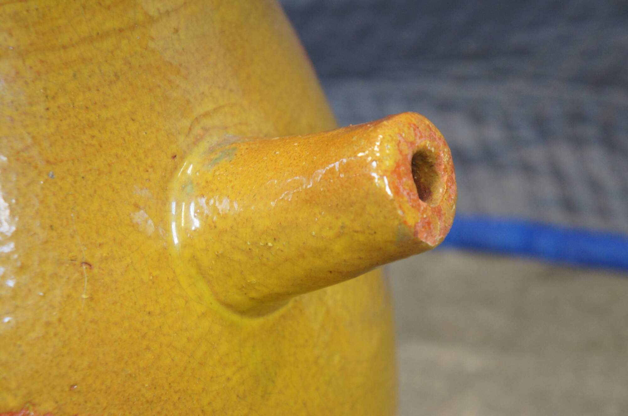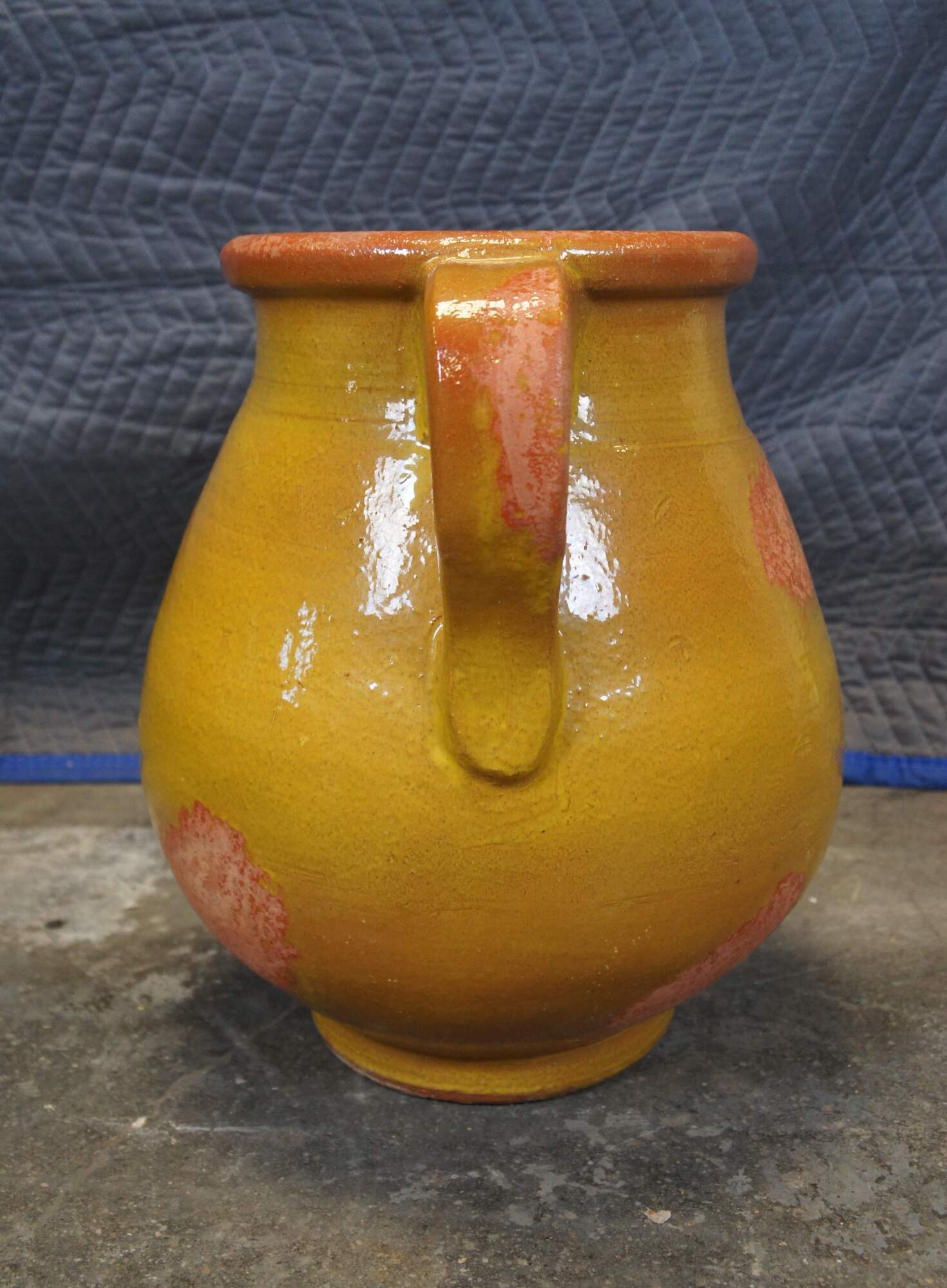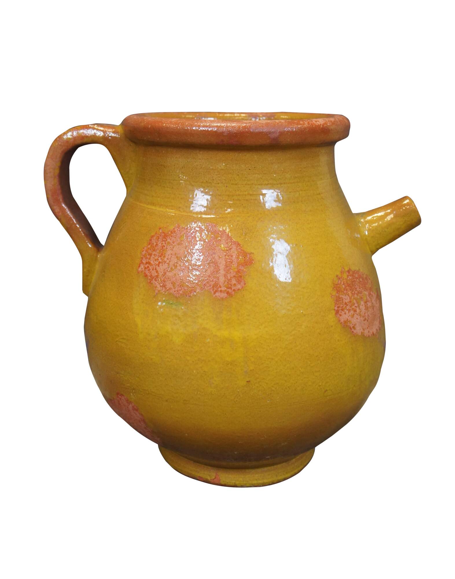 Antique French handcrafted terra cotta olive oil jar / water jug featuring a round shape with footed base, molded rim, large handle, narrow spout, finished in a yellow glaze with orange accents.