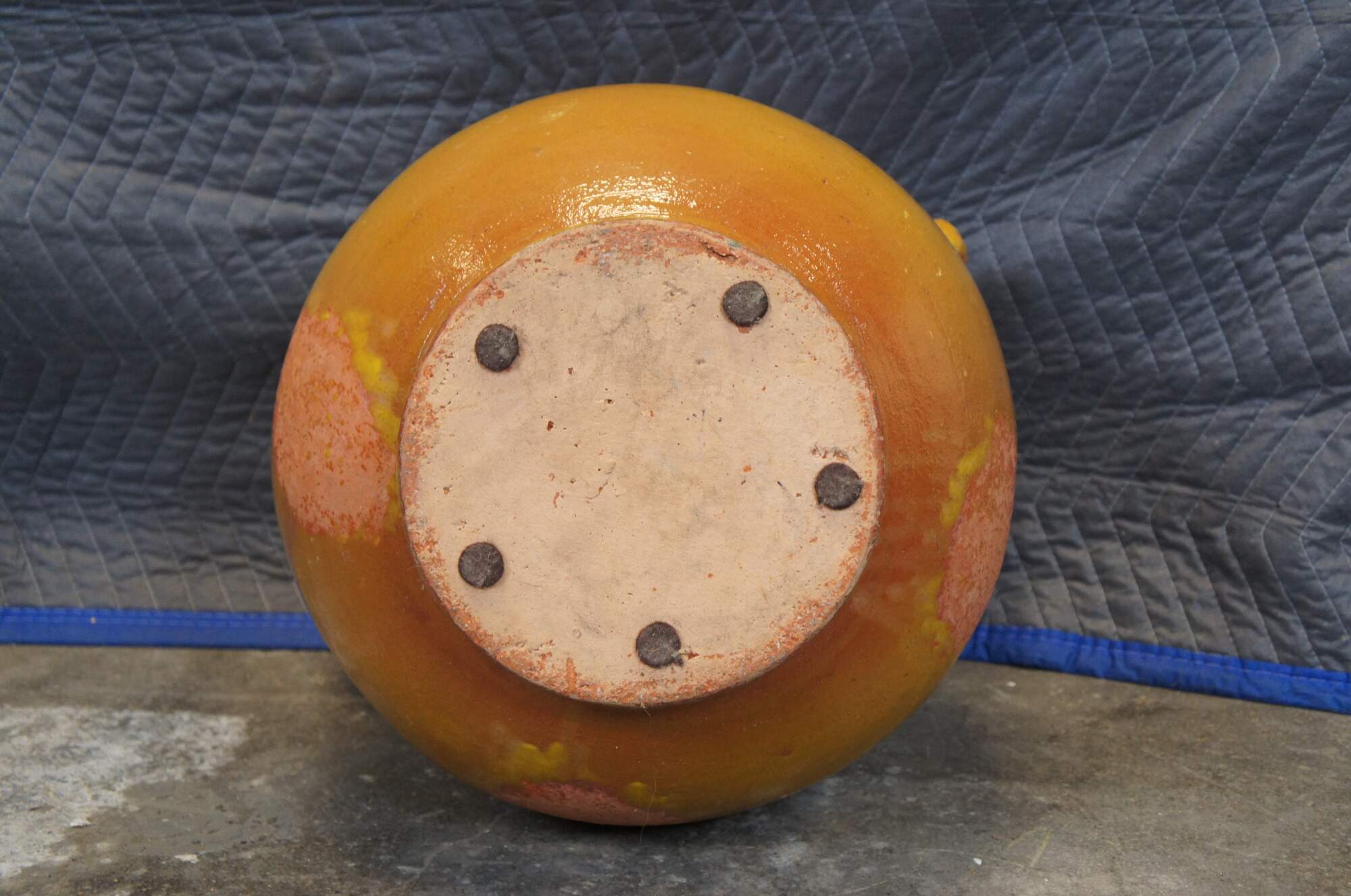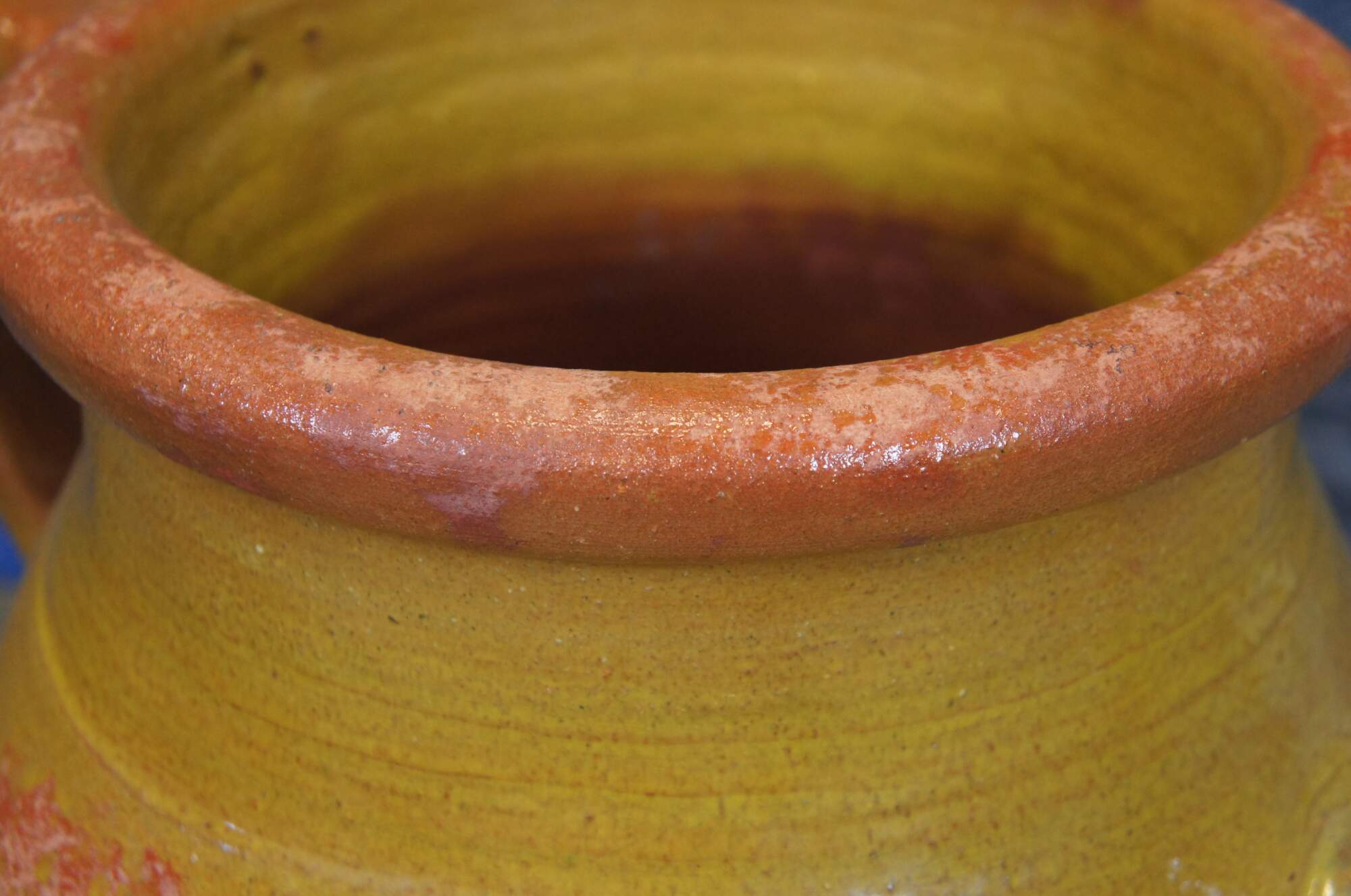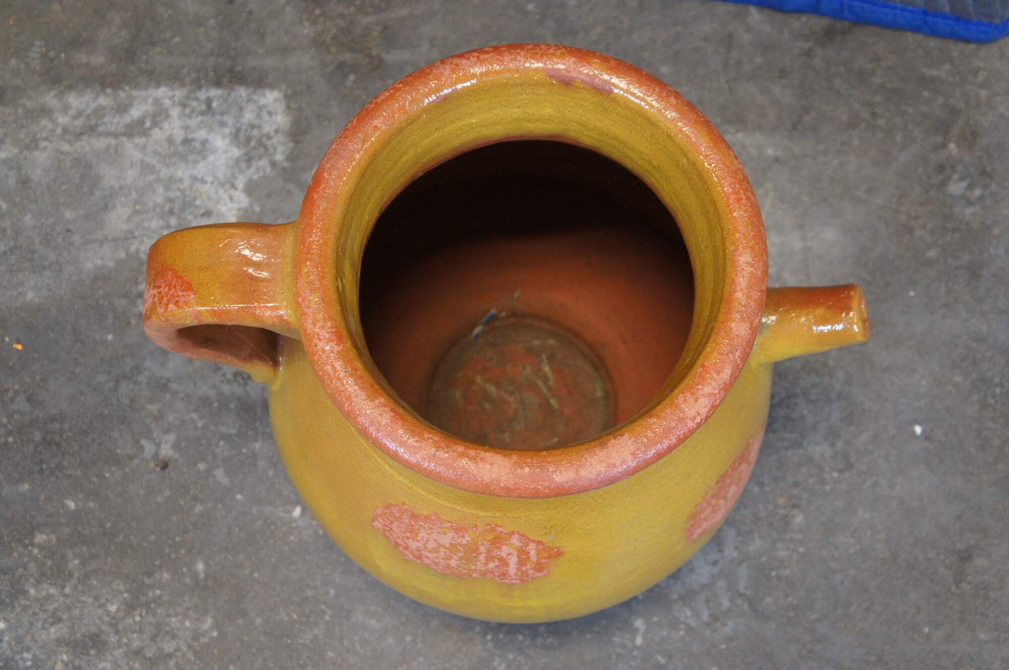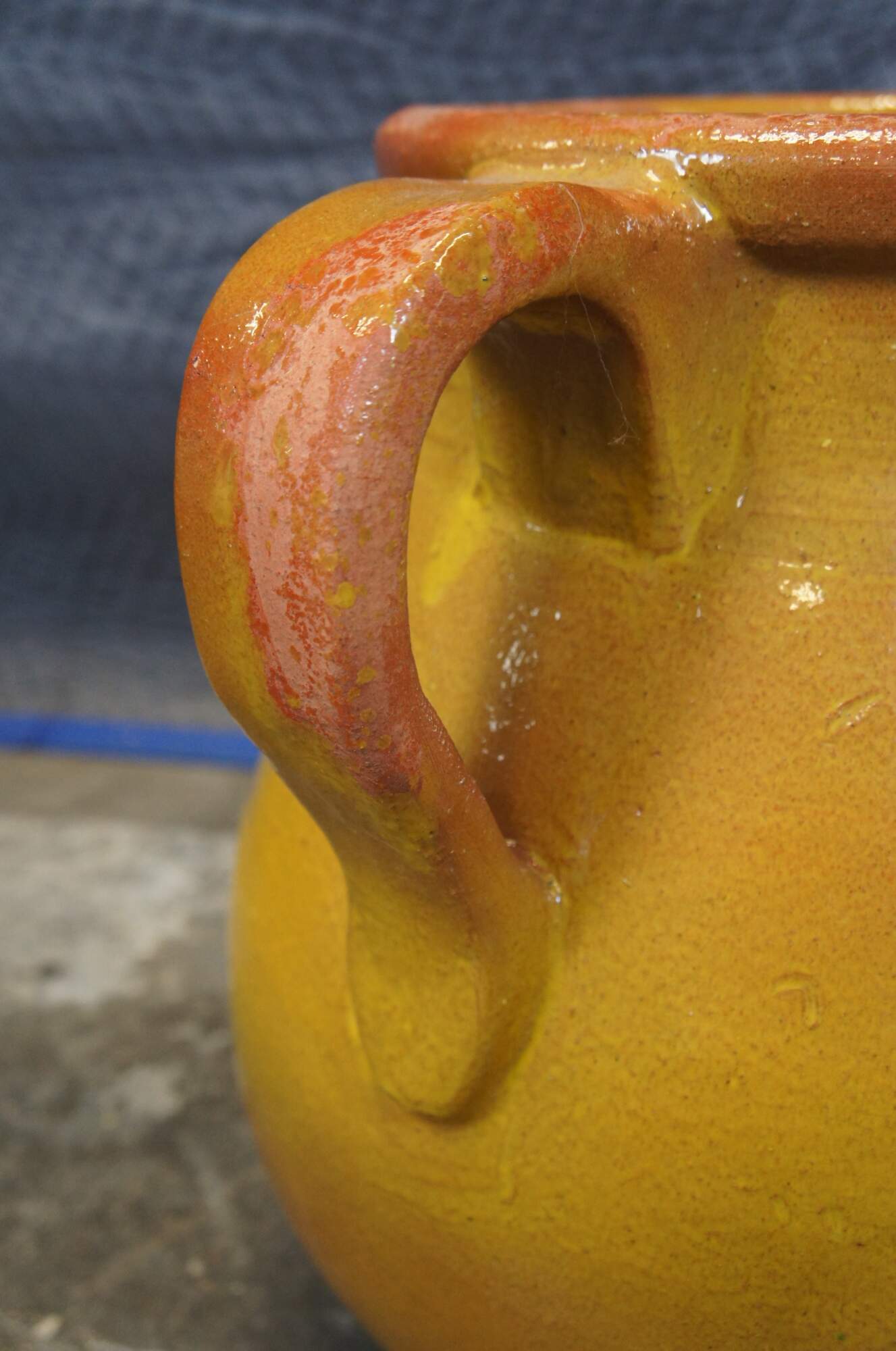 Antique French handcrafted terra cotta olive oil jar / water jug featuring a round shape with footed base, molded rim, large handle, narrow spout, finished in a yellow glaze with orange accents.
