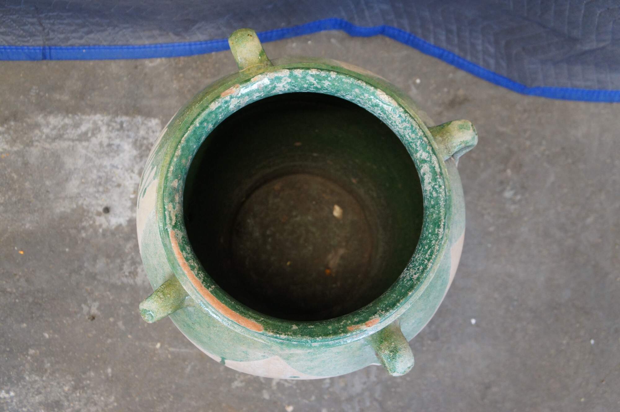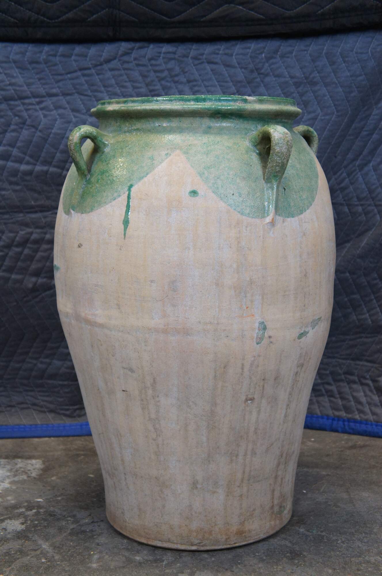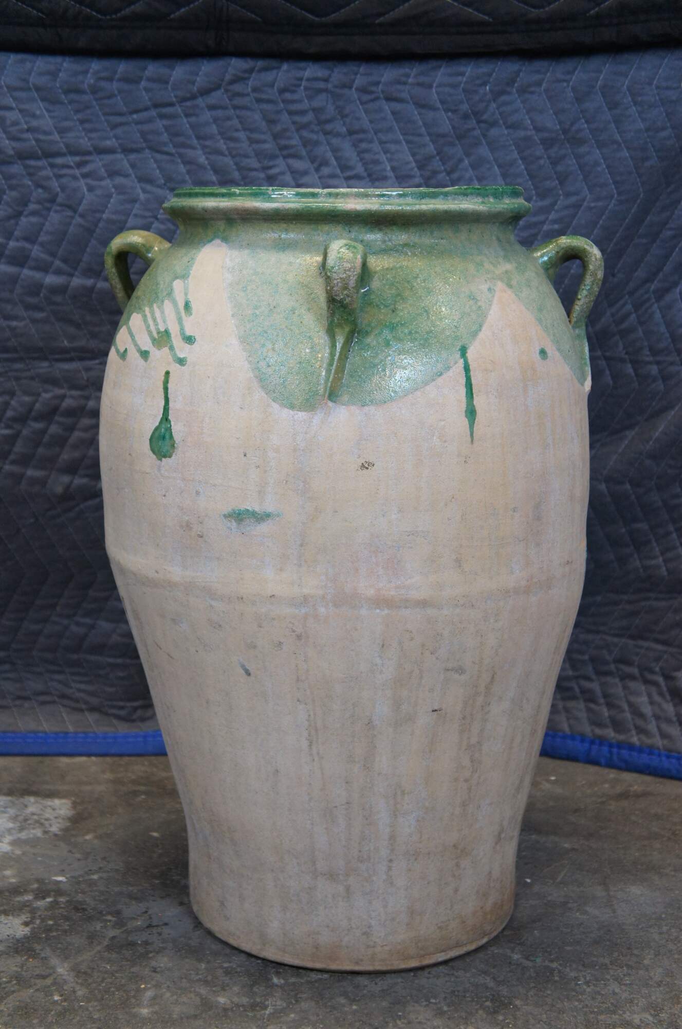 Antique French amphora / floor vase, handcrafted of light colored terracotta, rounded form with tapered base, molded green glazed rim / interior, and four handles.