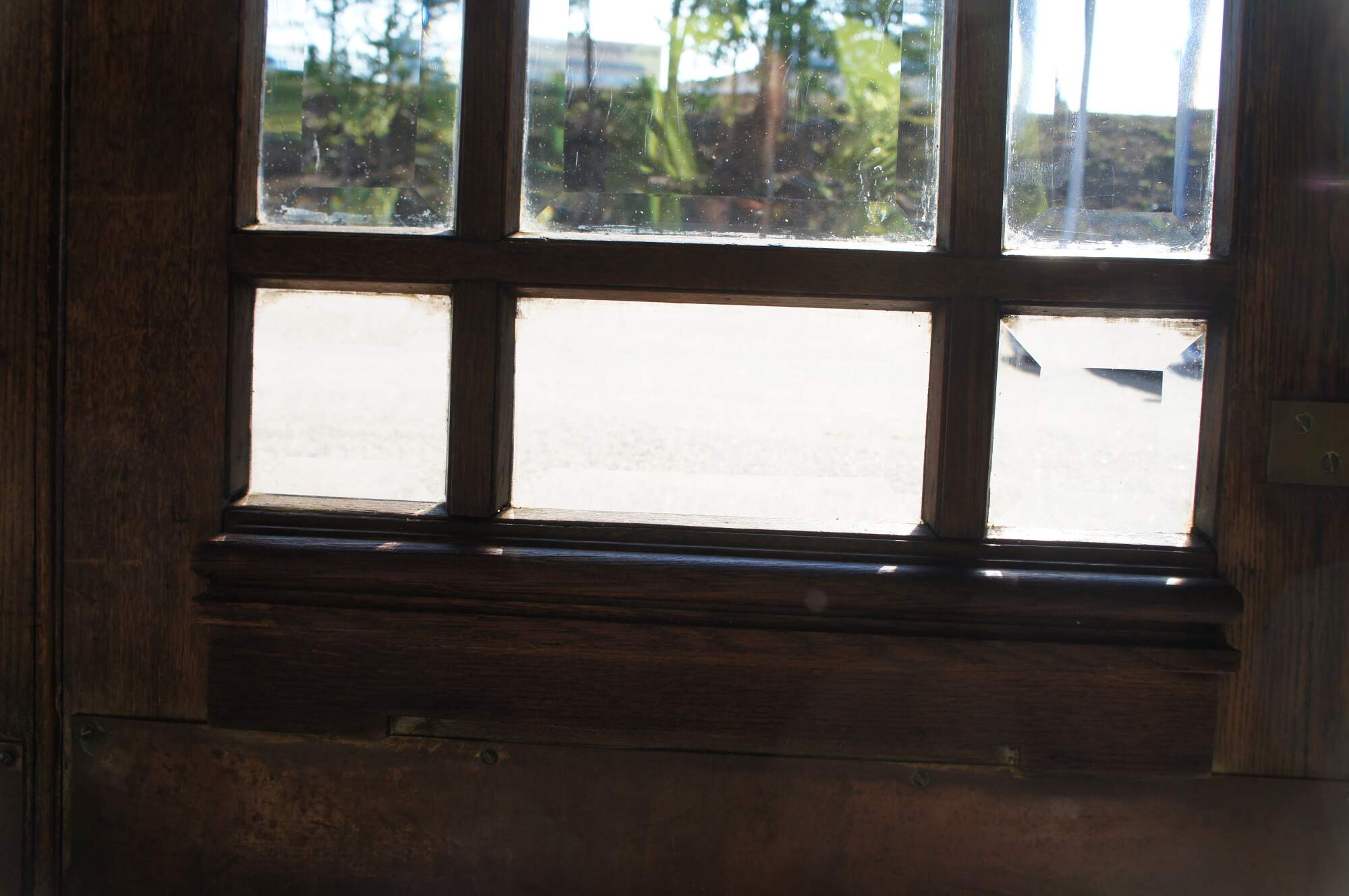 Good Condition; Age and use related wear. Finish loss, marking and scuffing. The doors used to have brass plates along the sides to push opened and closed.