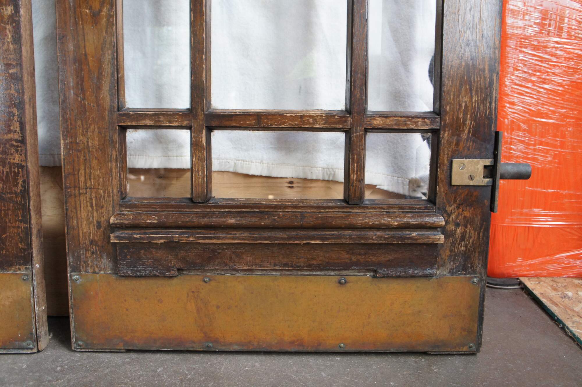 Pair of Mid Century French Saloon Swinging / Pivot Double Doors. Feature an oak frame with Prairie style lattice shaped center and beveled glass panels. The door is accented with brass mounted kickplates and Hawgood Systems Spring Hinges.