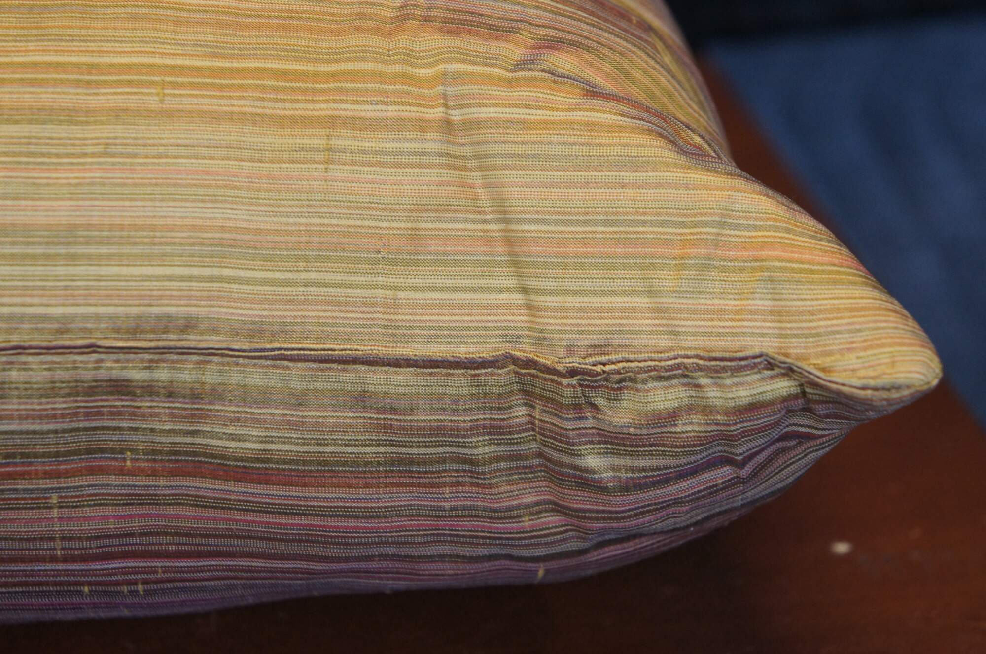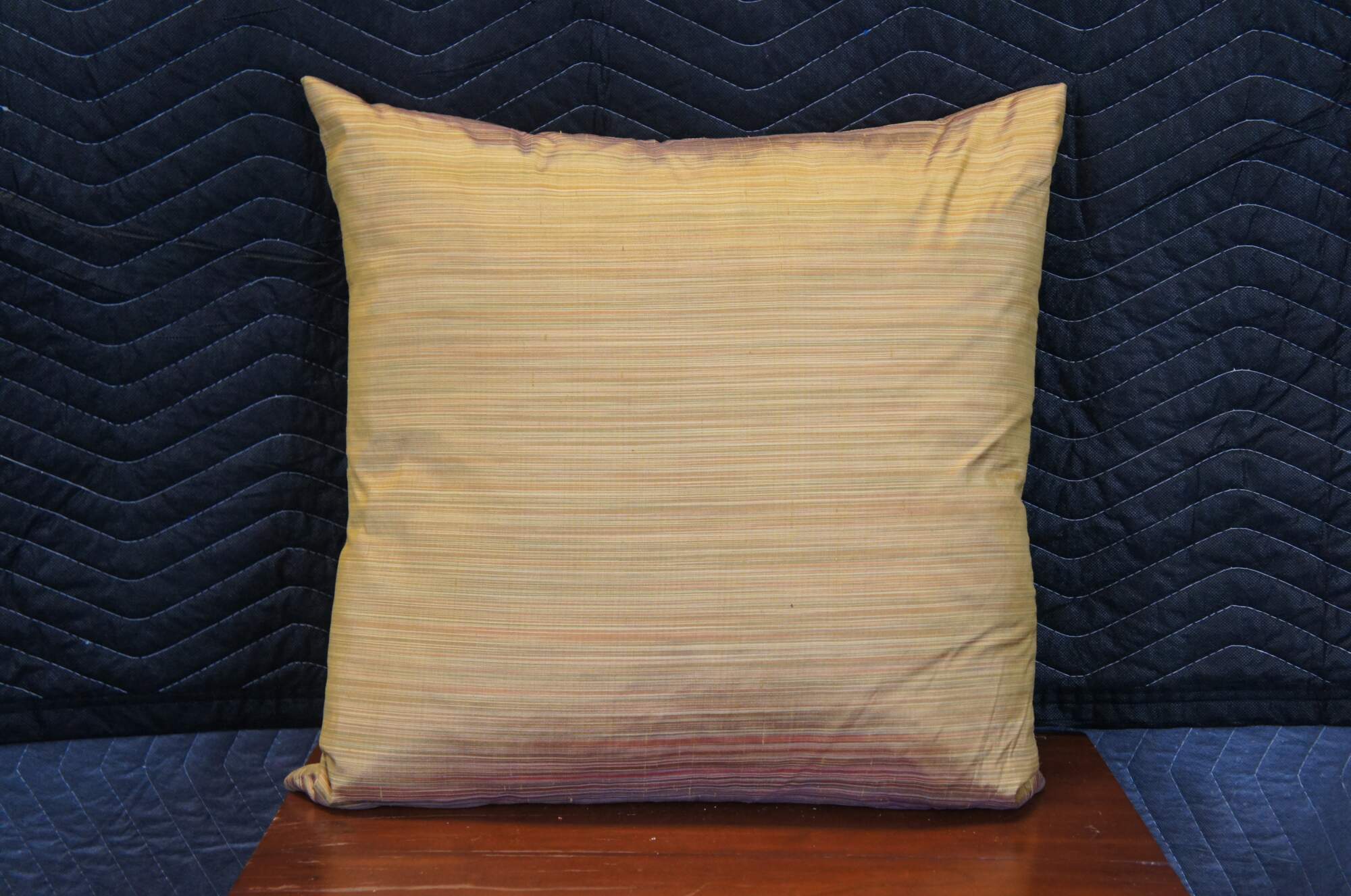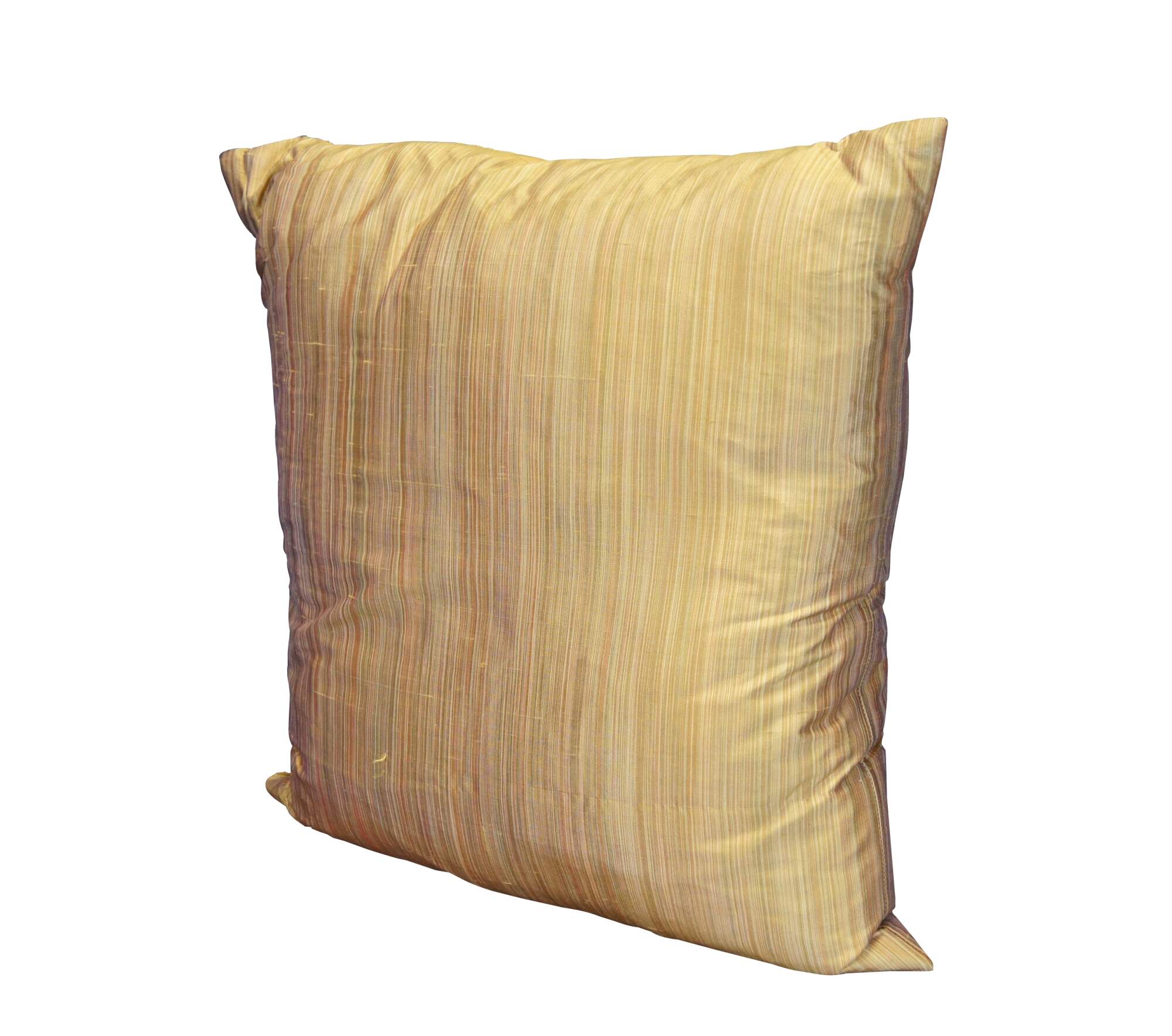 Late 20th century square down filled throw / accent pillow featuring a silk cover with a woven gold, red, and green pinstripe, producing a slightly iridescent effect. Sewn closure.