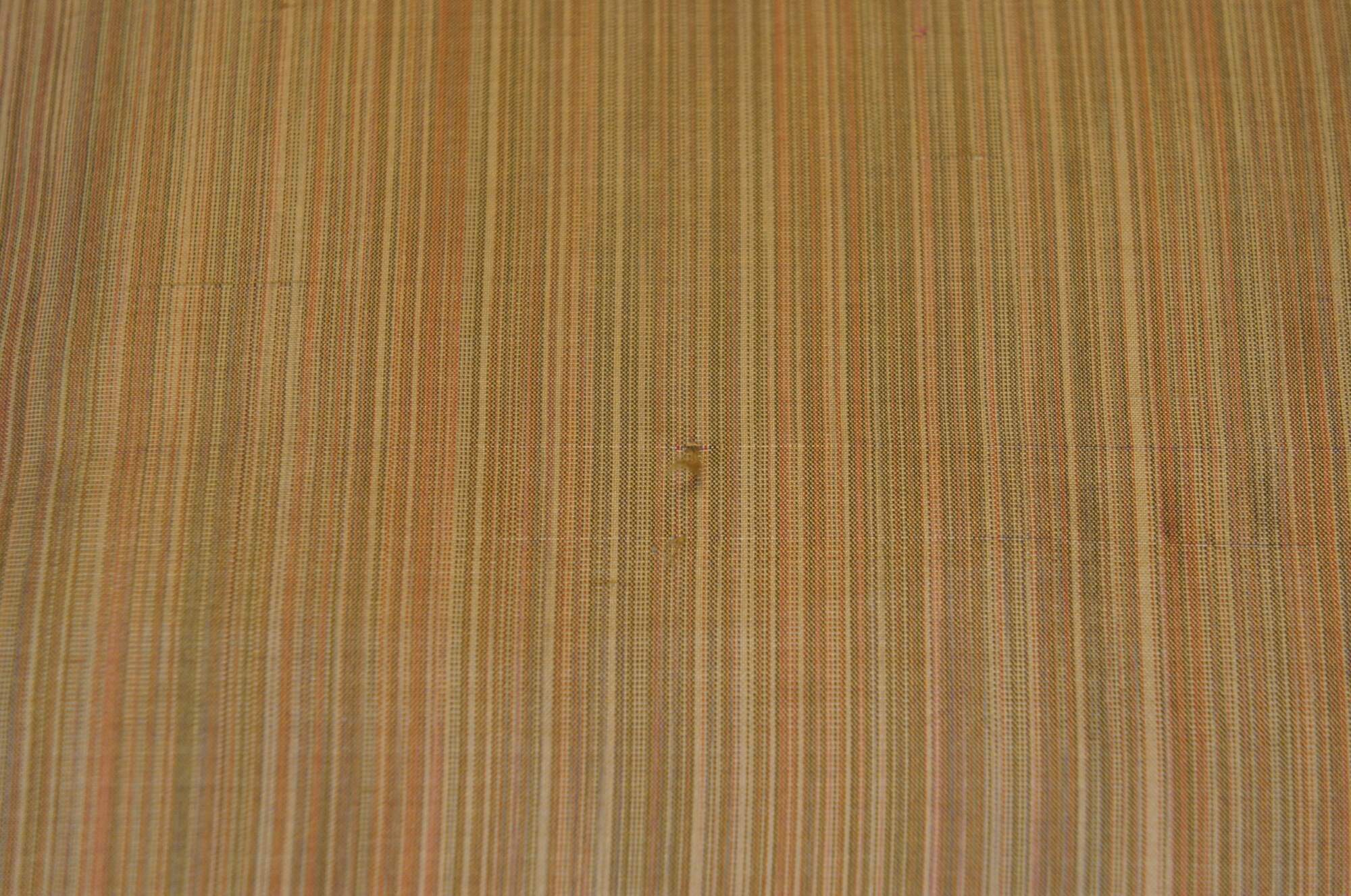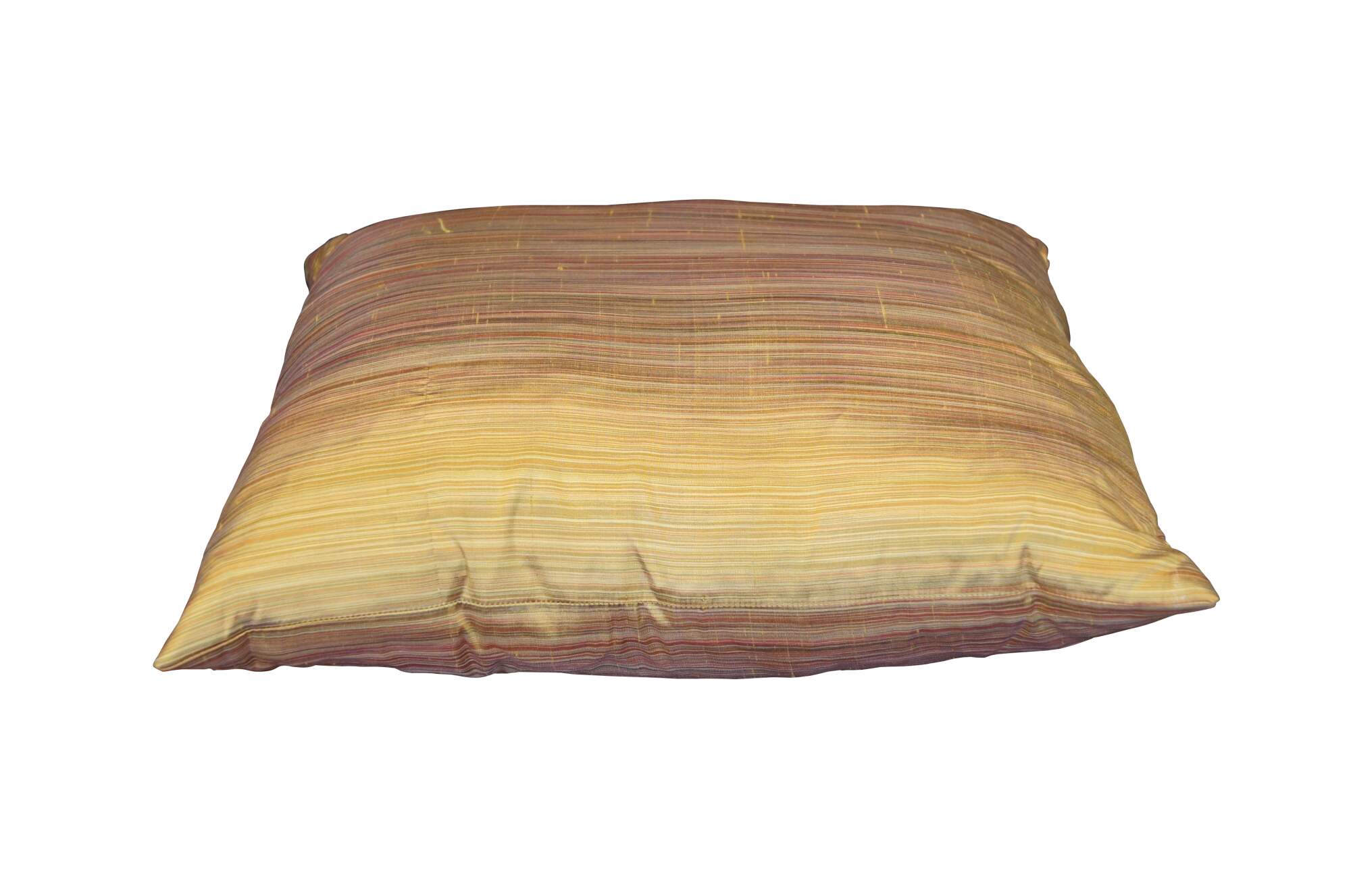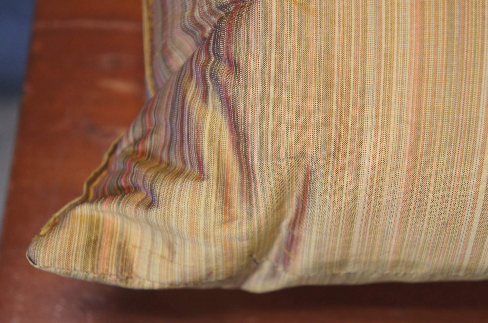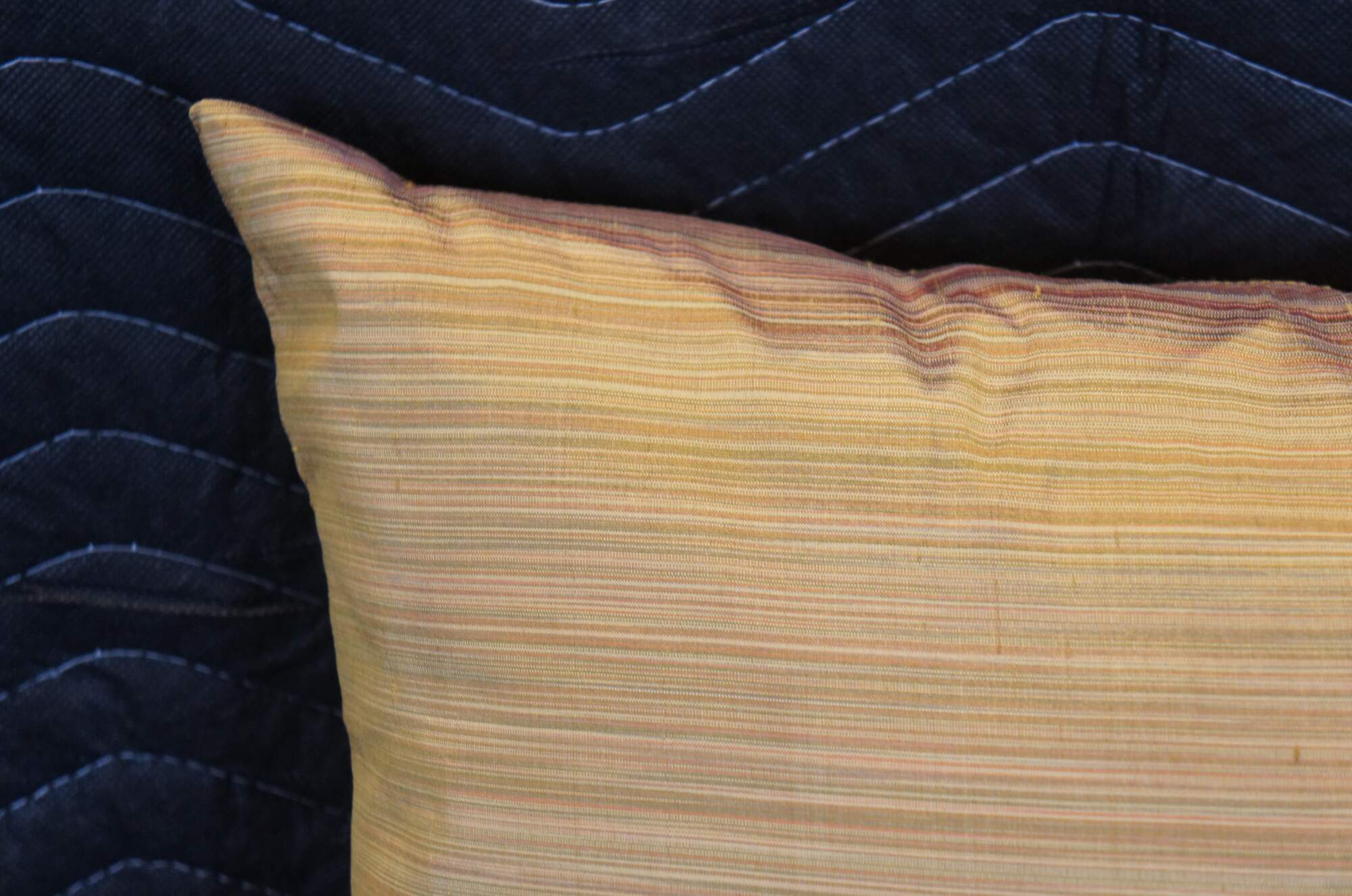 Late 20th century square down filled throw / accent pillow featuring a silk cover with a woven gold, red, and green pinstripe, producing a slightly iridescent effect. Sewn closure.