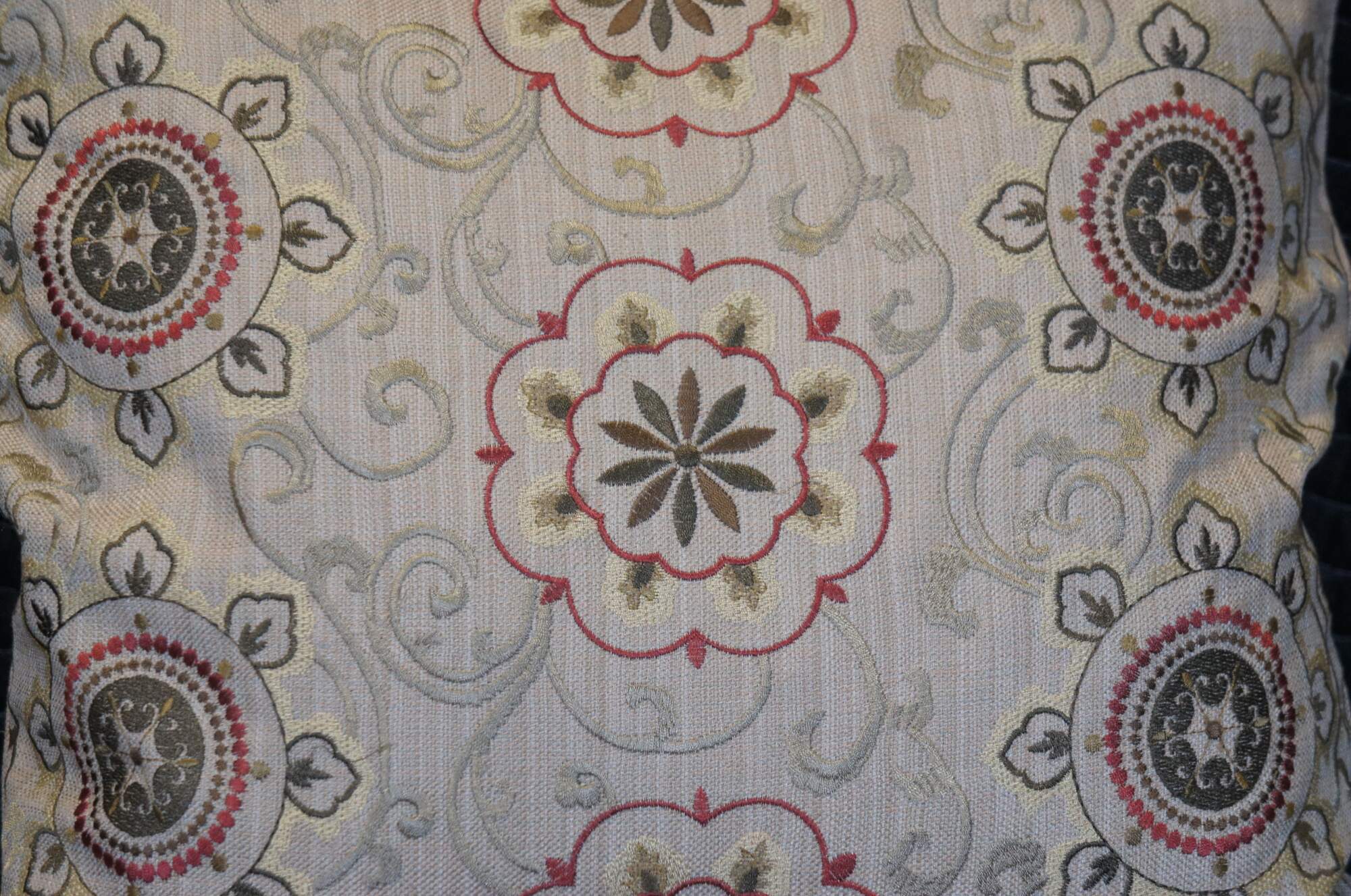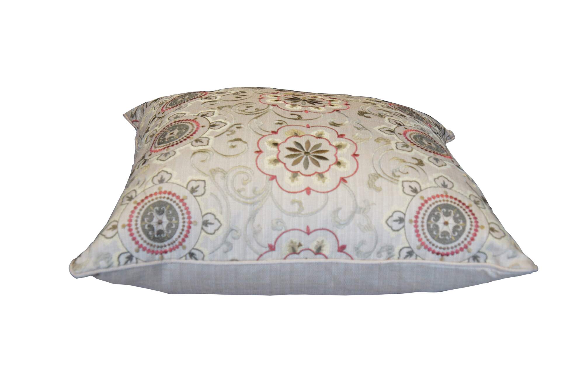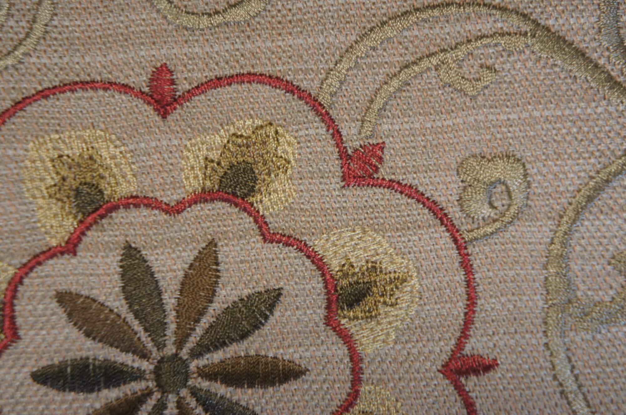 Late 20th century square down filled throw / accent pillow featuring a machine embroidered floral medallion and vine design in browns and burgundy on woven beige fabric. Zipper closure.