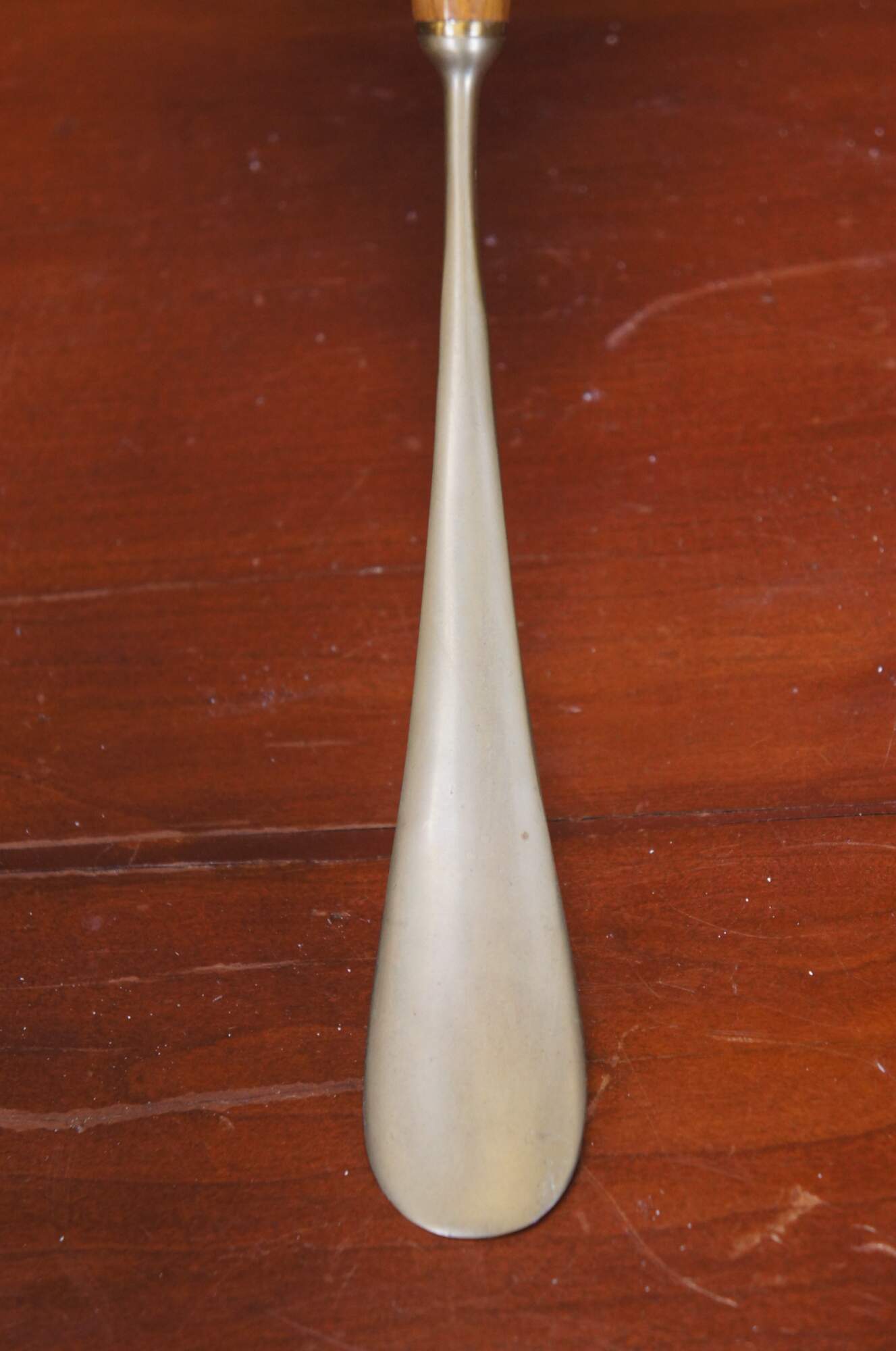 Vintage 20th century brass shoe horn with wooden shaft, topped with a brass duck / mallard head.