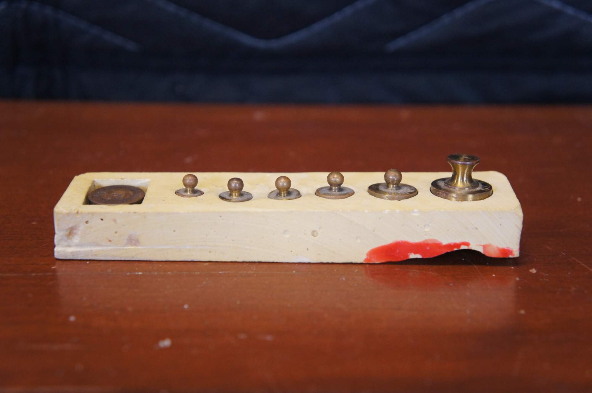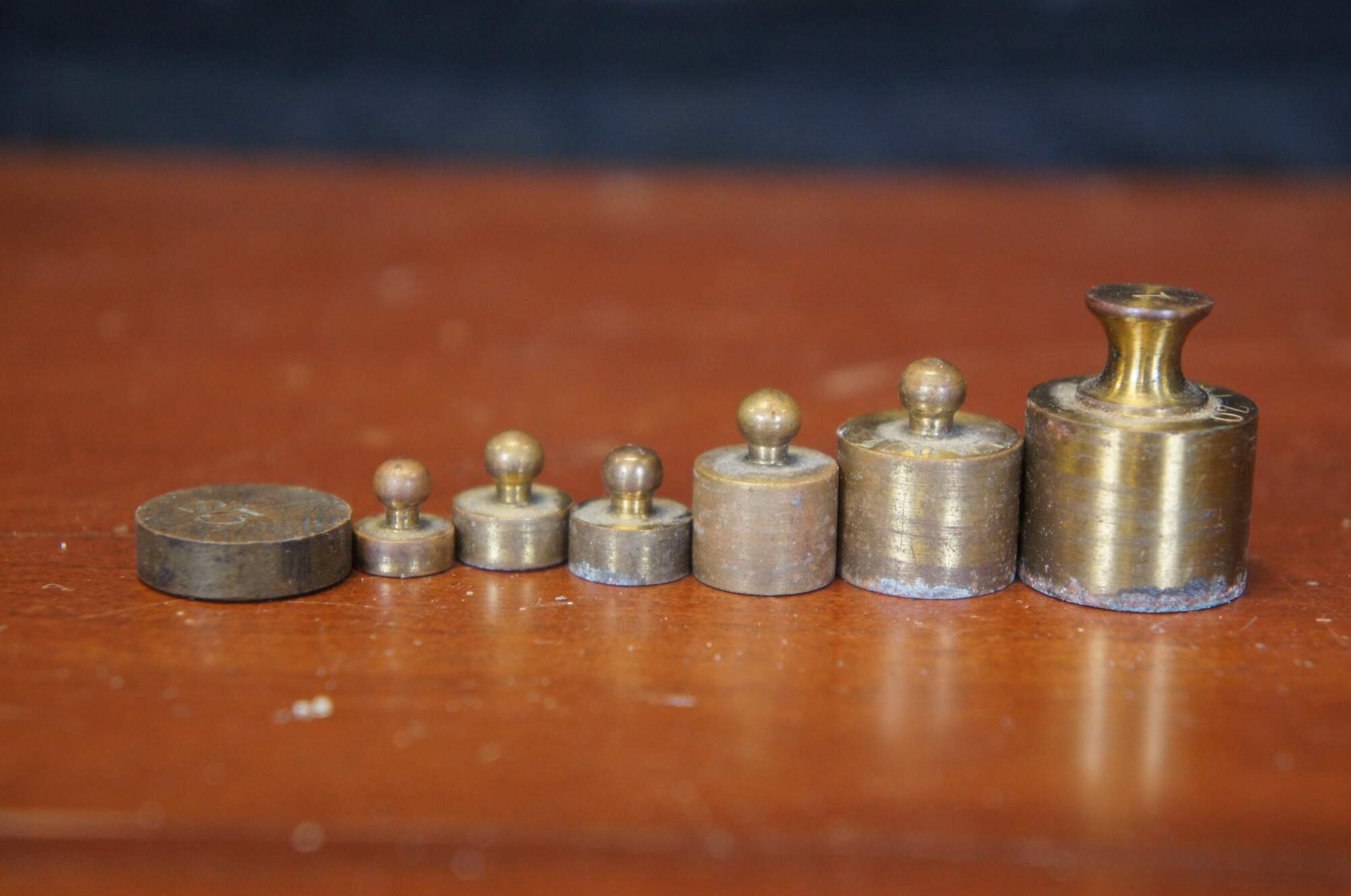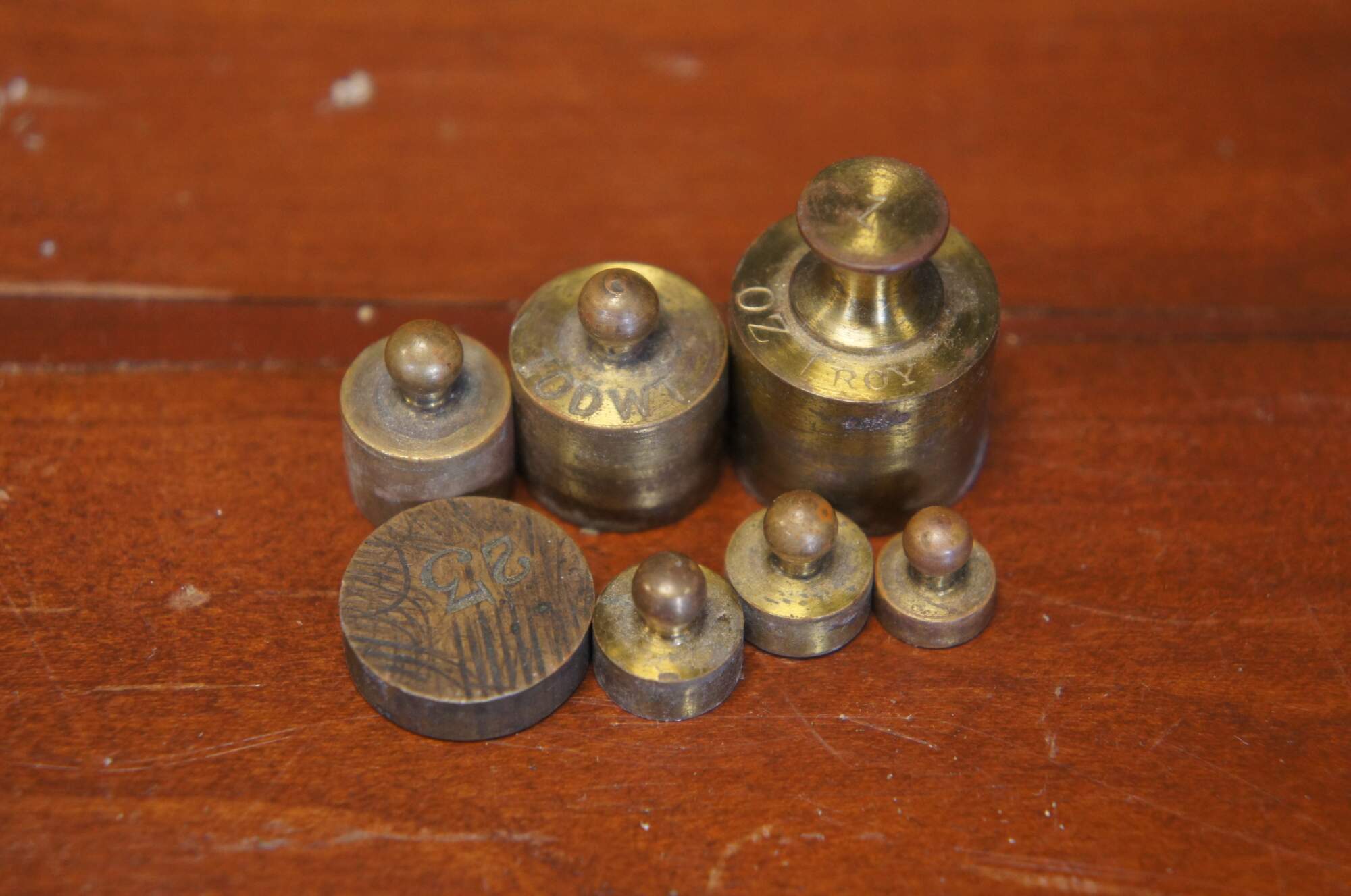 Vintage set of apothecary / parmacist's weights in white ceramic base. Includes six brass weights (1 Troy oz, 10dwt, 5, 2, and 1) and one coin shaped weight marked 23.