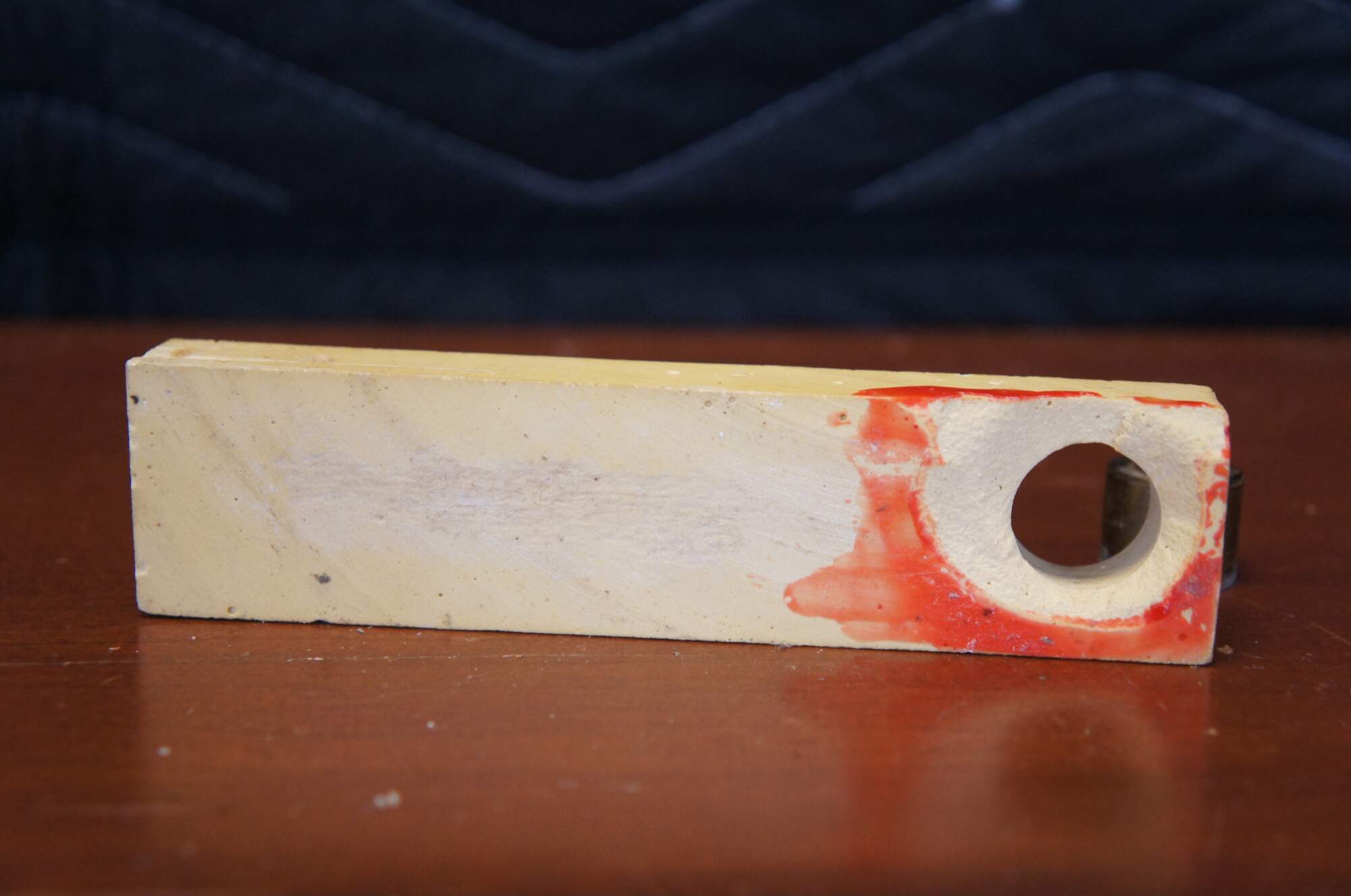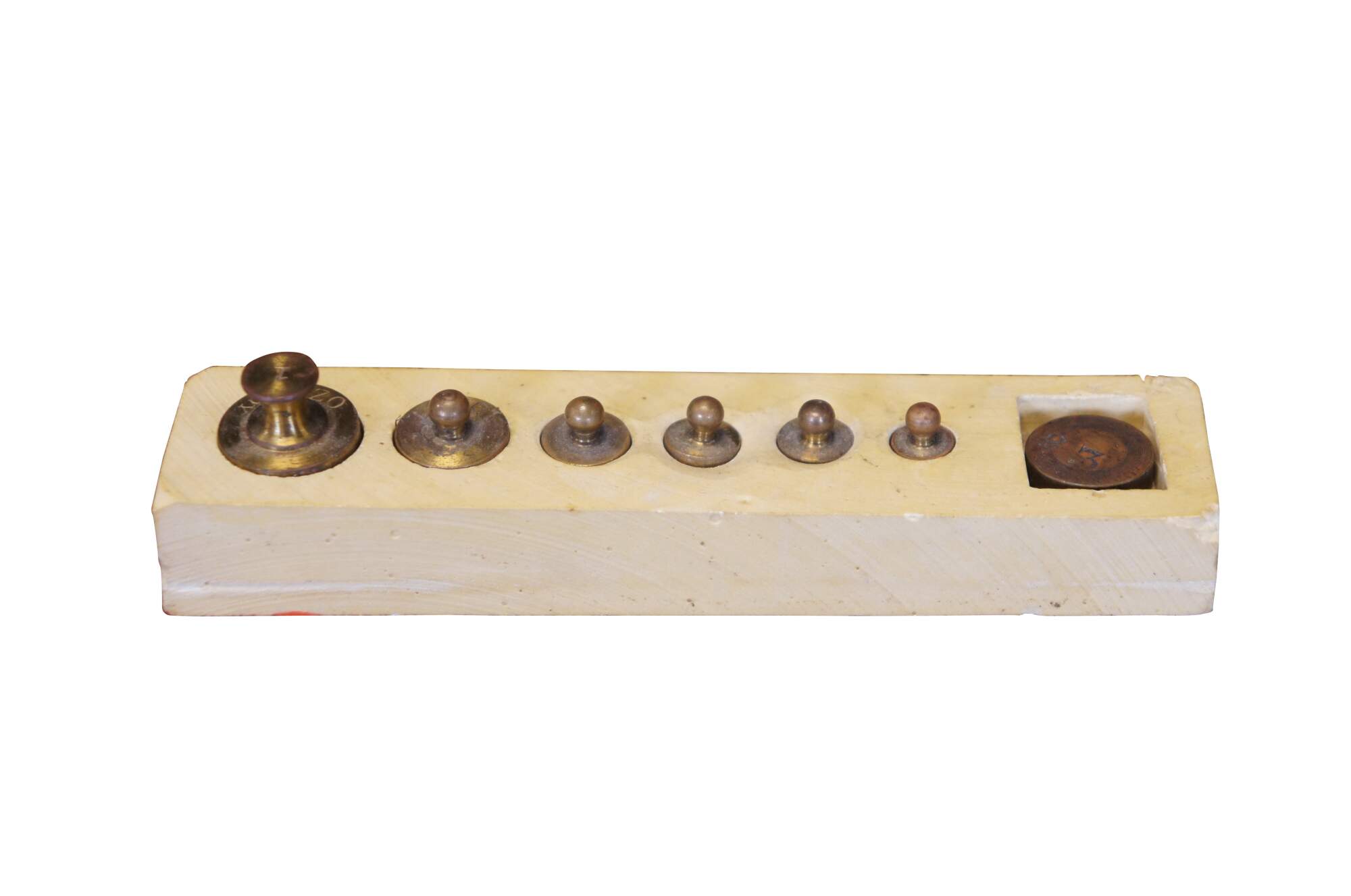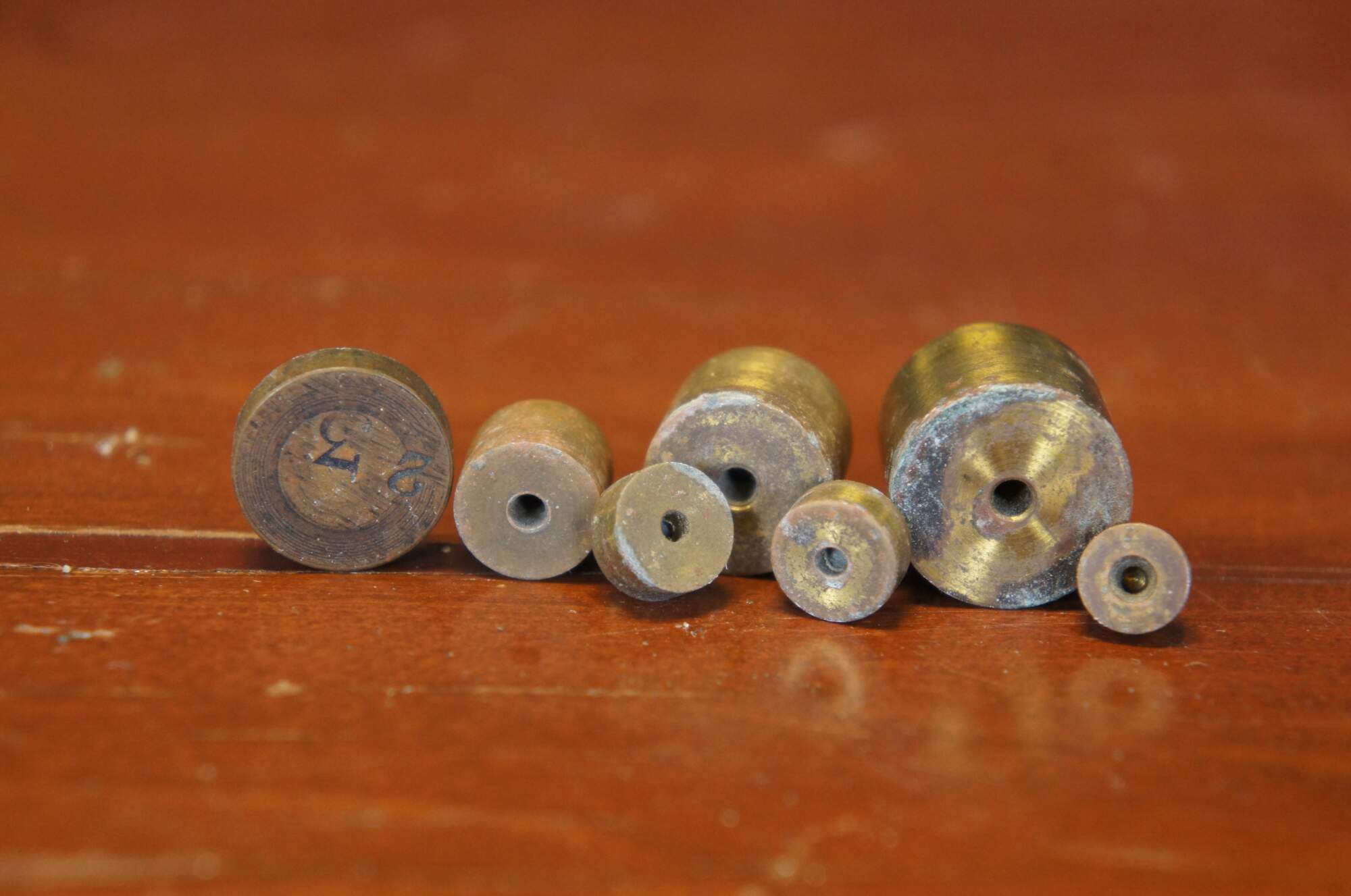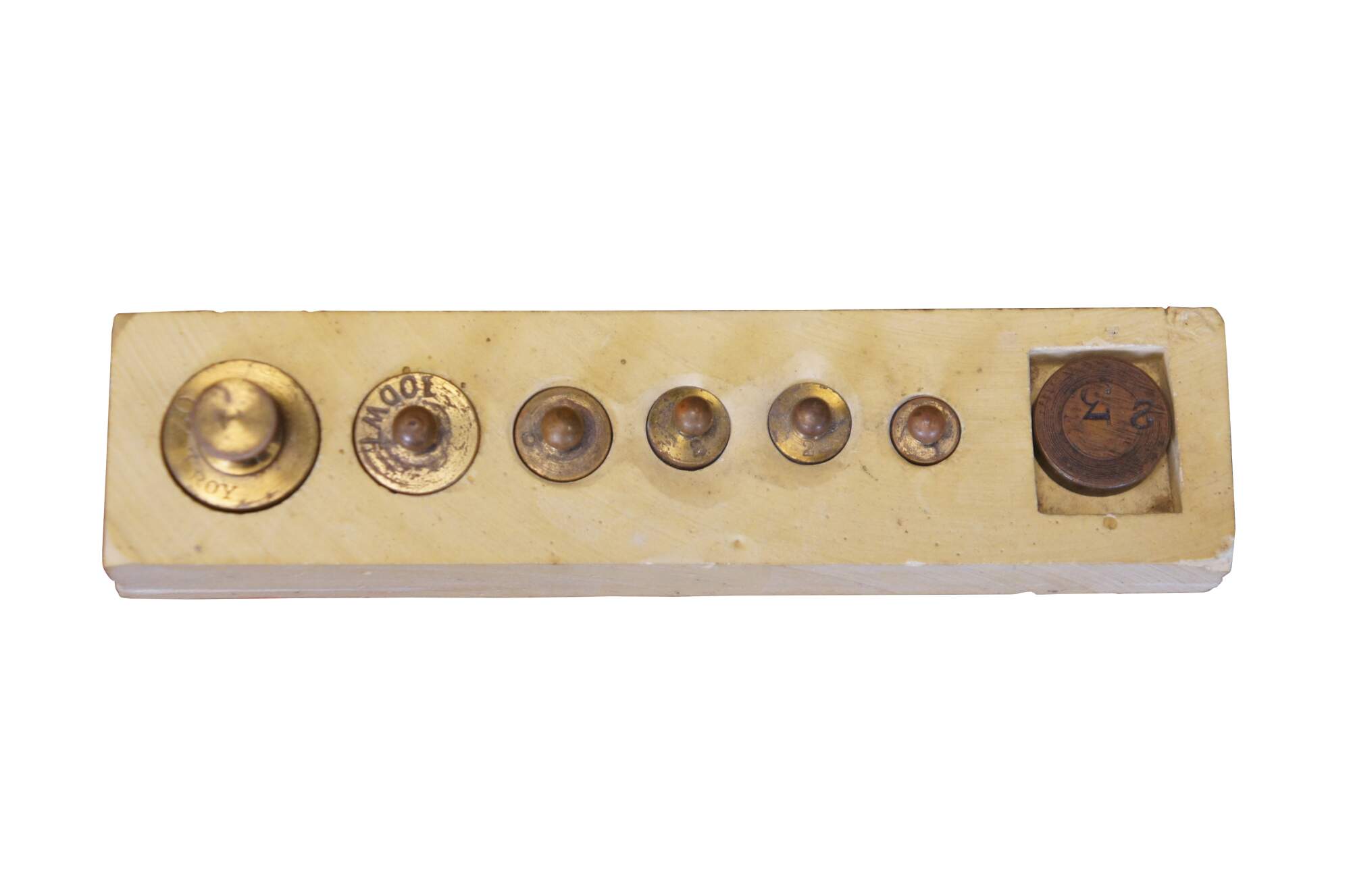 Vintage set of apothecary / parmacist's weights in white ceramic base. Includes six brass weights (1 Troy oz, 10dwt, 5, 2, and 1) and one coin shaped weight marked 23.