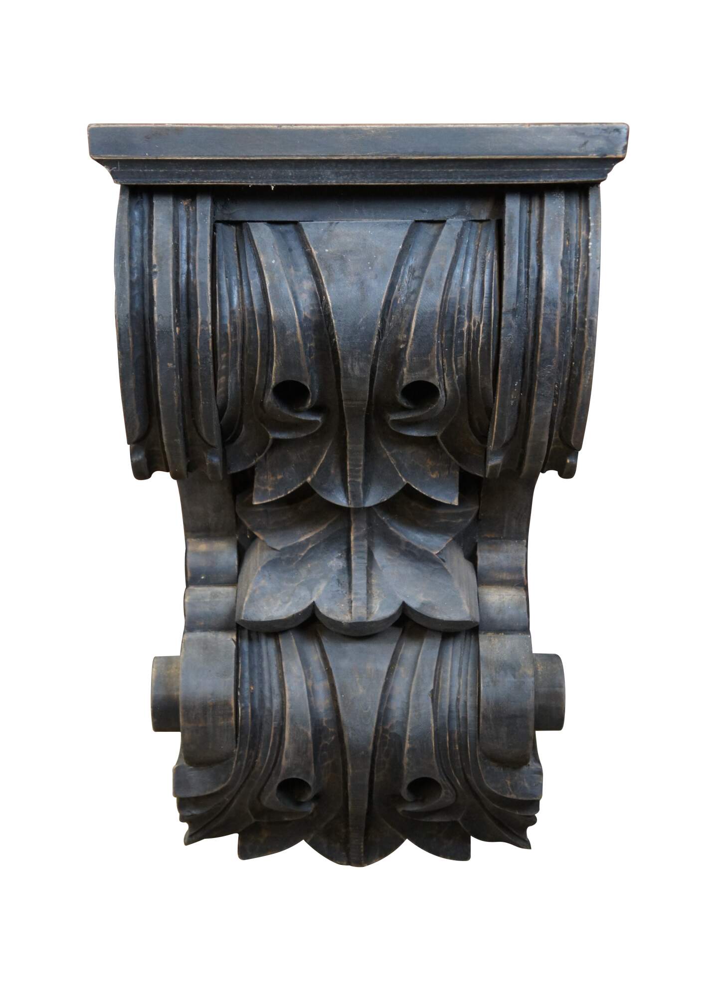 Extrememly large hardwood corbel / bracket by Restoration Hardware. Factory distressed, dark finished, solid hardwood carved with baroque Neoclassical scrollwork and acanthus leaf details; square top. Made in India. 40400829 BRN