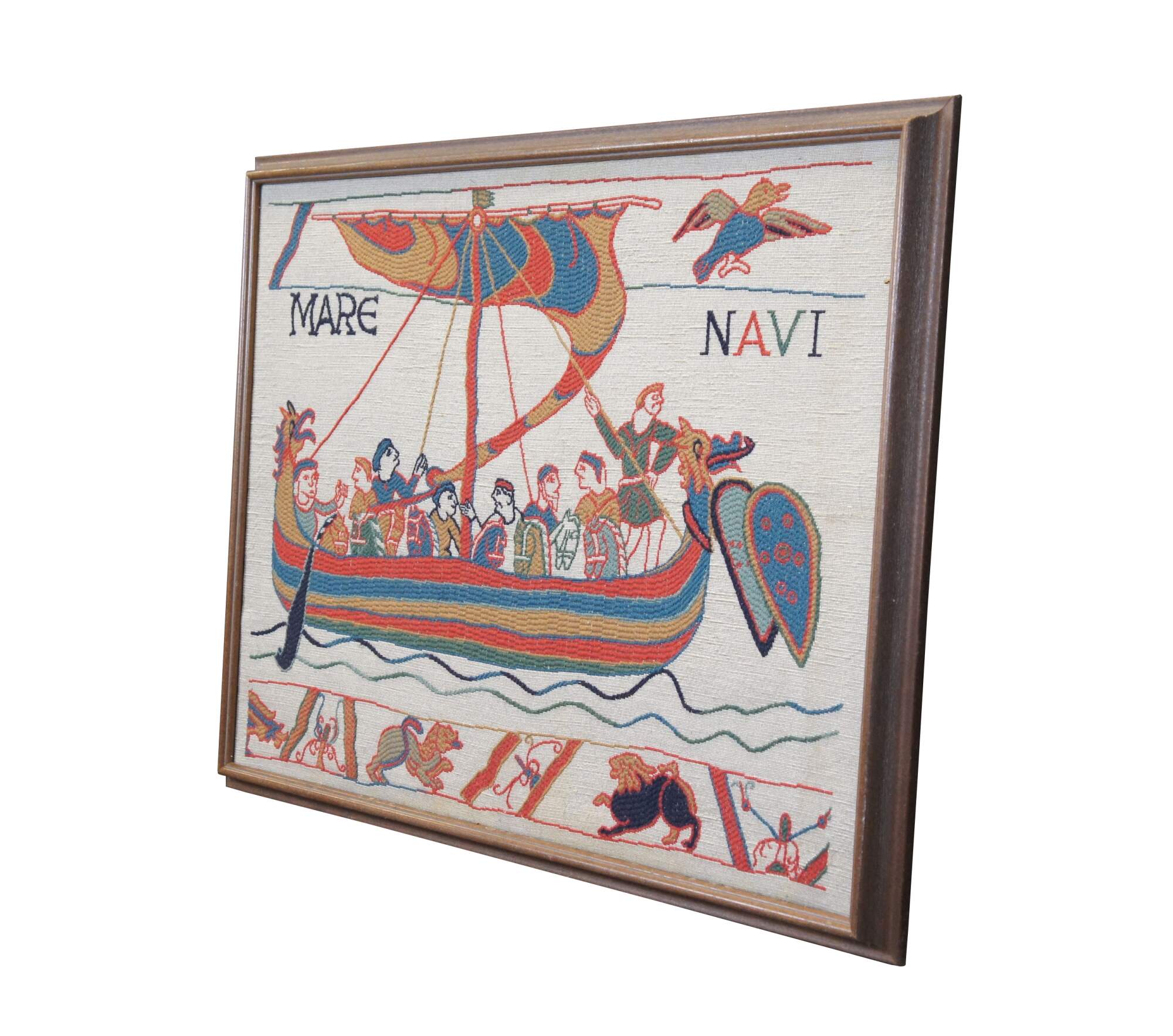 20th century woven recreation of a portion of the historic nautical / maritime / ship / war boat Bayeux Tapestry, depicting Duke William of Orange crossing the English Channel, initiating the Norman invasion of Britain in 1066. In this segment we see a brightly colored ship filled with soldiers and horses while a bird flies above with the words Mare Navi, over a border of lions and decorative motifs. Beveled wood frame.
