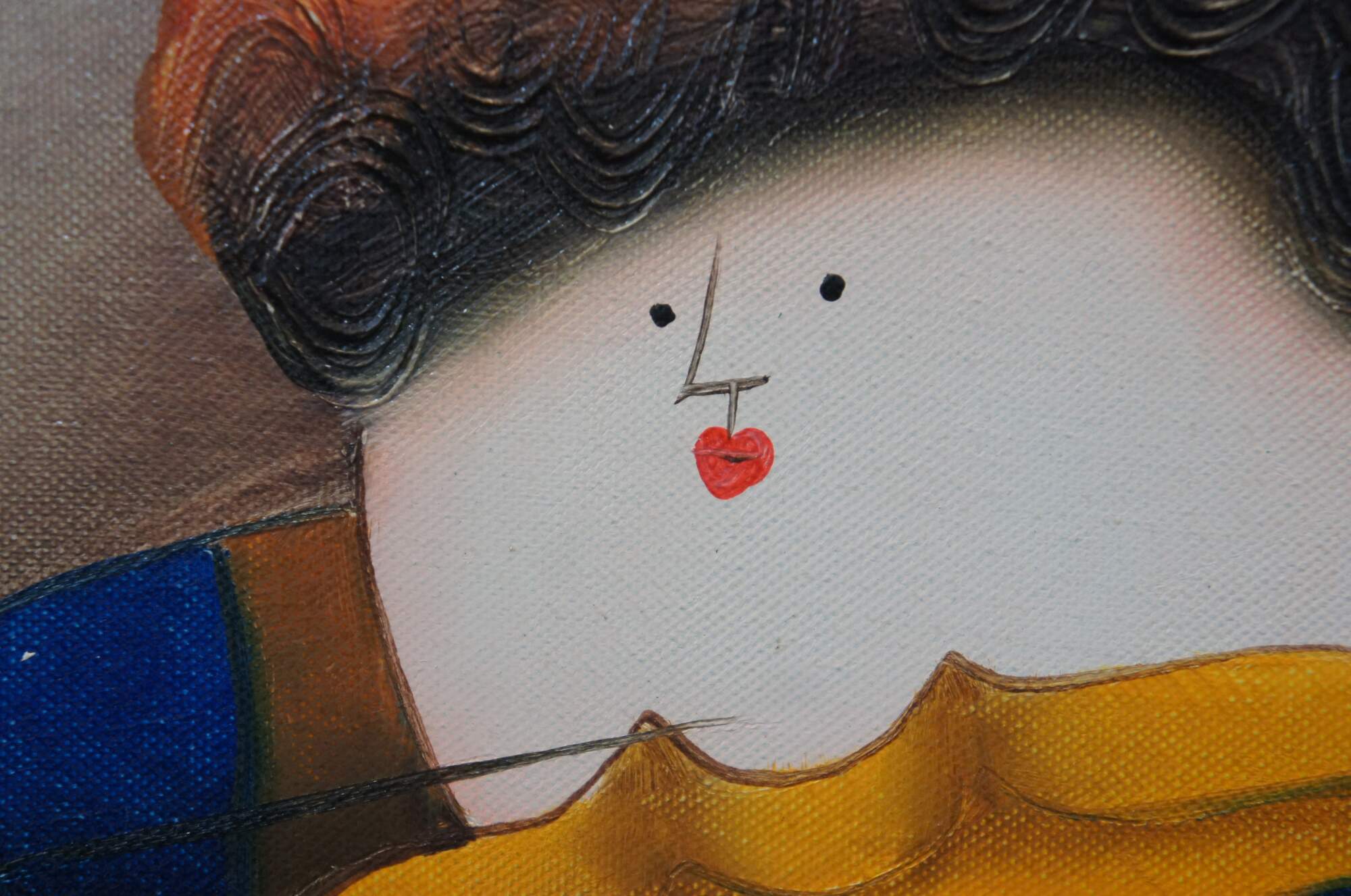 Late 20th century oil on canvas painting depicting a set of four orchestral musicians playing instruments in brightly colored clothing. Signed E. Saville in lower right corner. In the style of Graciela Rodo Boulanger and after works attributed to Joyce Roybal. Mottled brown beveled frame with gilt border.