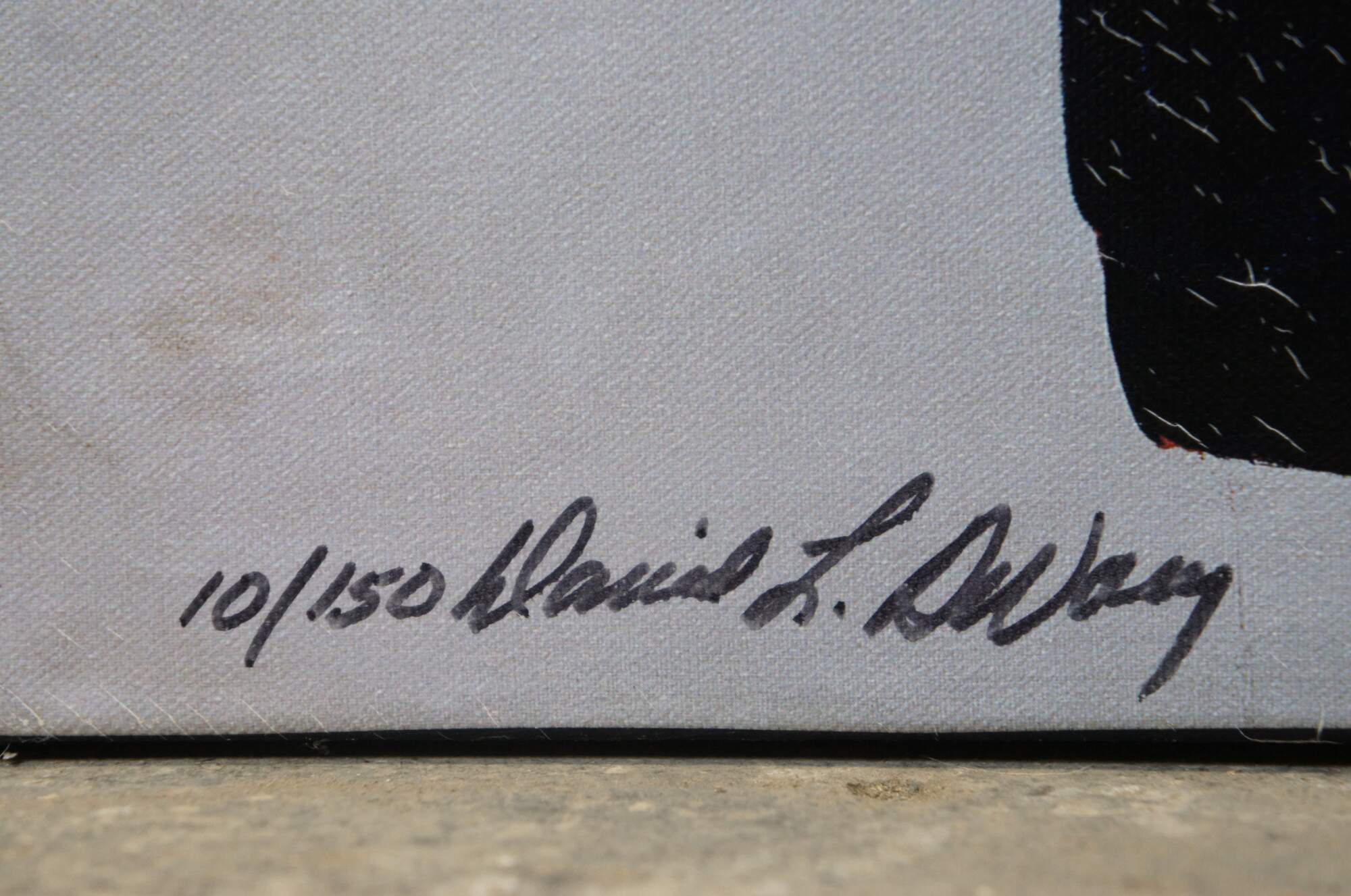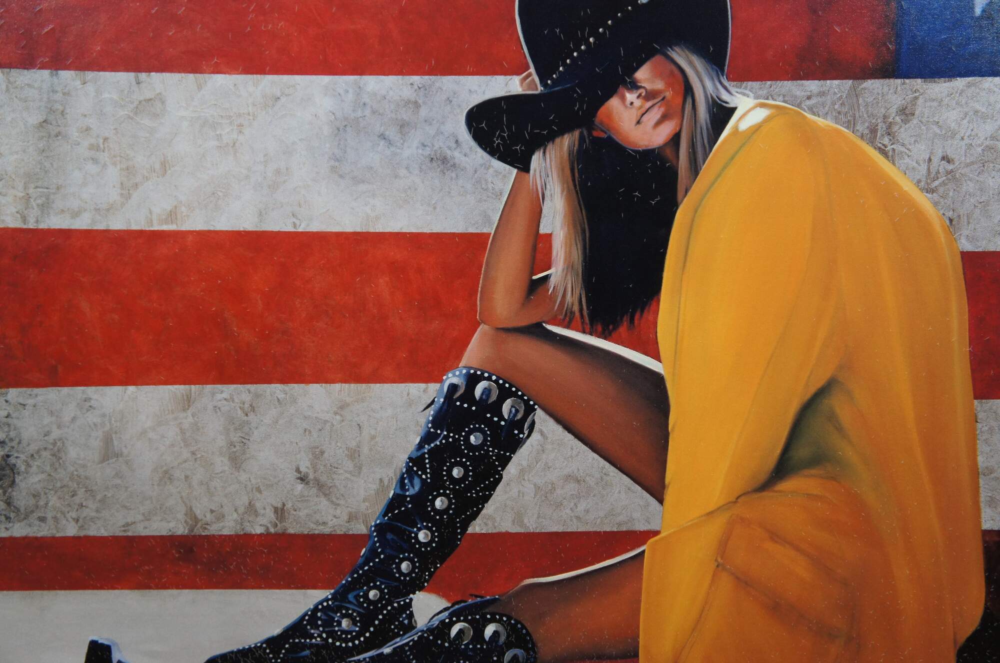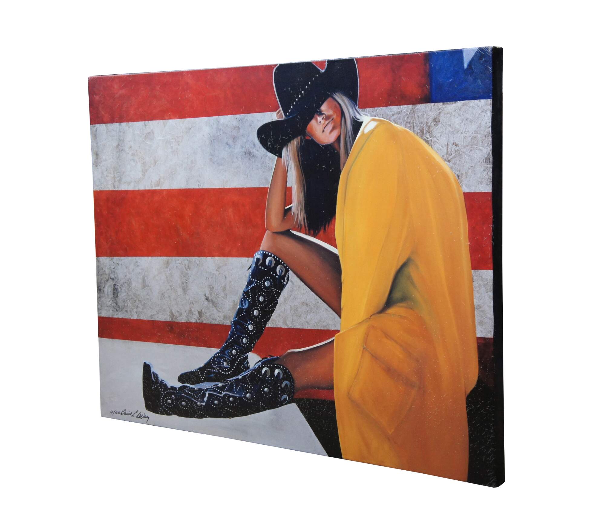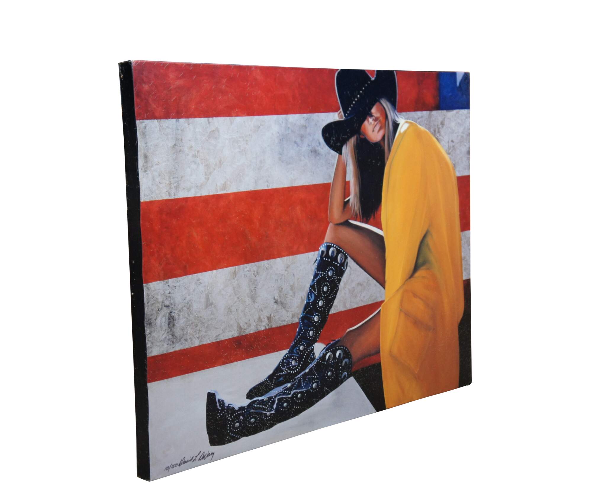 Vintage limited edition giclee on canvas print of "It's All Great by David DeVary. Depicts a seated southwestern / western female cowgirl figure in long studded cowboy boots, yellow duster, and black Stetson hat in front of an American flag. Signed and numbered 10/150 in lower right corner. This is the large edition.