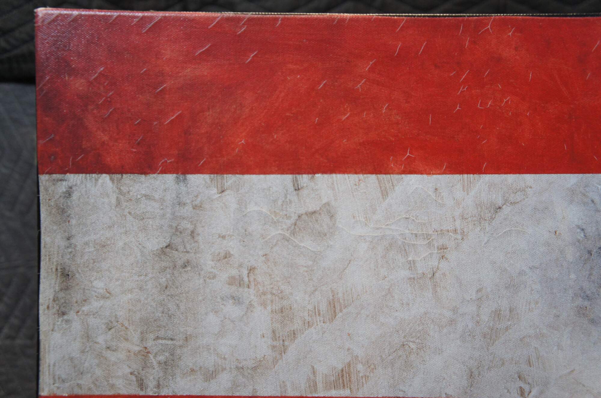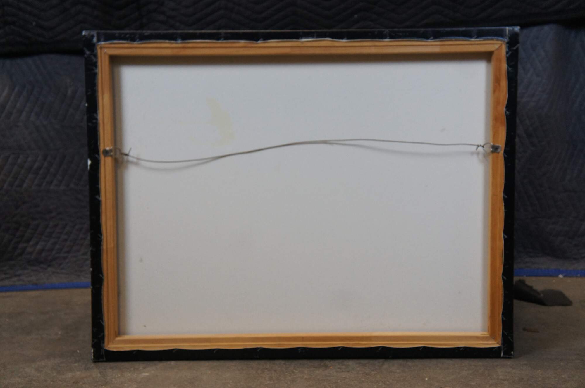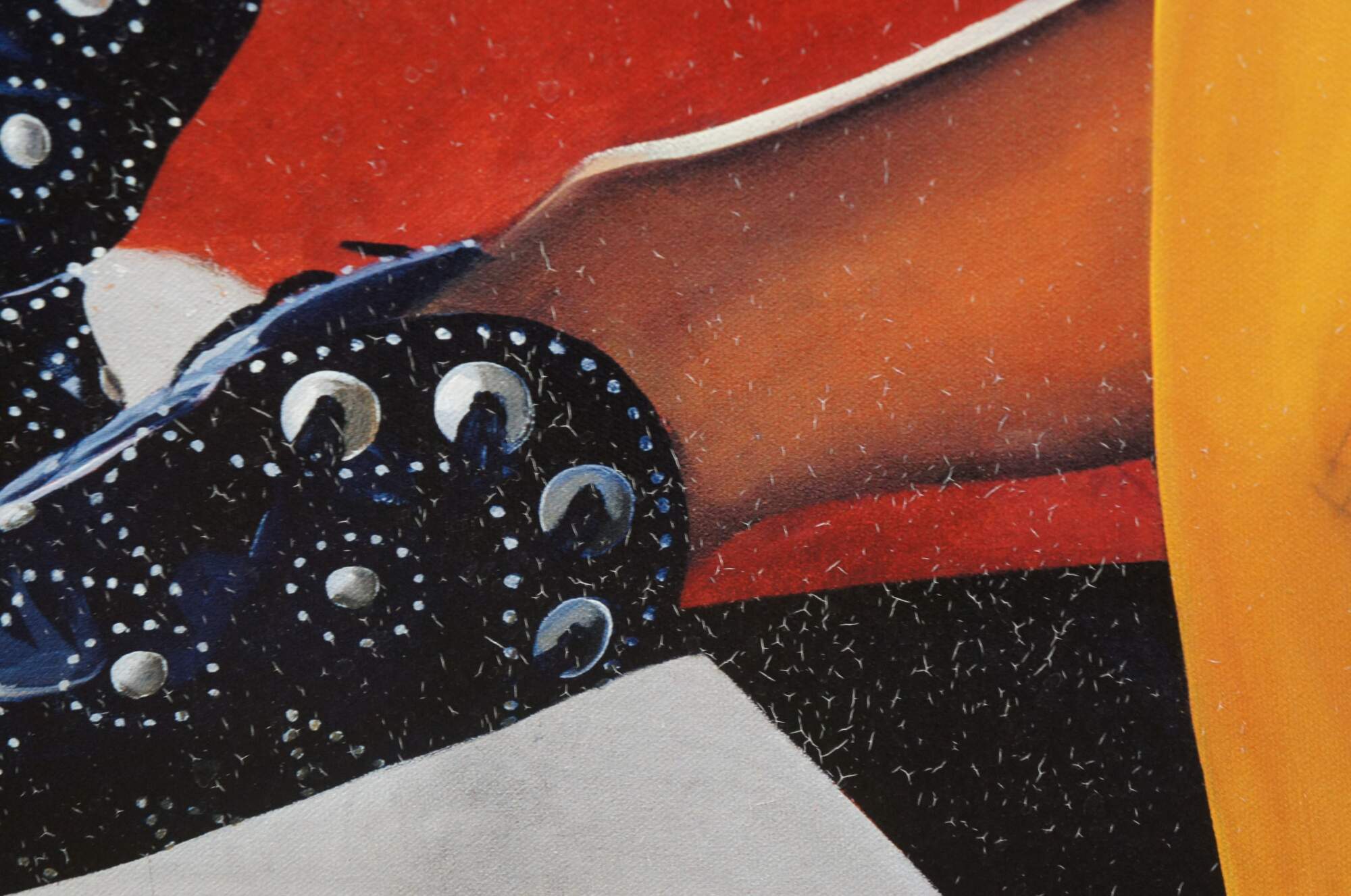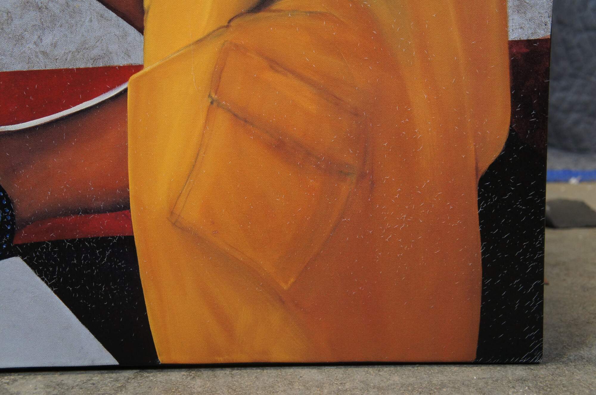 Vintage limited edition giclee on canvas print of "It's All Great by David DeVary. Depicts a seated southwestern / western female cowgirl figure in long studded cowboy boots, yellow duster, and black Stetson hat in front of an American flag. Signed and numbered 10/150 in lower right corner. This is the large edition.