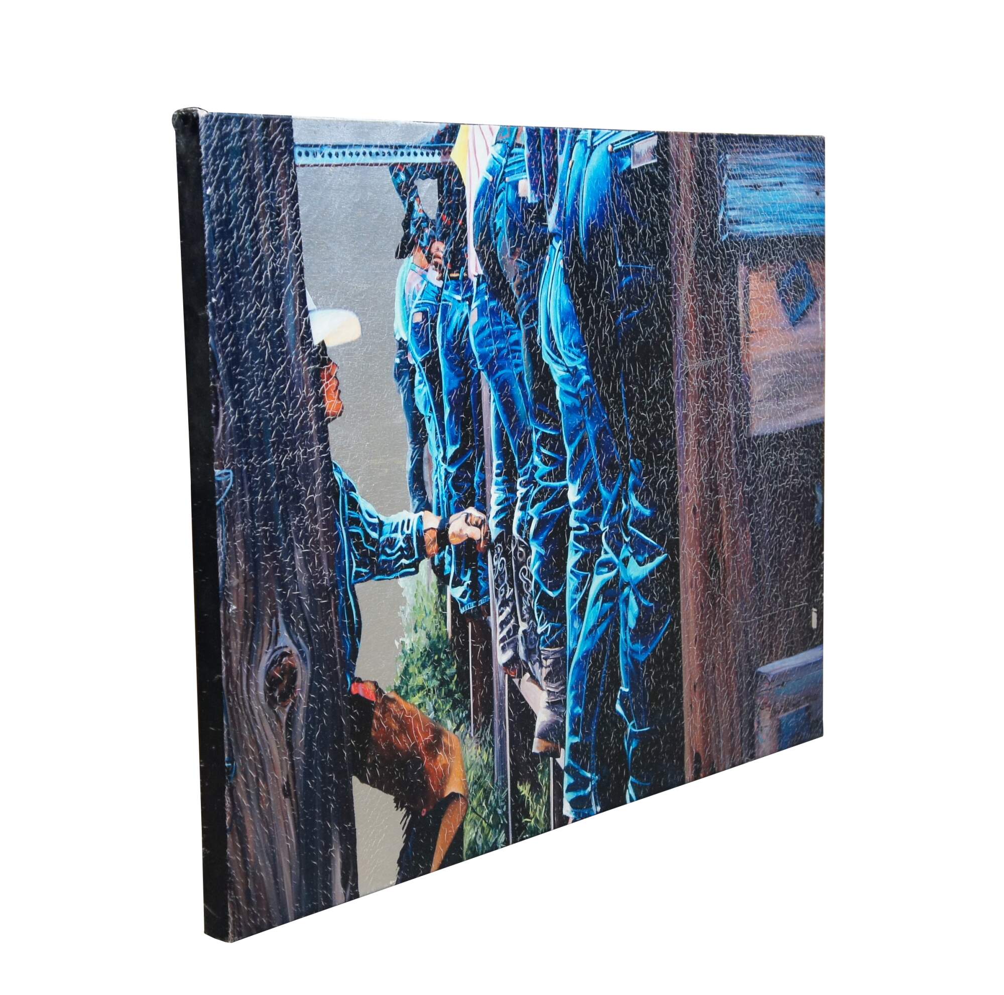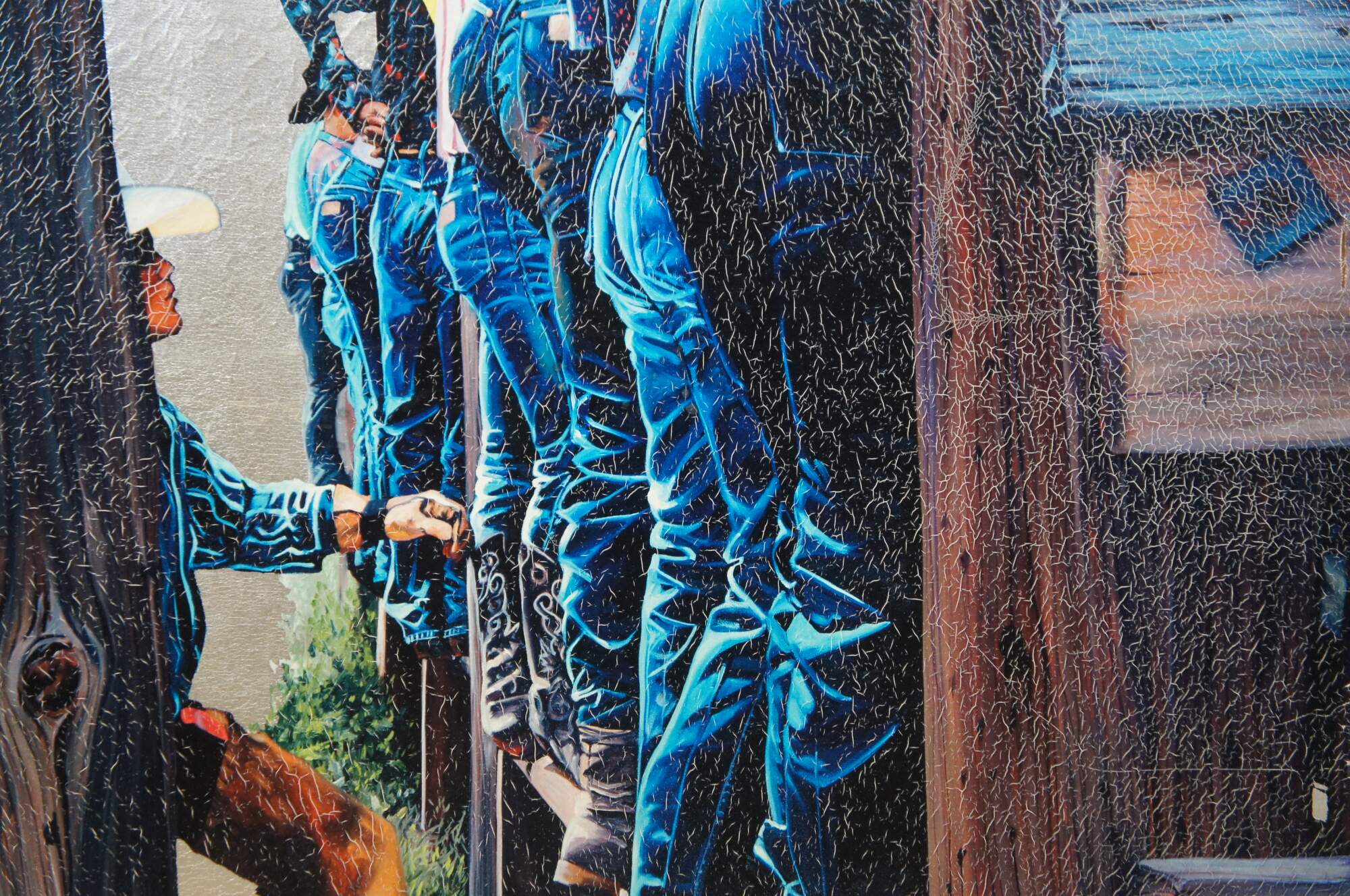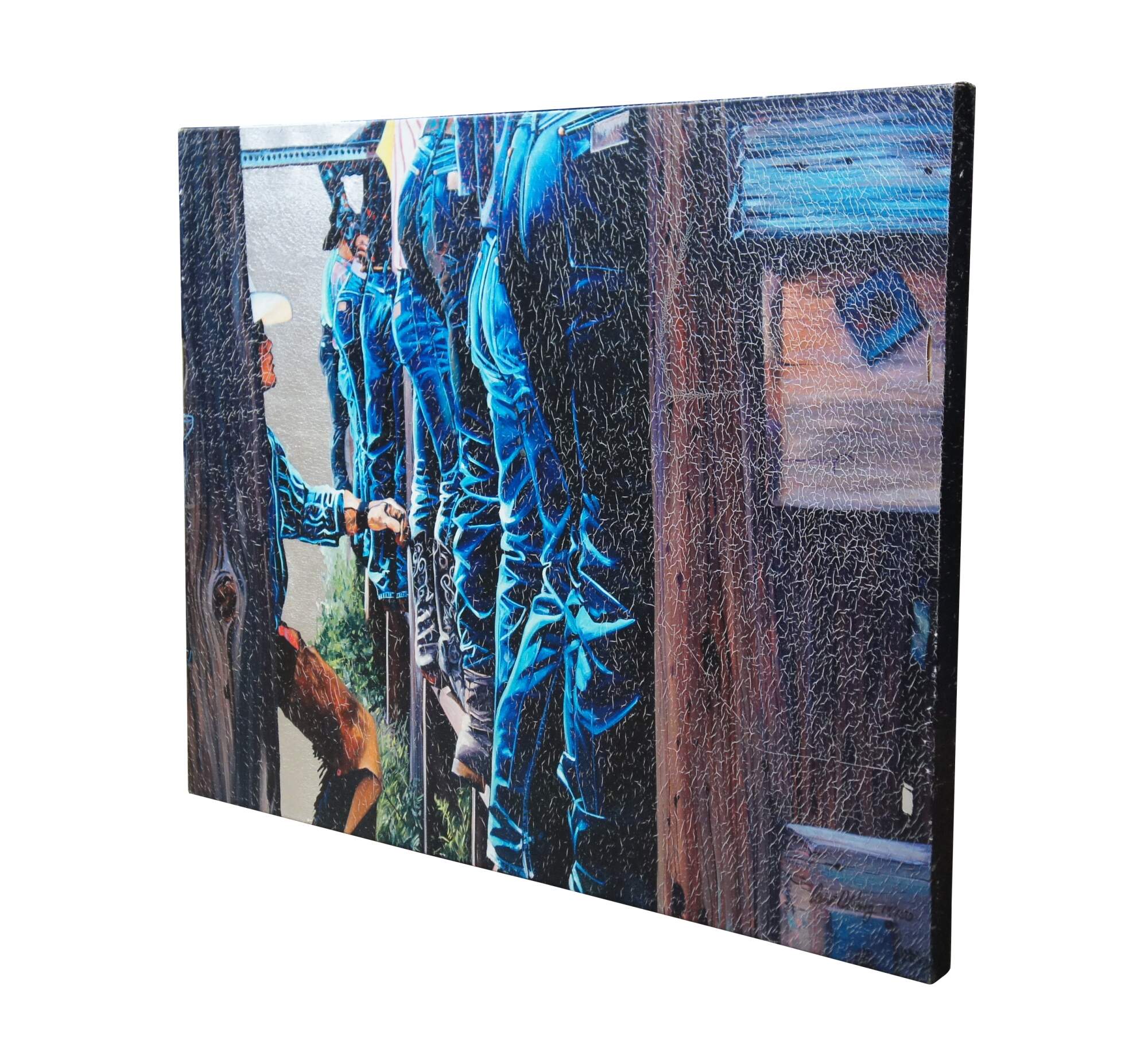 Late 20th century limited edition southwestern / western giclee on canvas print of "A Tale in Every Pair" by David DeVary. Depicts a row of jeans wearing cowboys standing perched on a wooden fence. Signed and numbered 14/150 in lower right. Unframed.