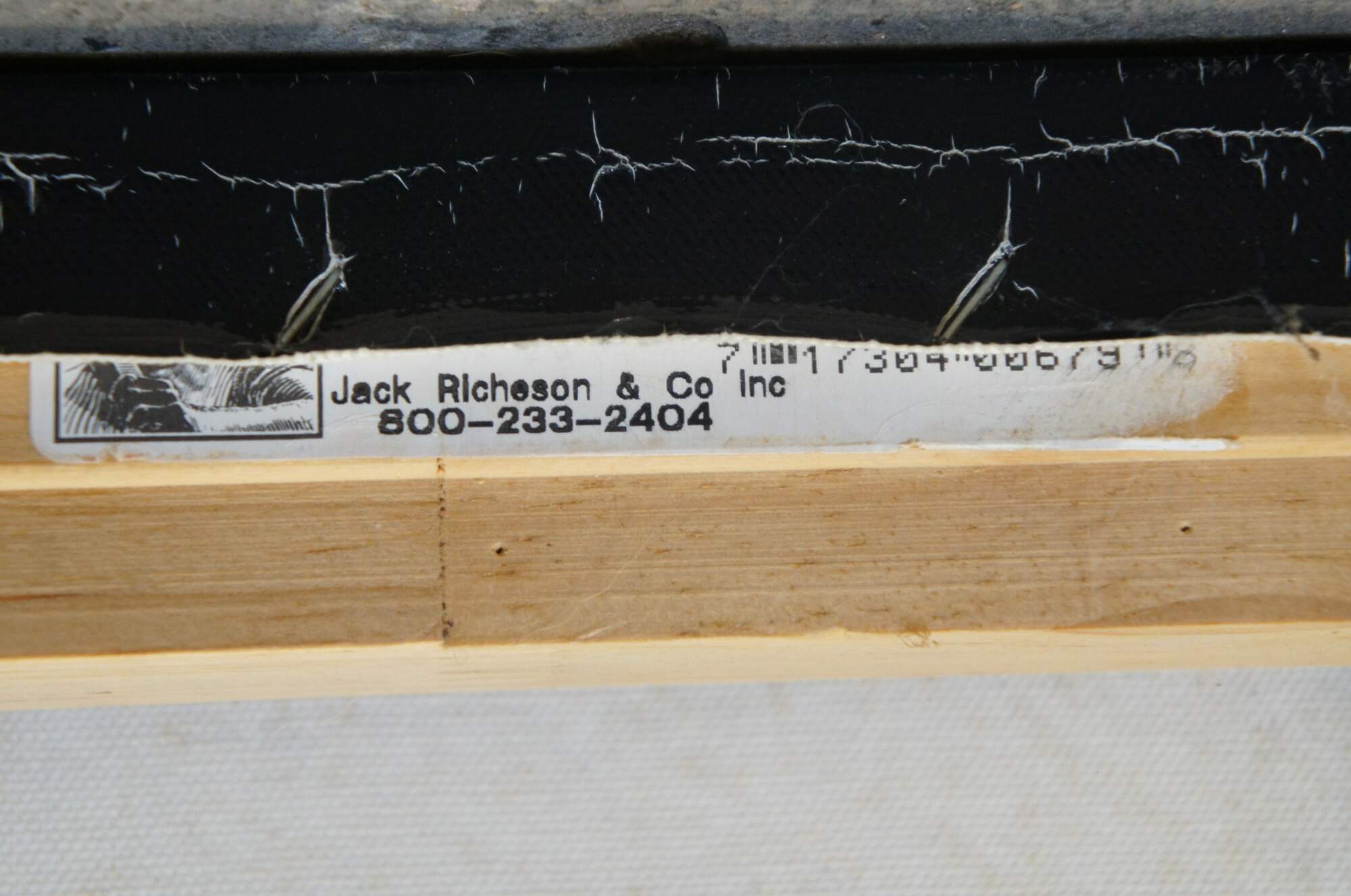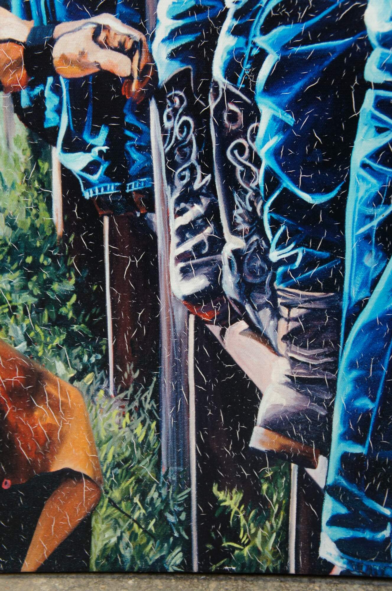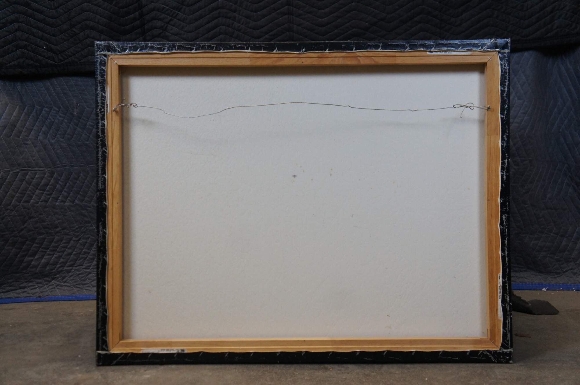 Late 20th century limited edition southwestern / western giclee on canvas print of "A Tale in Every Pair" by David DeVary. Depicts a row of jeans wearing cowboys standing perched on a wooden fence. Signed and numbered 14/150 in lower right. Unframed.