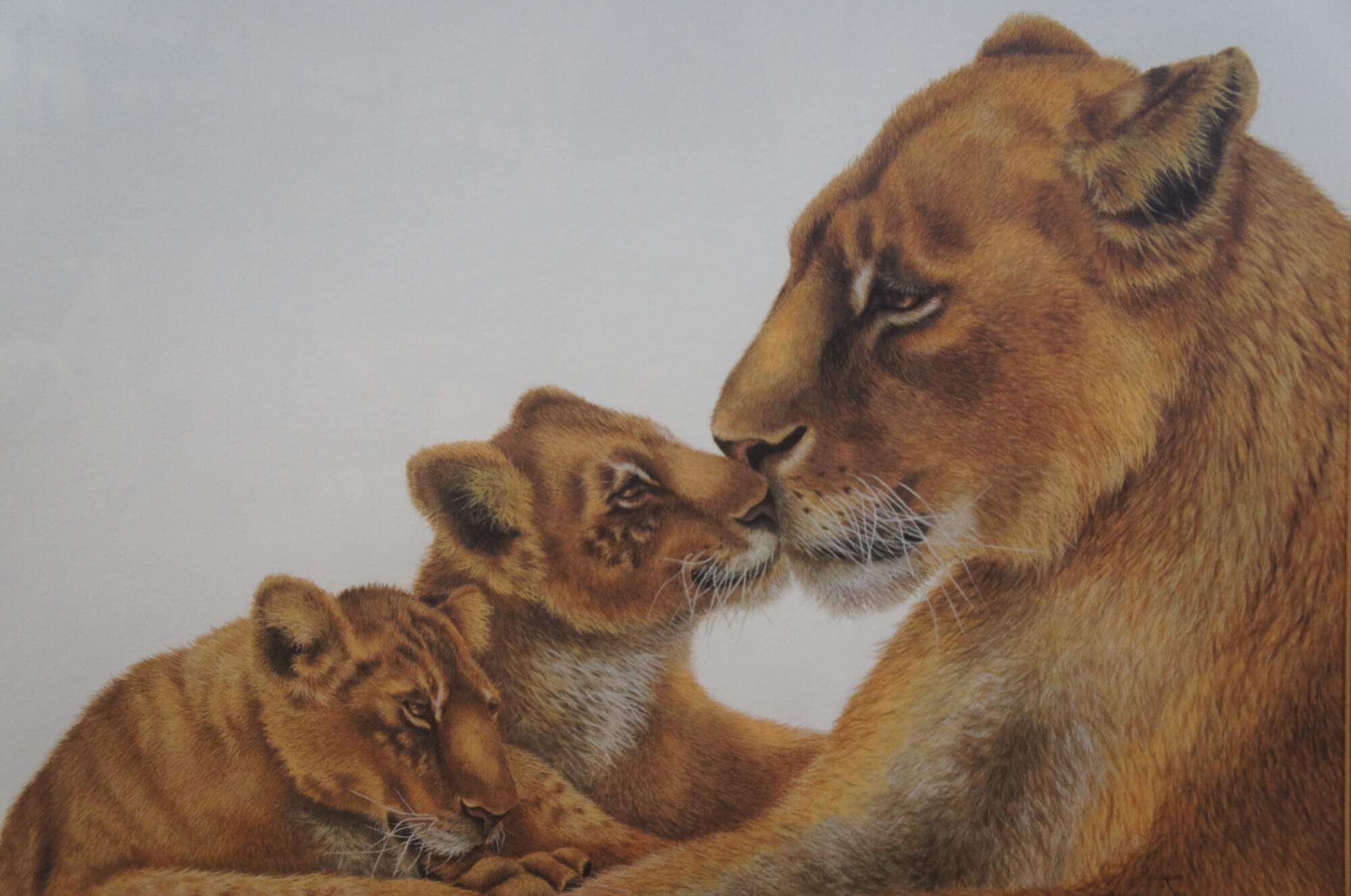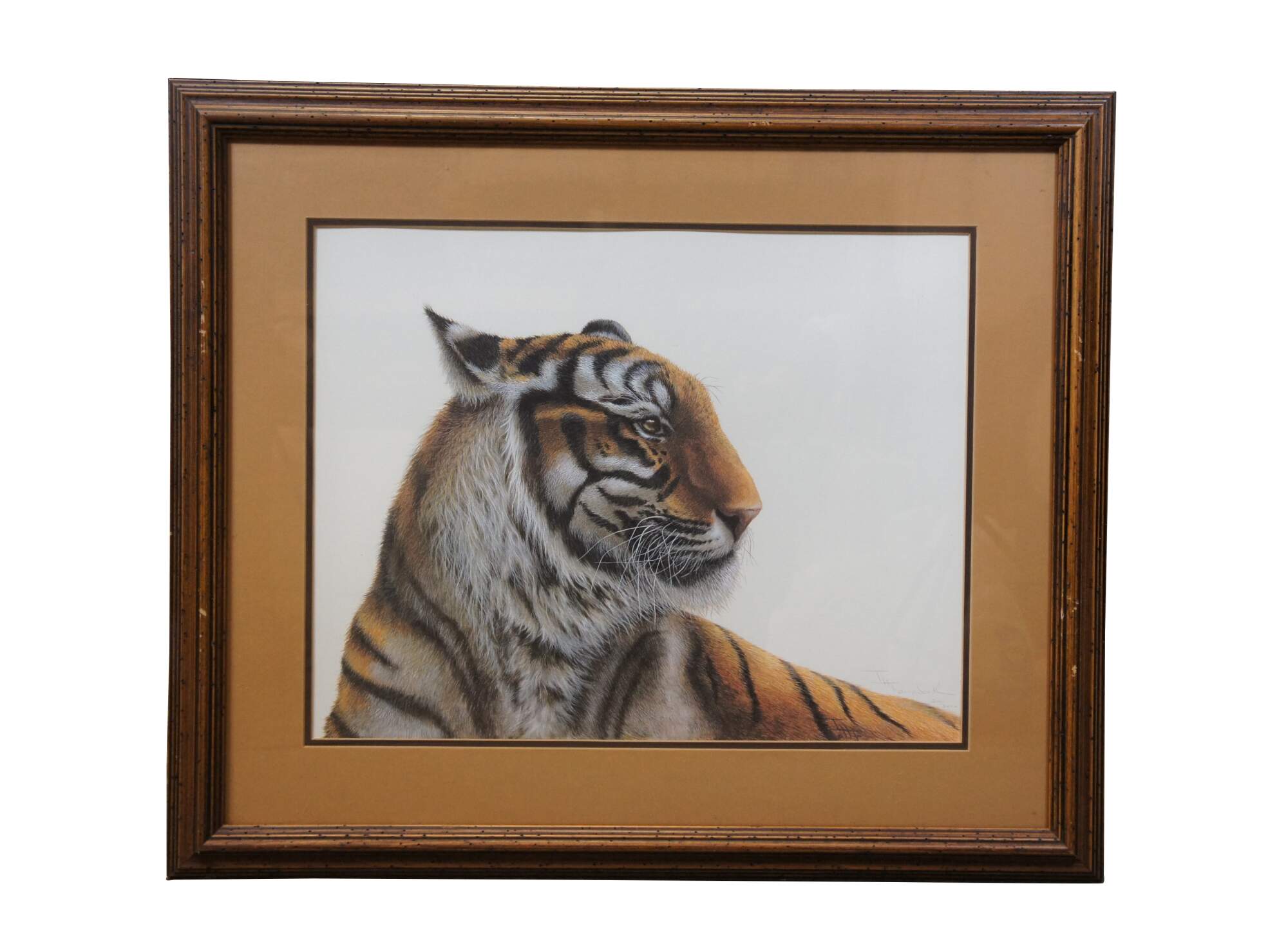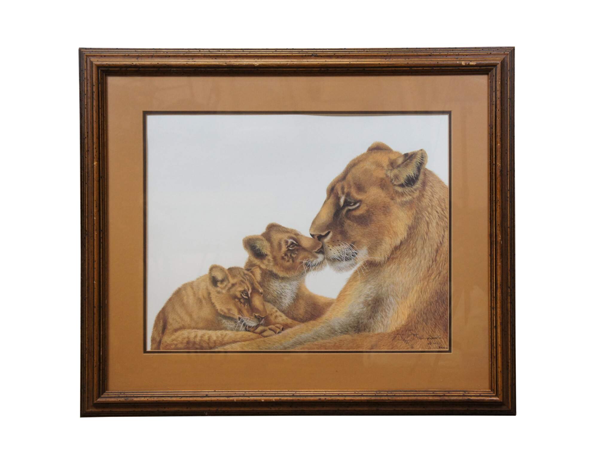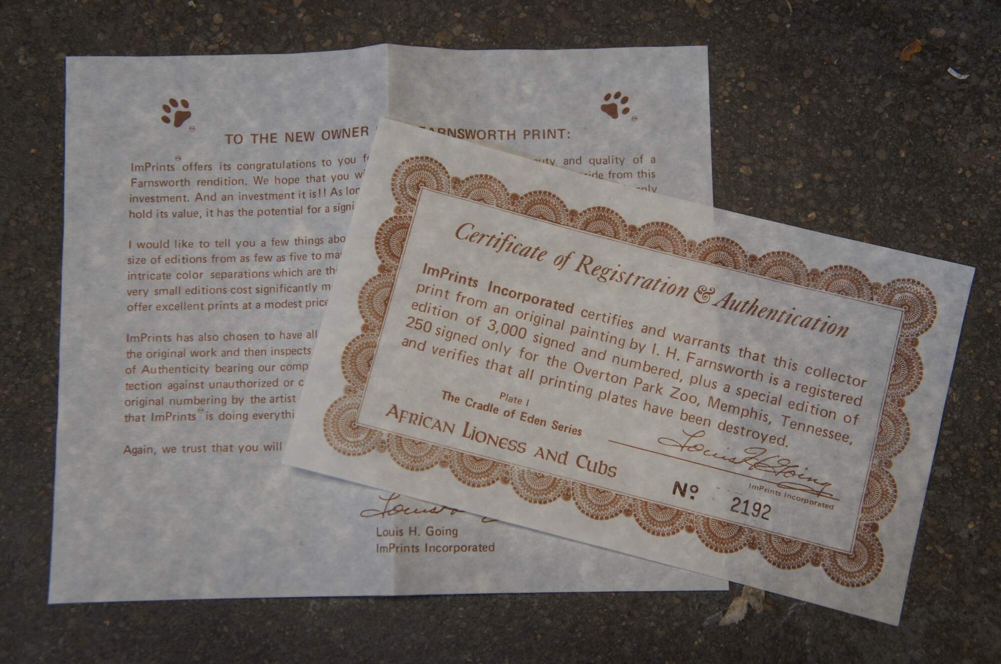Pair of late 20th century limited edition lithograph prints by Imogene Hudson Farnsworth. "The Wilderness Kings - Plate I - Tiger" (Includes biography and original envelope; No. 214/3000) and "African Lioness and Cubs" (Includes Certificate of Registration and Authentication, No. 2192/3000). Both signed and numbered in lower right. Produced by ImPrints Incorporated. Beveled wood frame; tan and brown layered mat.
