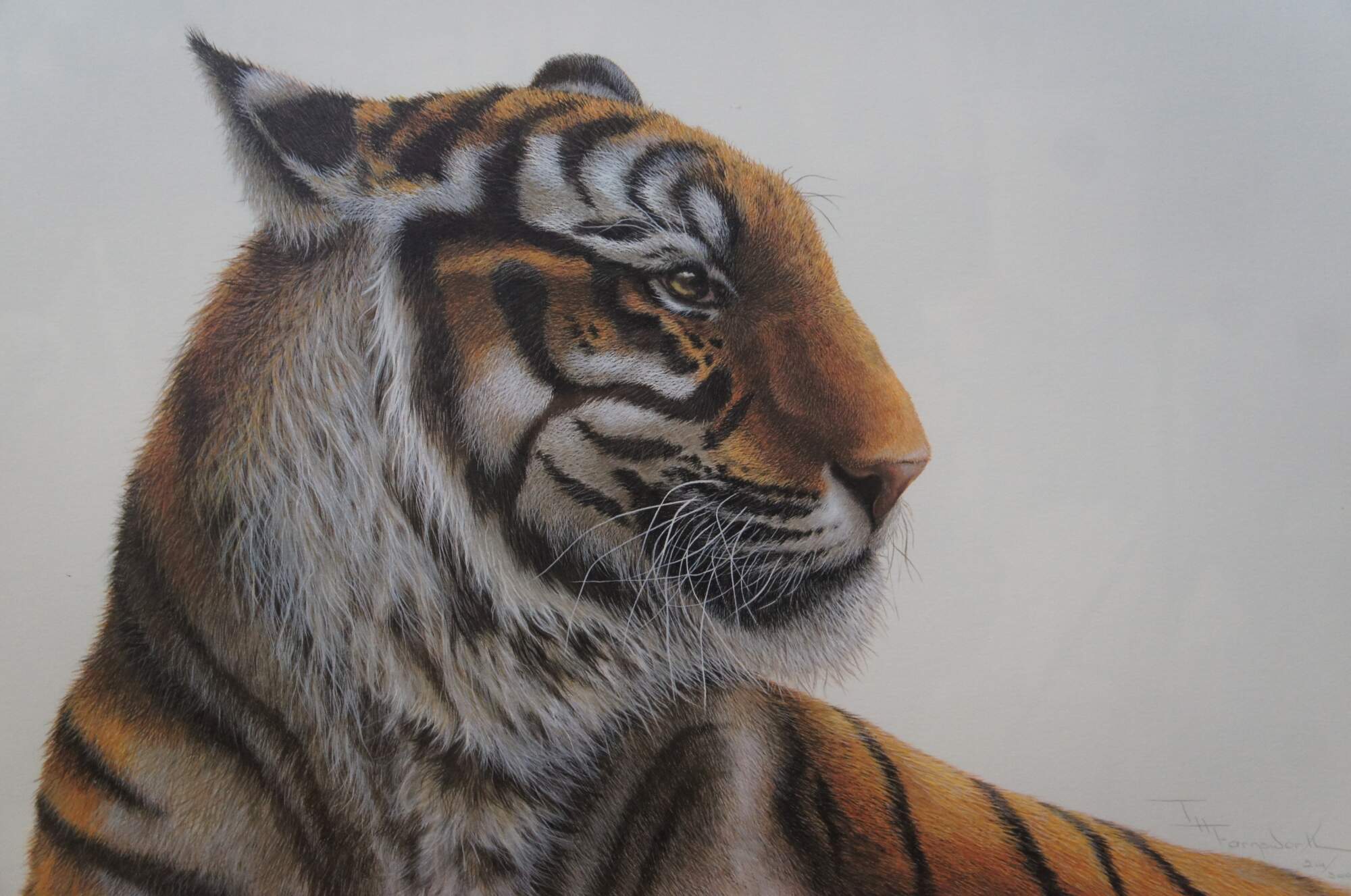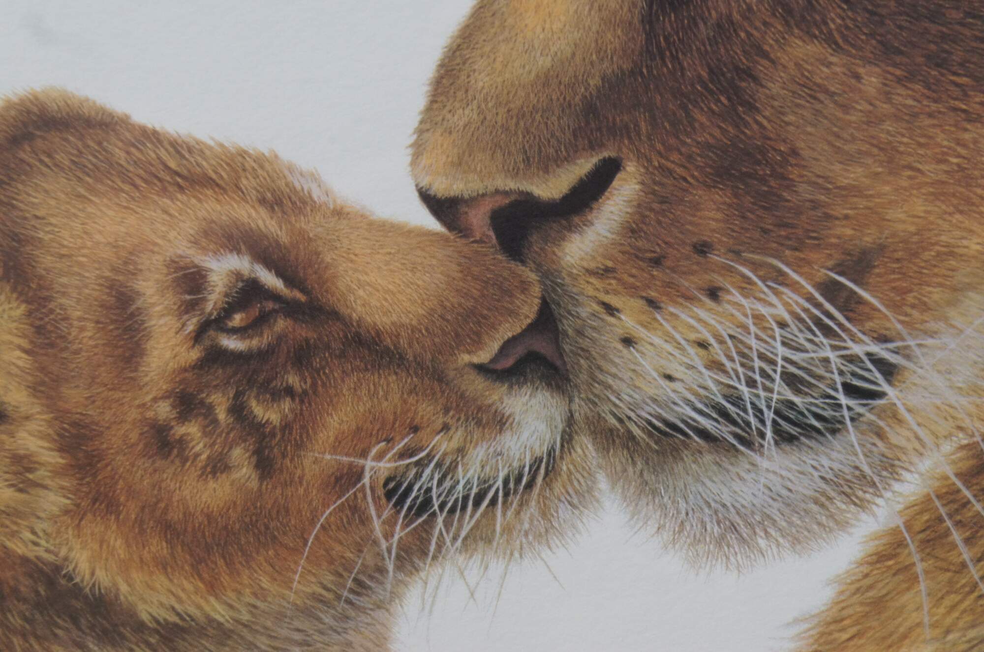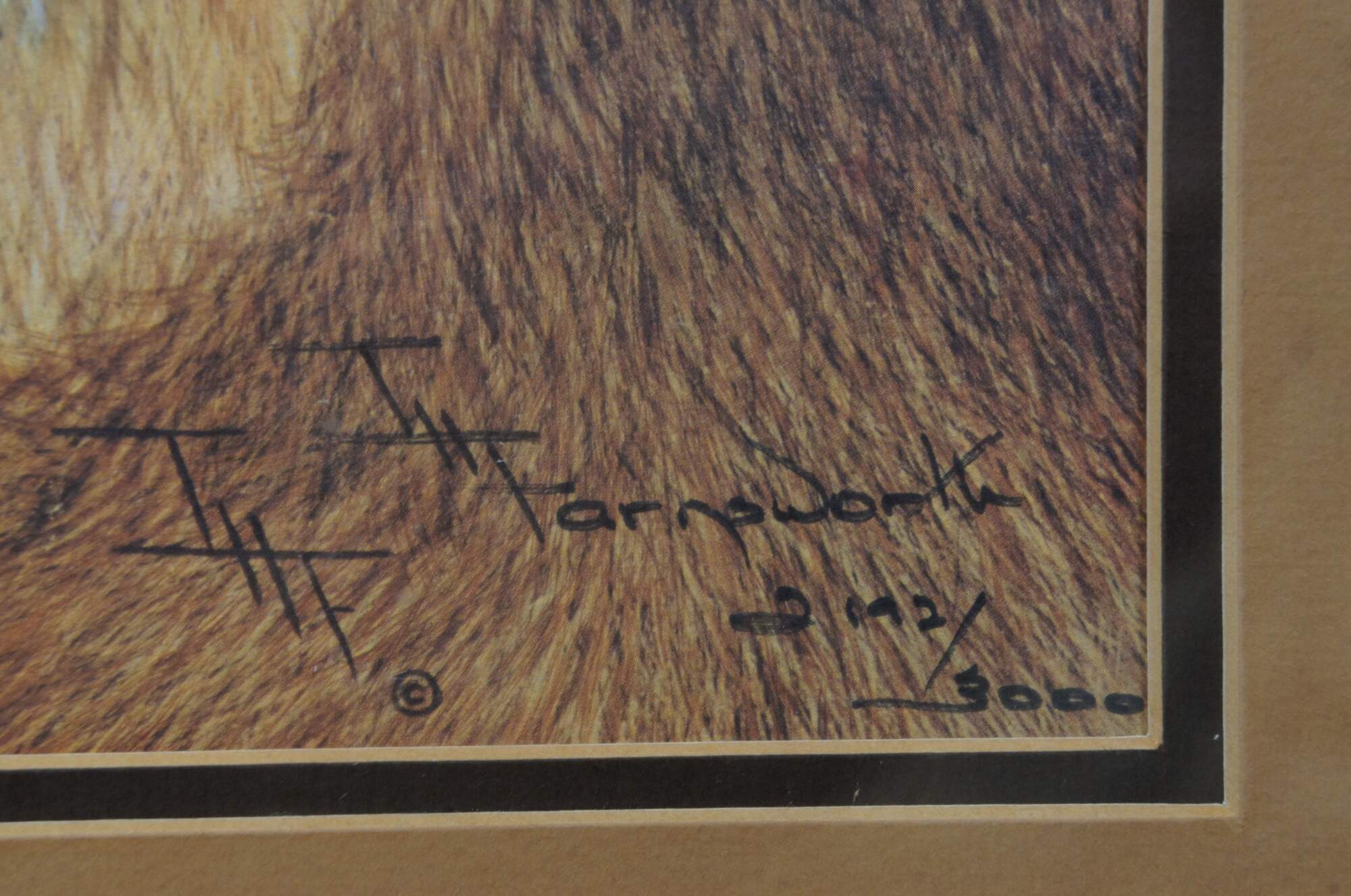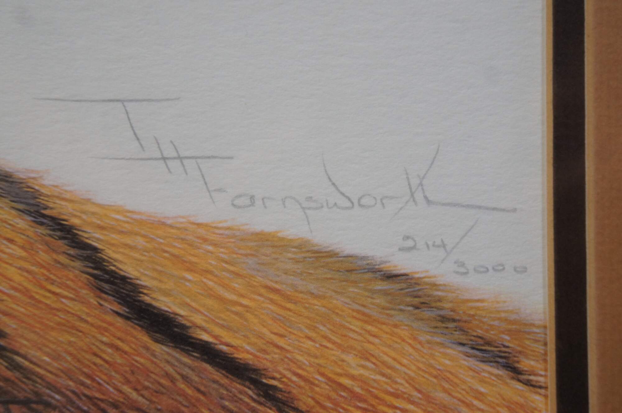Pair of late 20th century limited edition lithograph prints by Imogene Hudson Farnsworth. "The Wilderness Kings - Plate I - Tiger" (Includes biography and original envelope; No. 214/3000) and "African Lioness and Cubs" (Includes Certificate of Registration and Authentication, No. 2192/3000). Both signed and numbered in lower right. Produced by ImPrints Incorporated. Beveled wood frame; tan and brown layered mat.