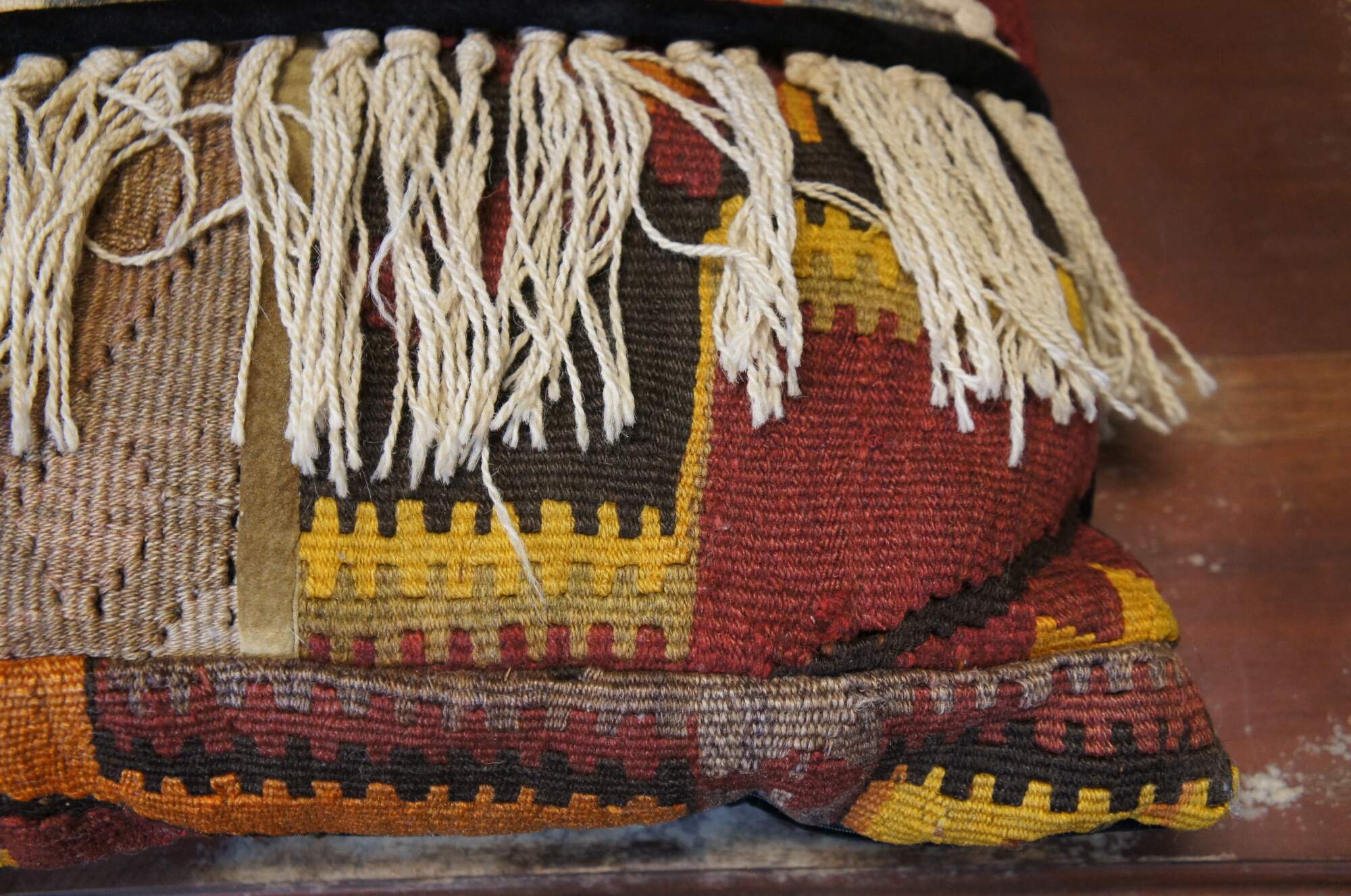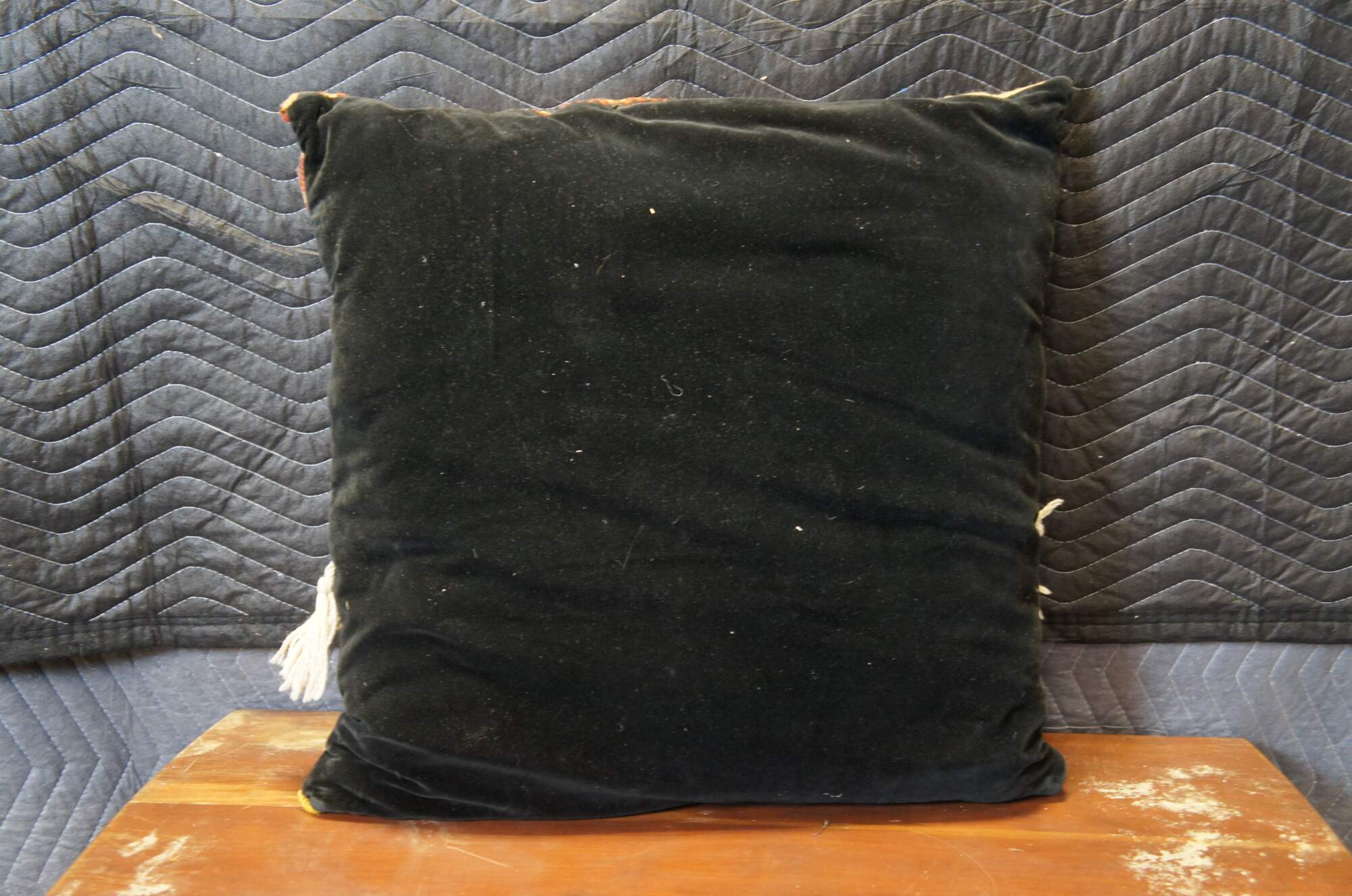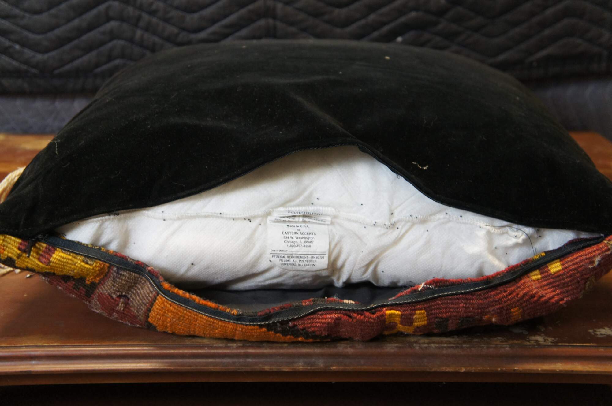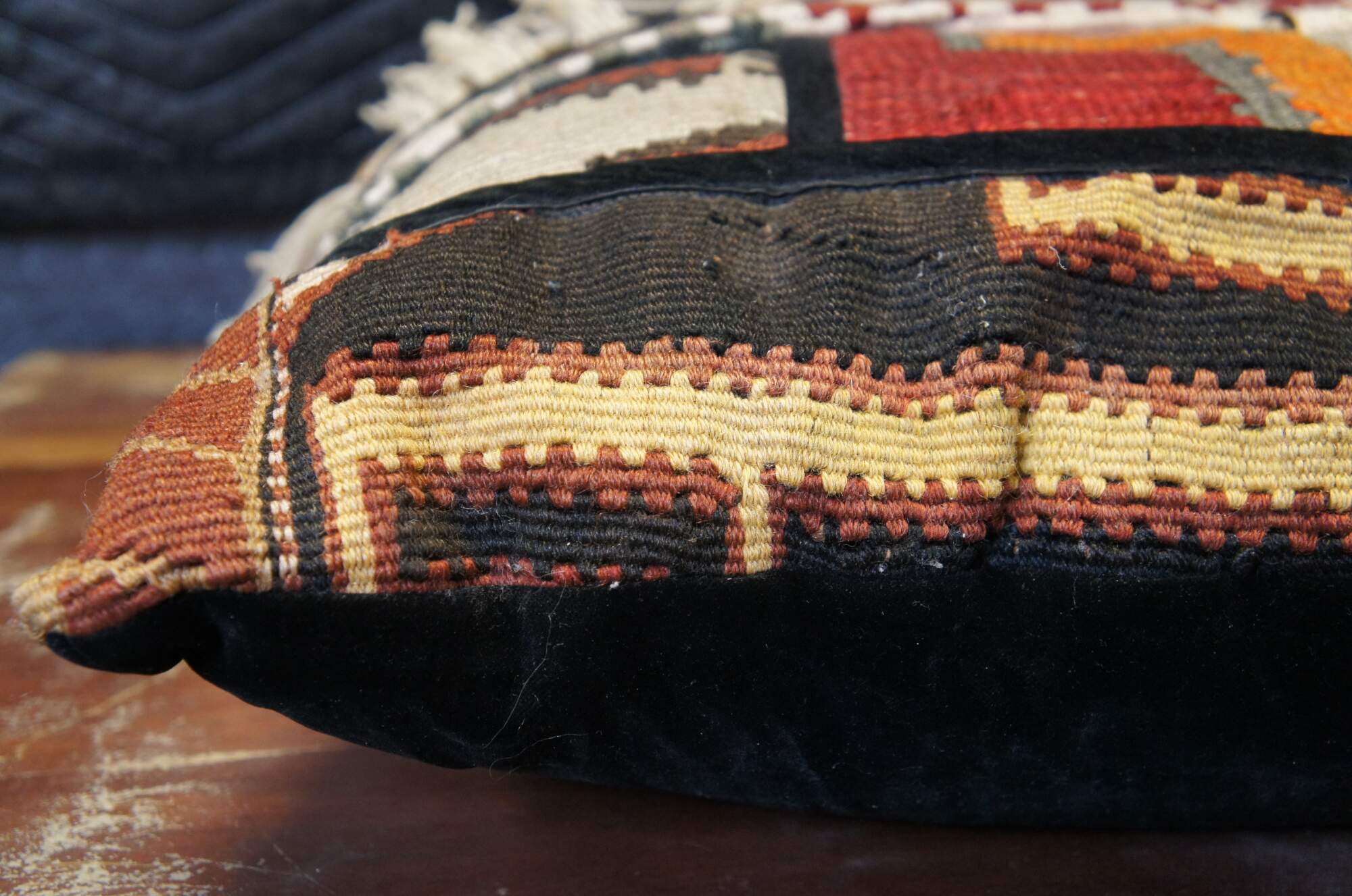 Late 20th century Eastern Accents patchwork kilim style woven wool throw / accent pillow with black velvet trim and white tassel fringe. Black velvet back. Polyester fiber fill. Zipper closure.