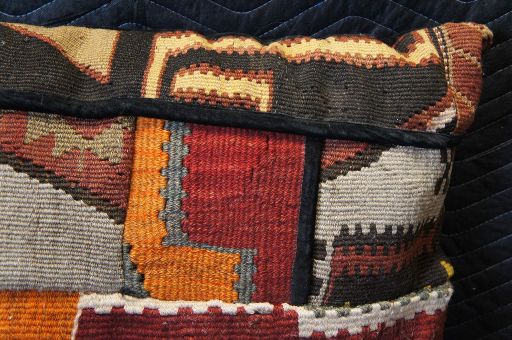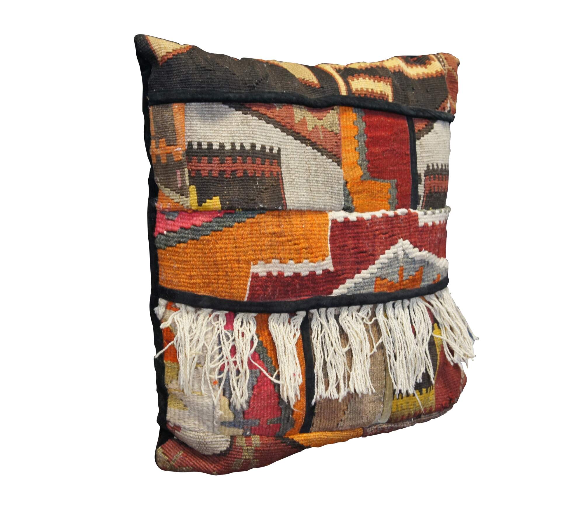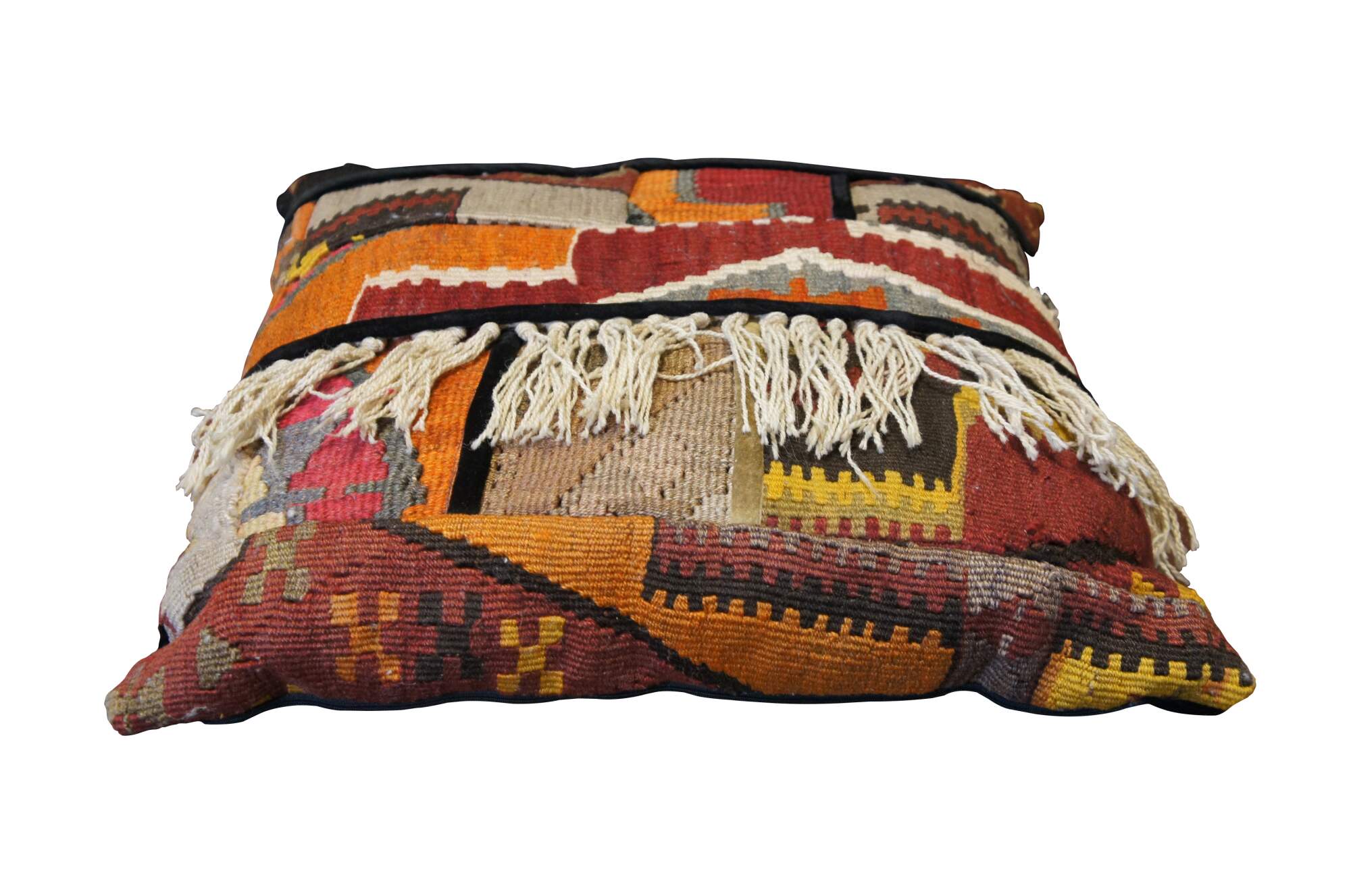 Late 20th century Eastern Accents patchwork kilim style woven wool throw / accent pillow with black velvet trim and white tassel fringe. Black velvet back. Polyester fiber fill. Zipper closure.