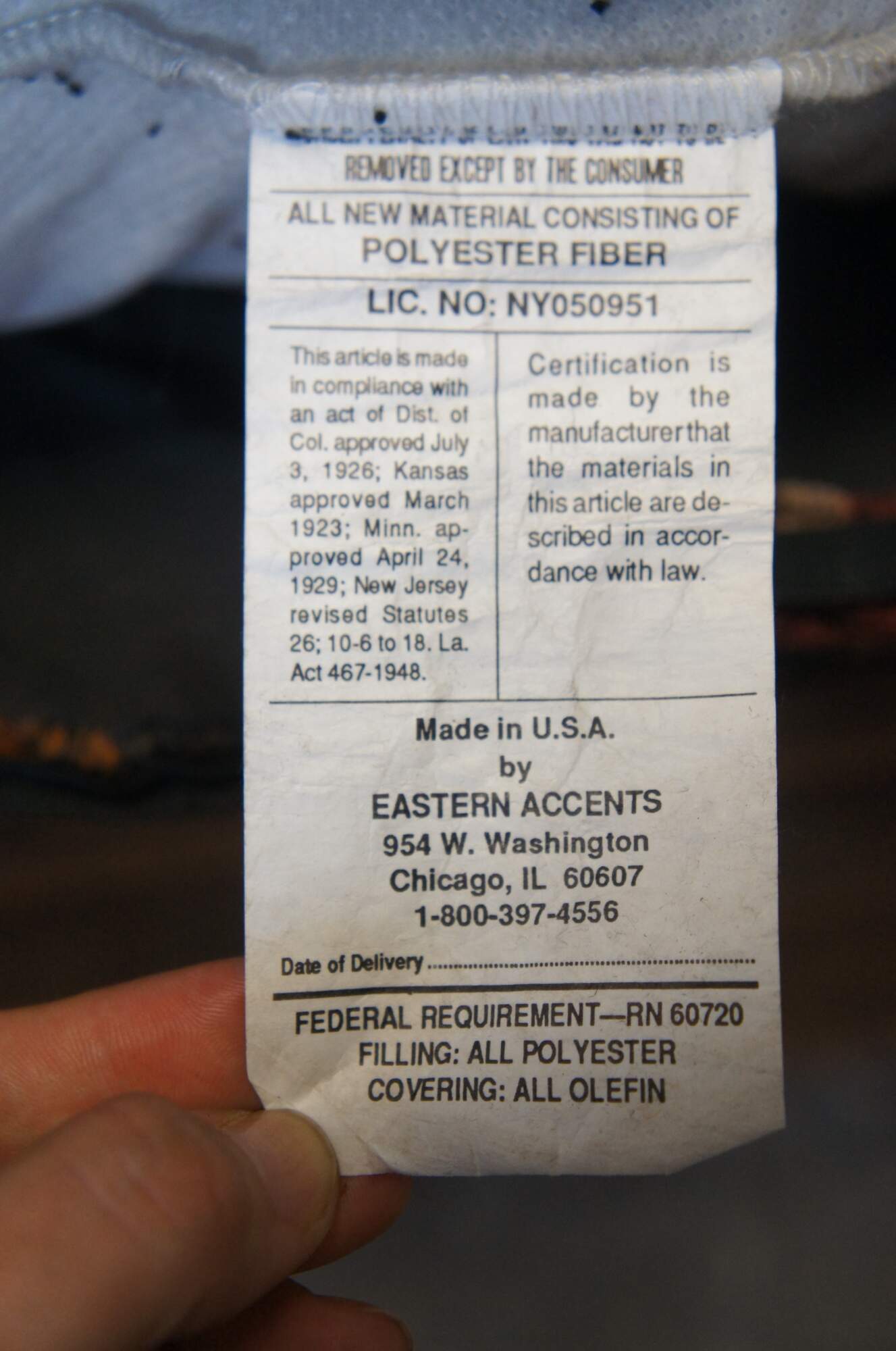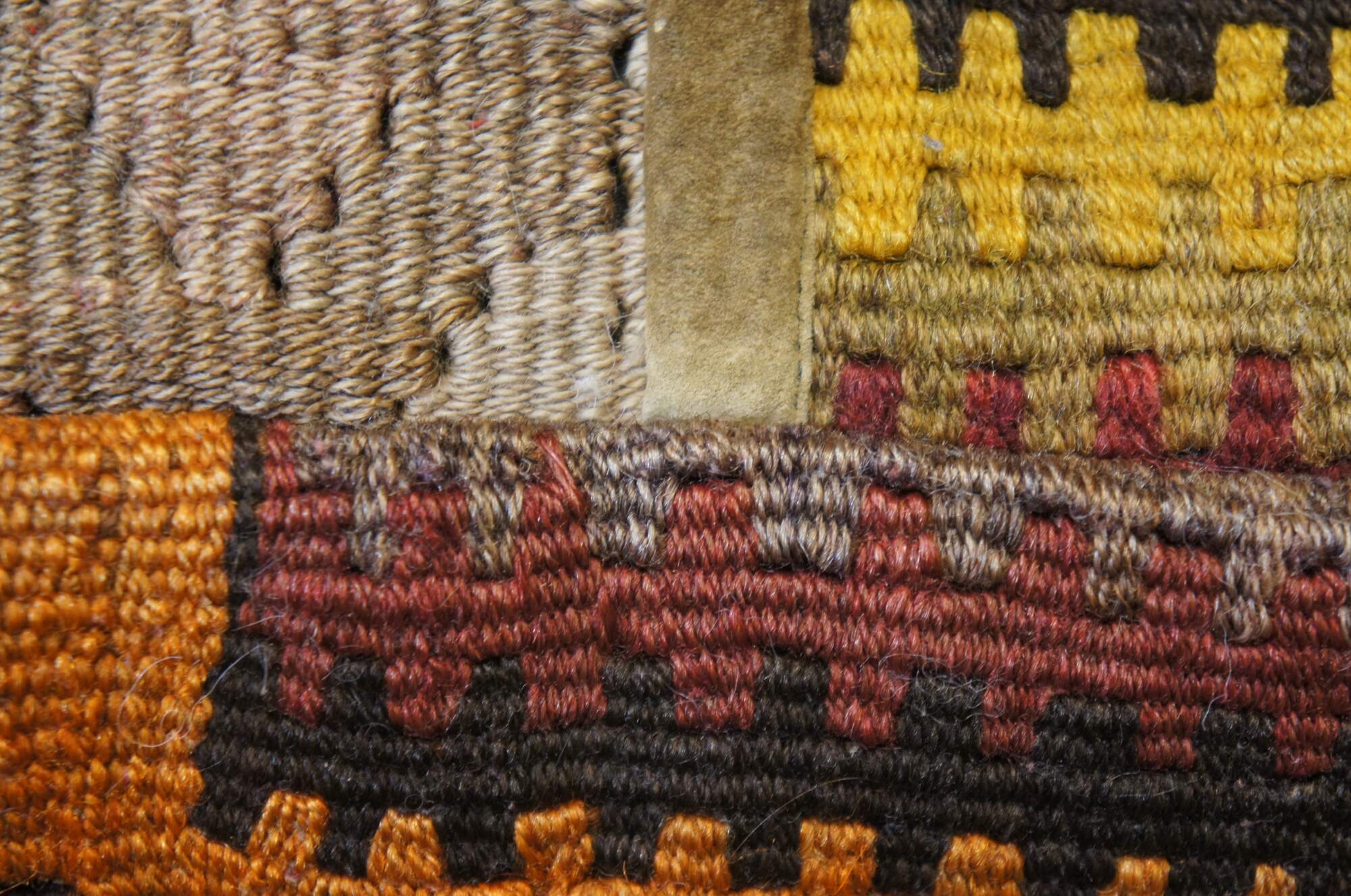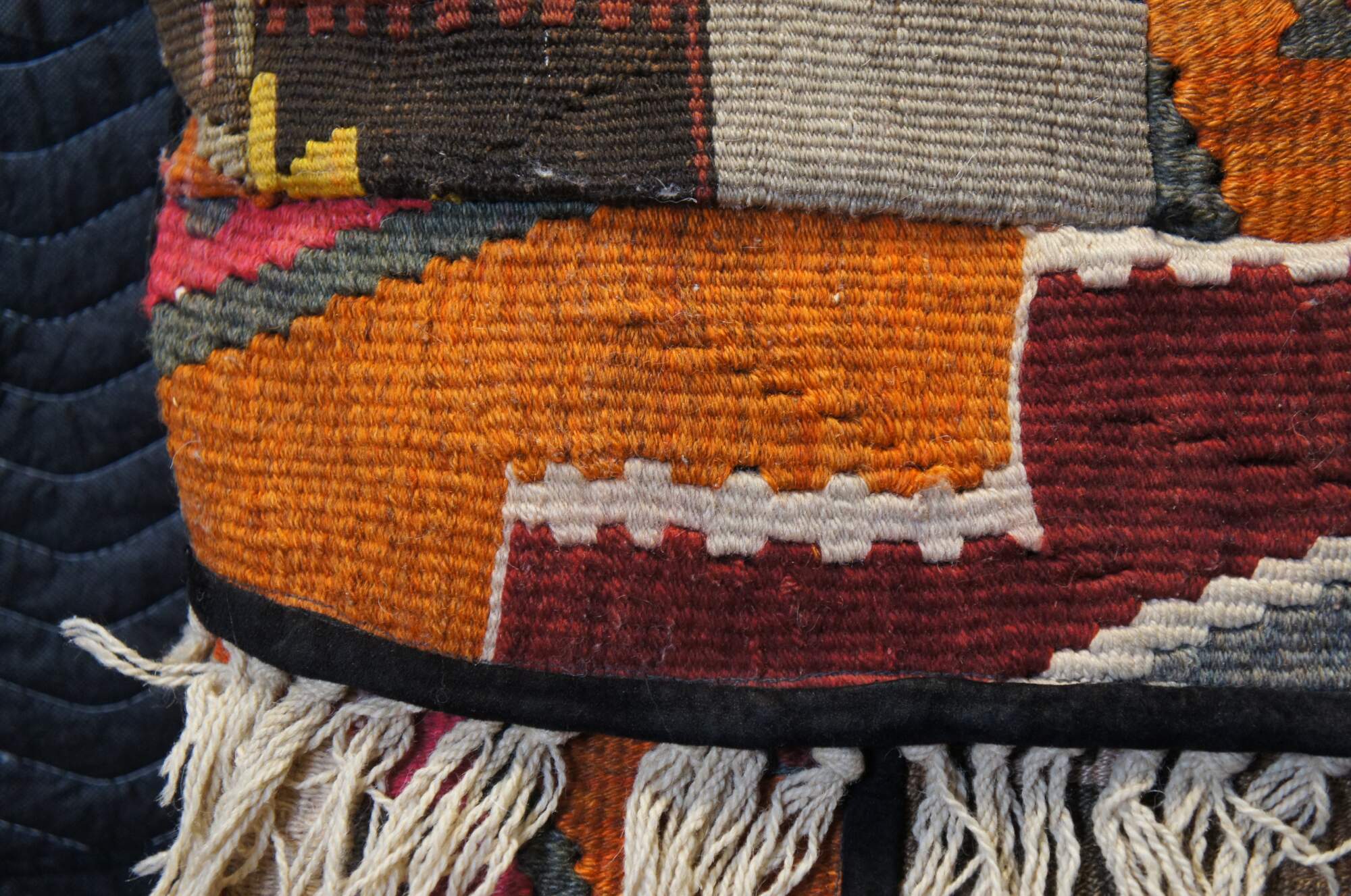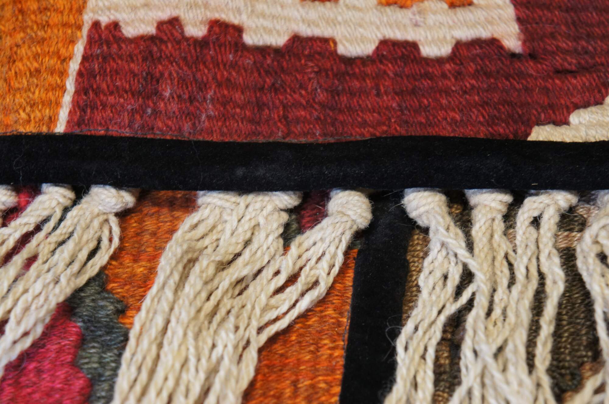 Late 20th century Eastern Accents patchwork kilim style woven wool throw / accent pillow with black velvet trim and white tassel fringe. Black velvet back. Polyester fiber fill. Zipper closure.