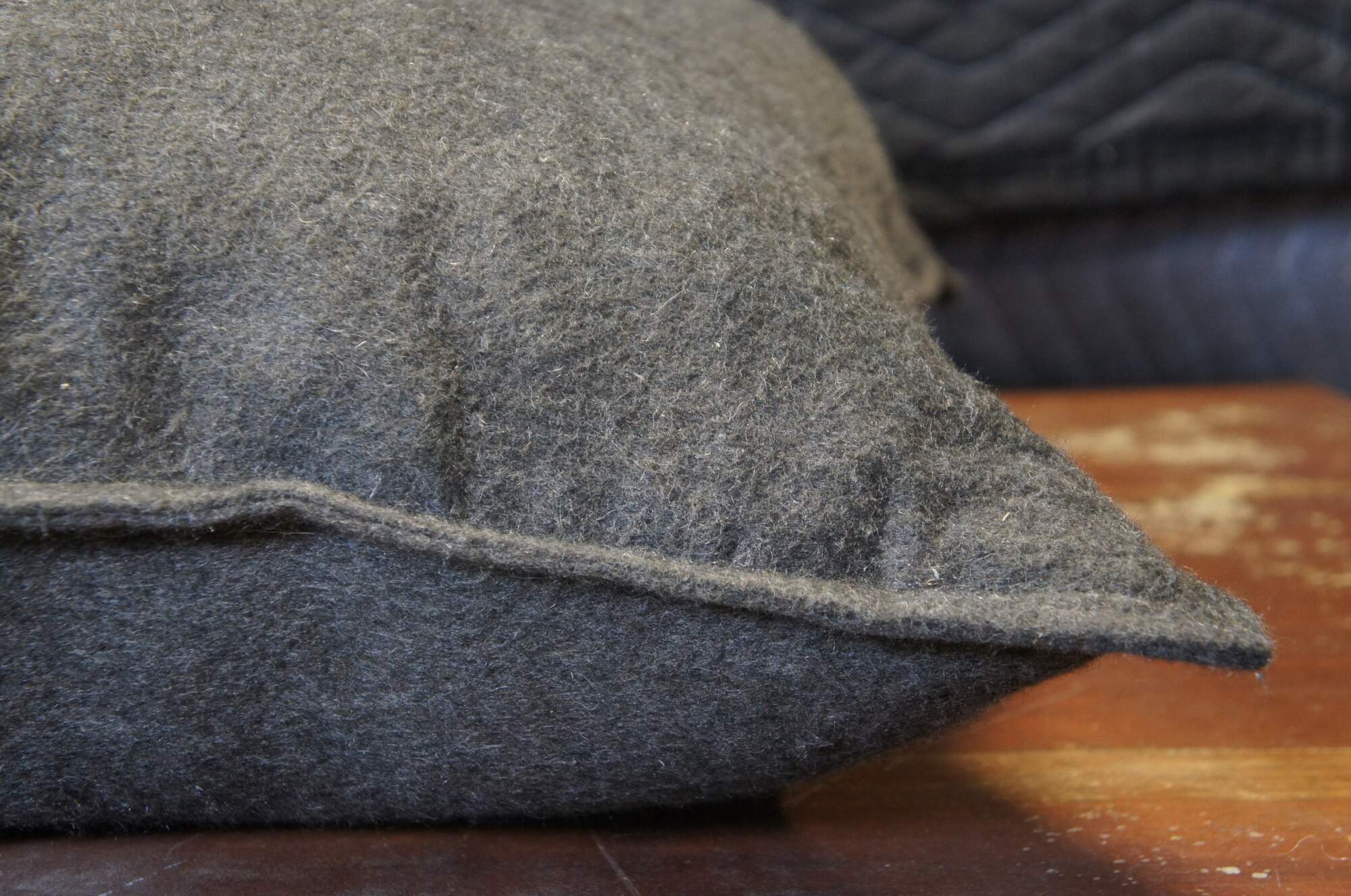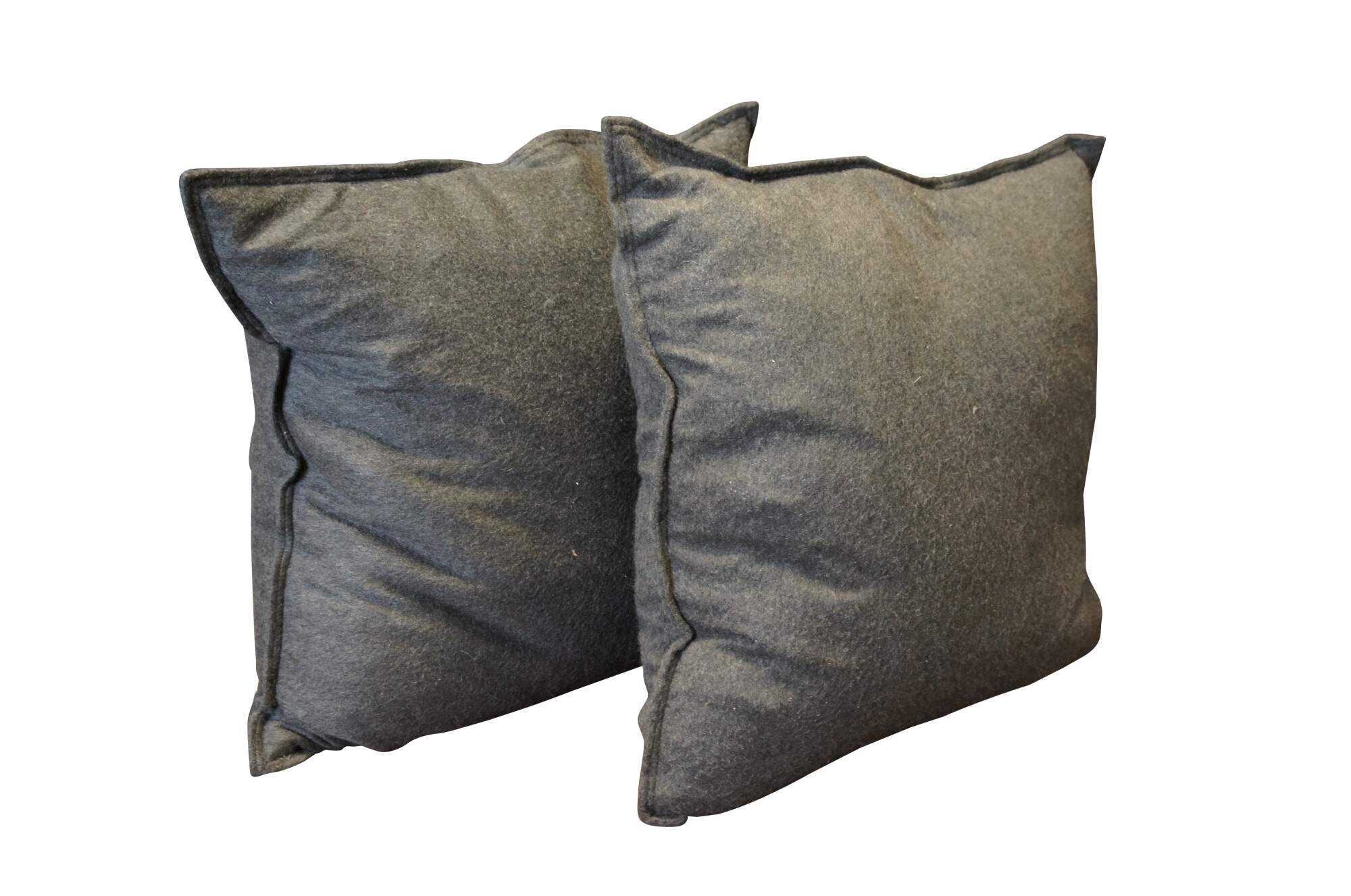 Large pair of Restoration Hardware felted charcoal gray, 100% cashmere square throw pillows; down / waterfowl feather filled. Zipper closure.