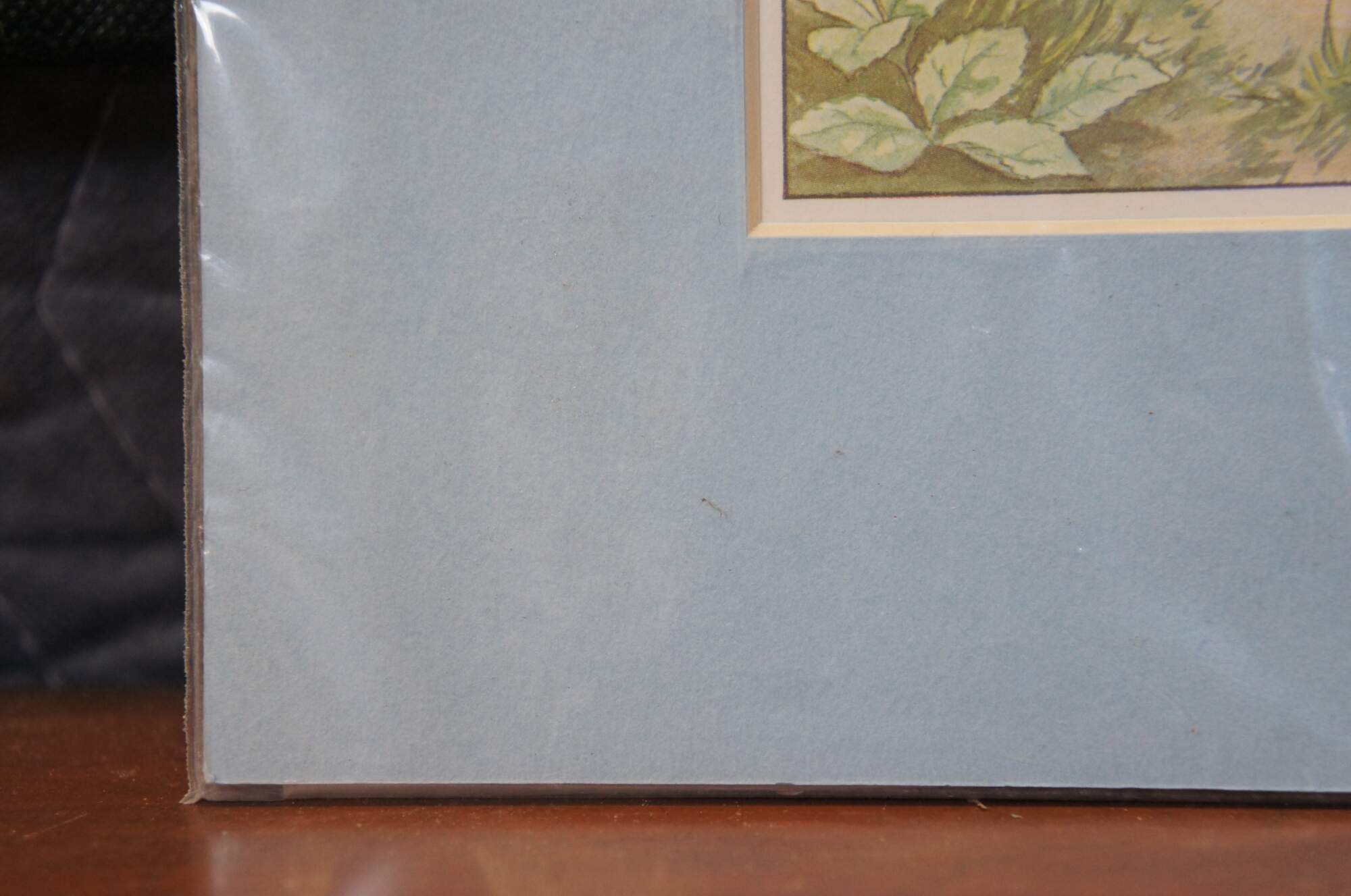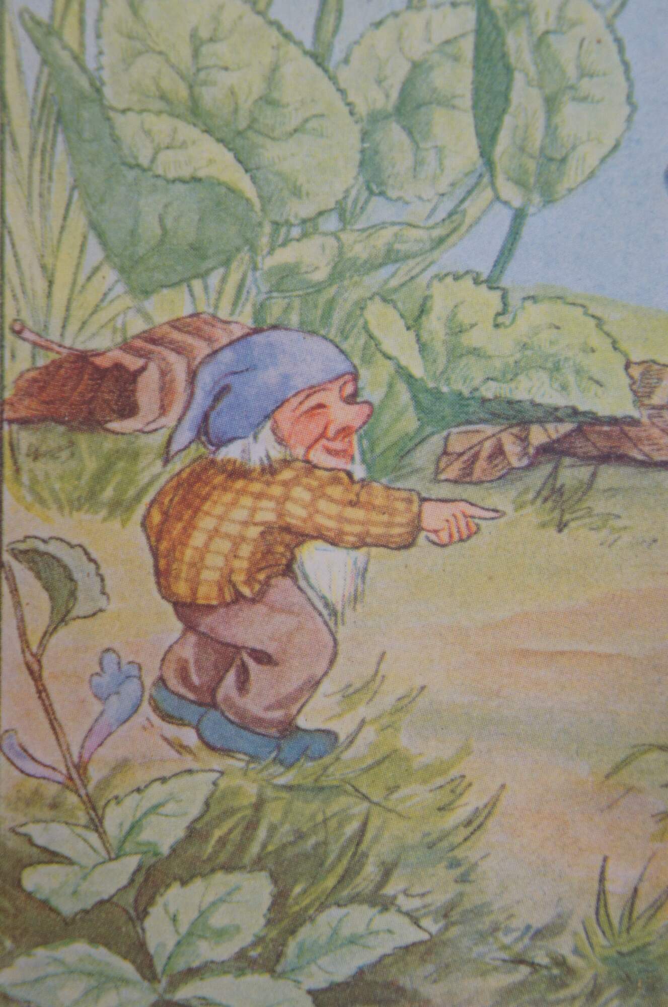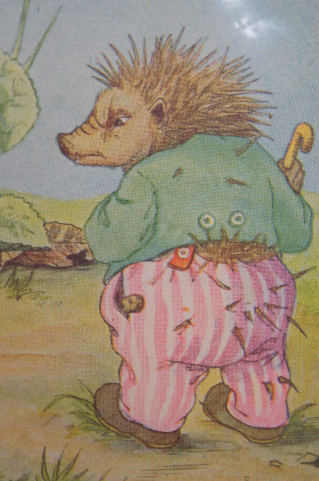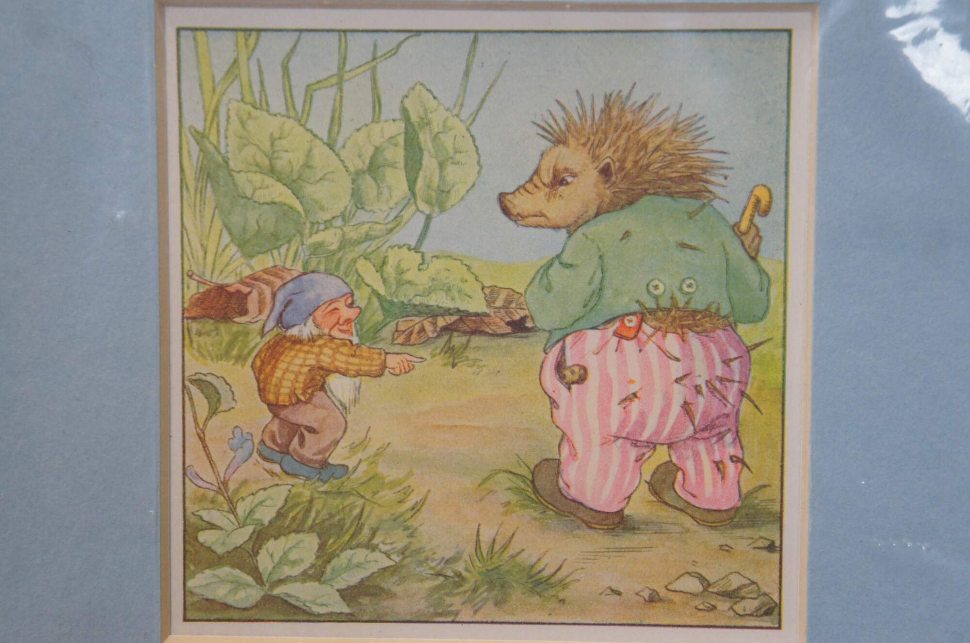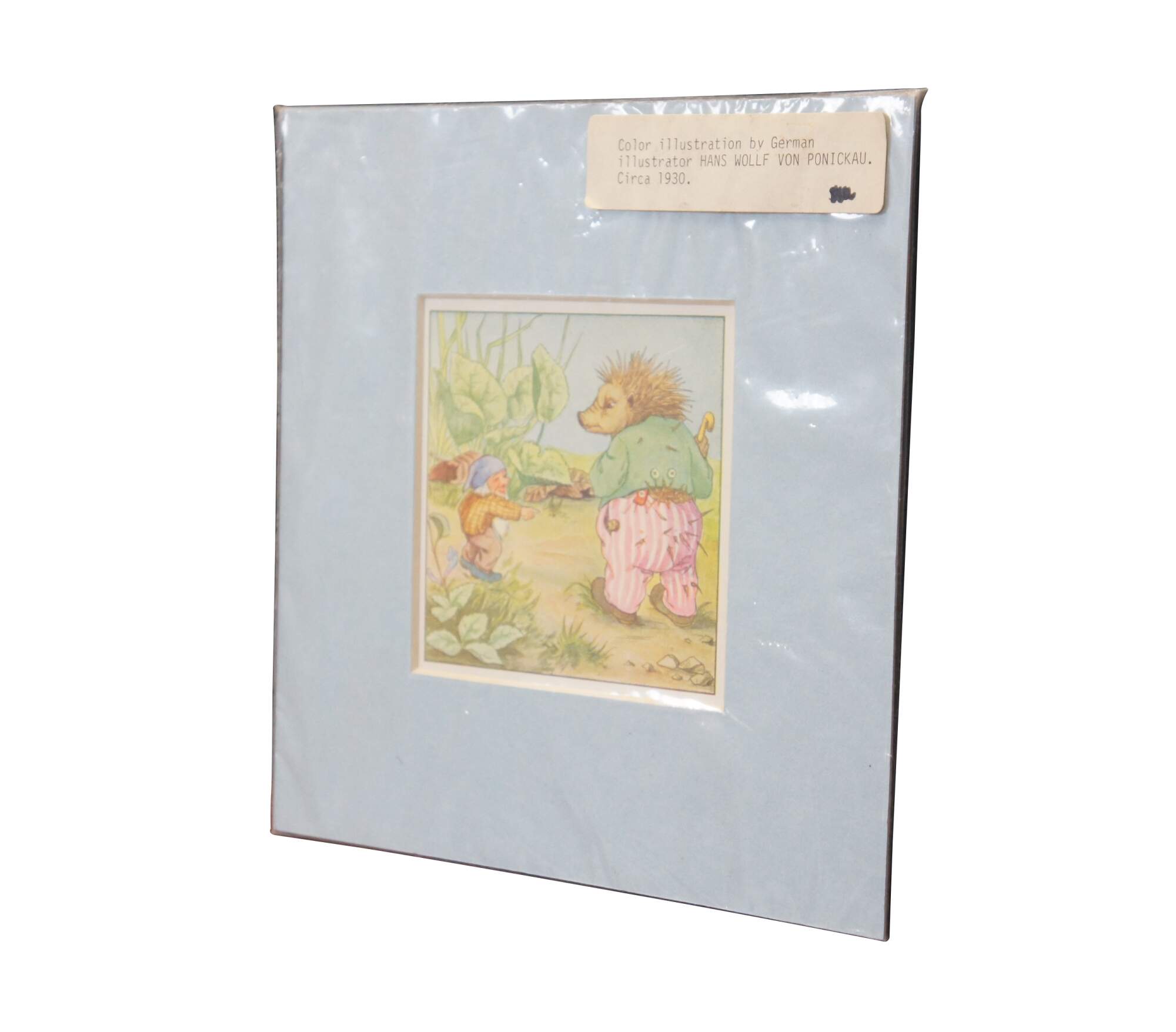 Circa 1930s color lithograph print depicting an illustration by Hans Wolff von Ponickau from a German children's fairy tale book, showing an anthropomorphic hedgehog being teased by a small garden gnome. A charming, whimsical image to dcorate a baby's room. Baby blue mat; sealed in plastic.