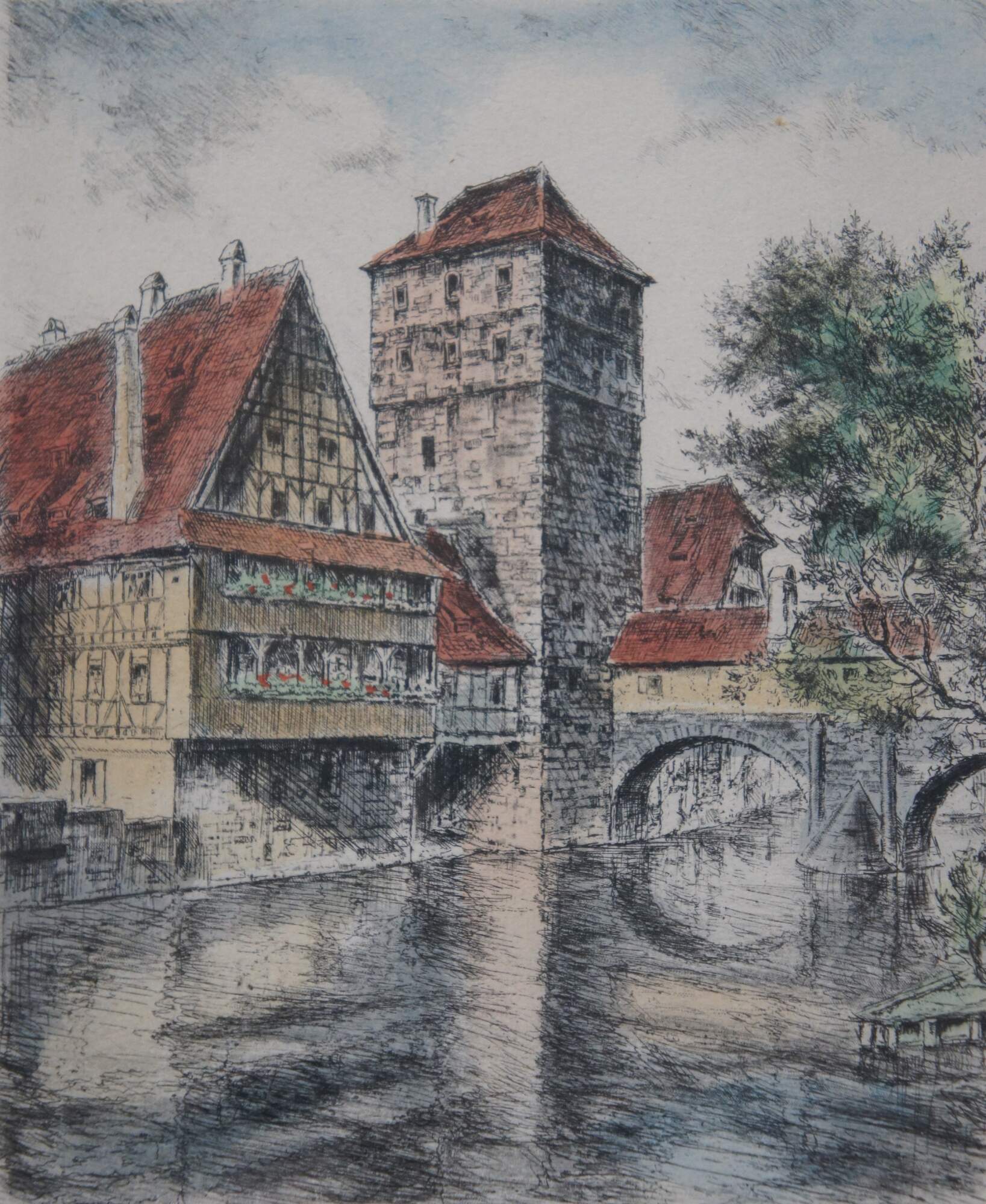 Mid to early 20th century hand colored etching depicting a view of the Hangmans Bridge over the canal through Nuremburg, Germany. Pencil signed along lower edge. Beveled silver gilt frame; off-white mat.