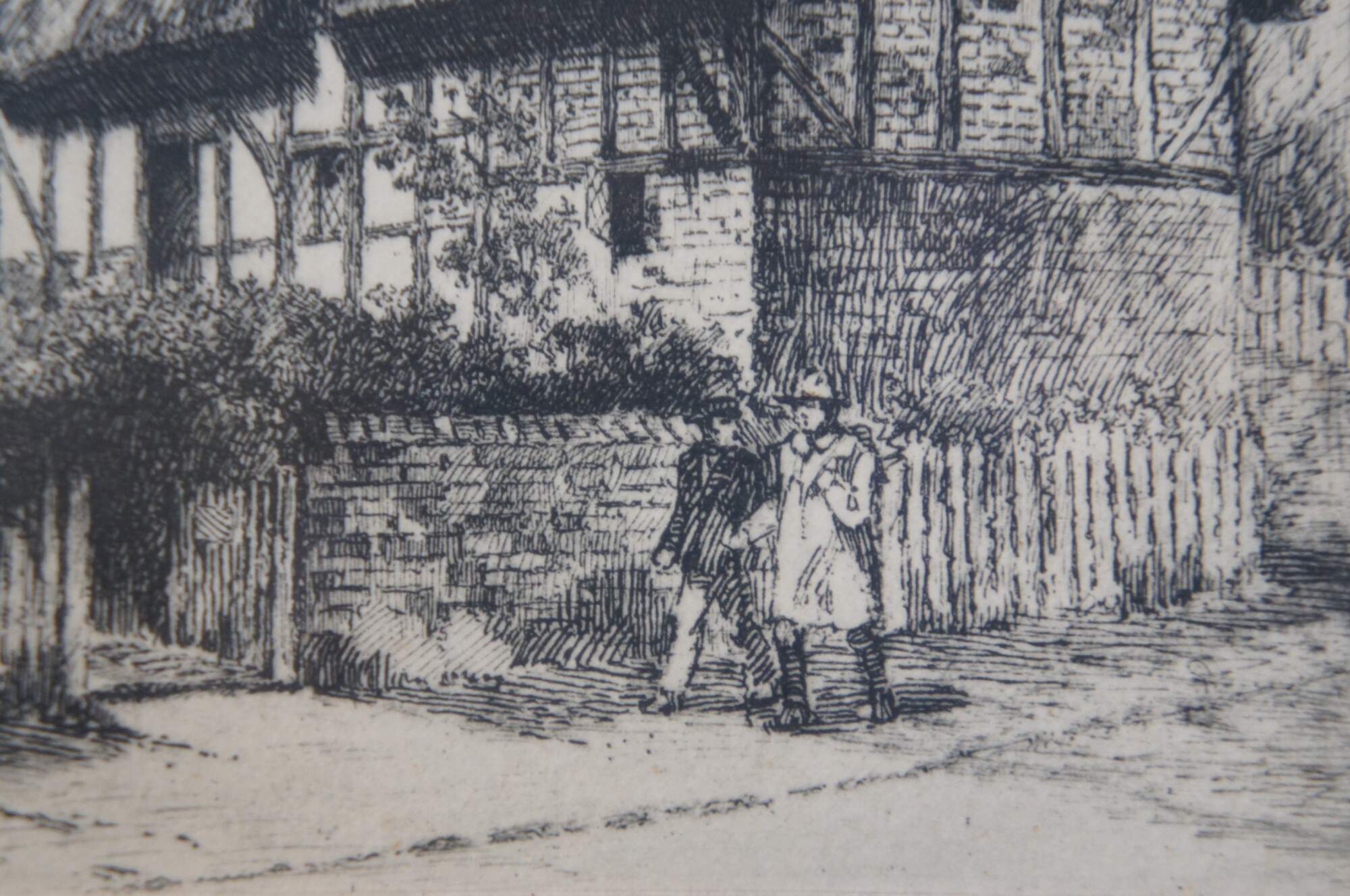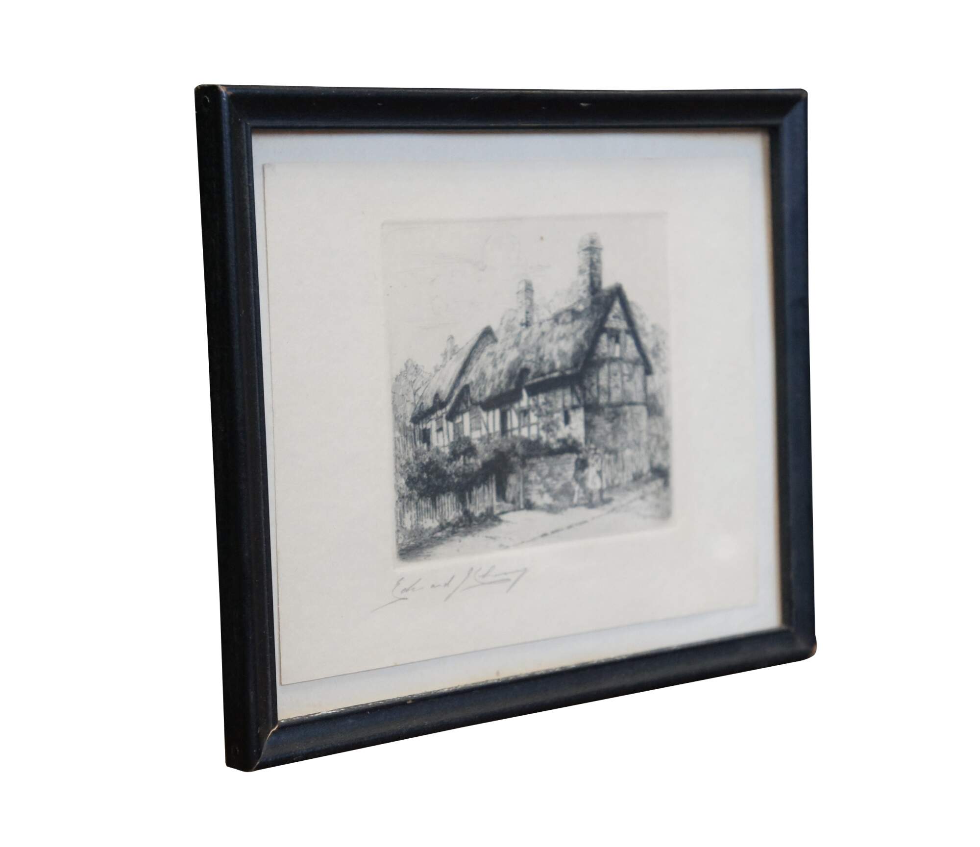 Vintage 20th century black and white etching by edward J. Cherry depicting a view of two men walking in front of the cottage of anne Hathaway (wife of William Shakespeare). Pencil signed along lower edge.