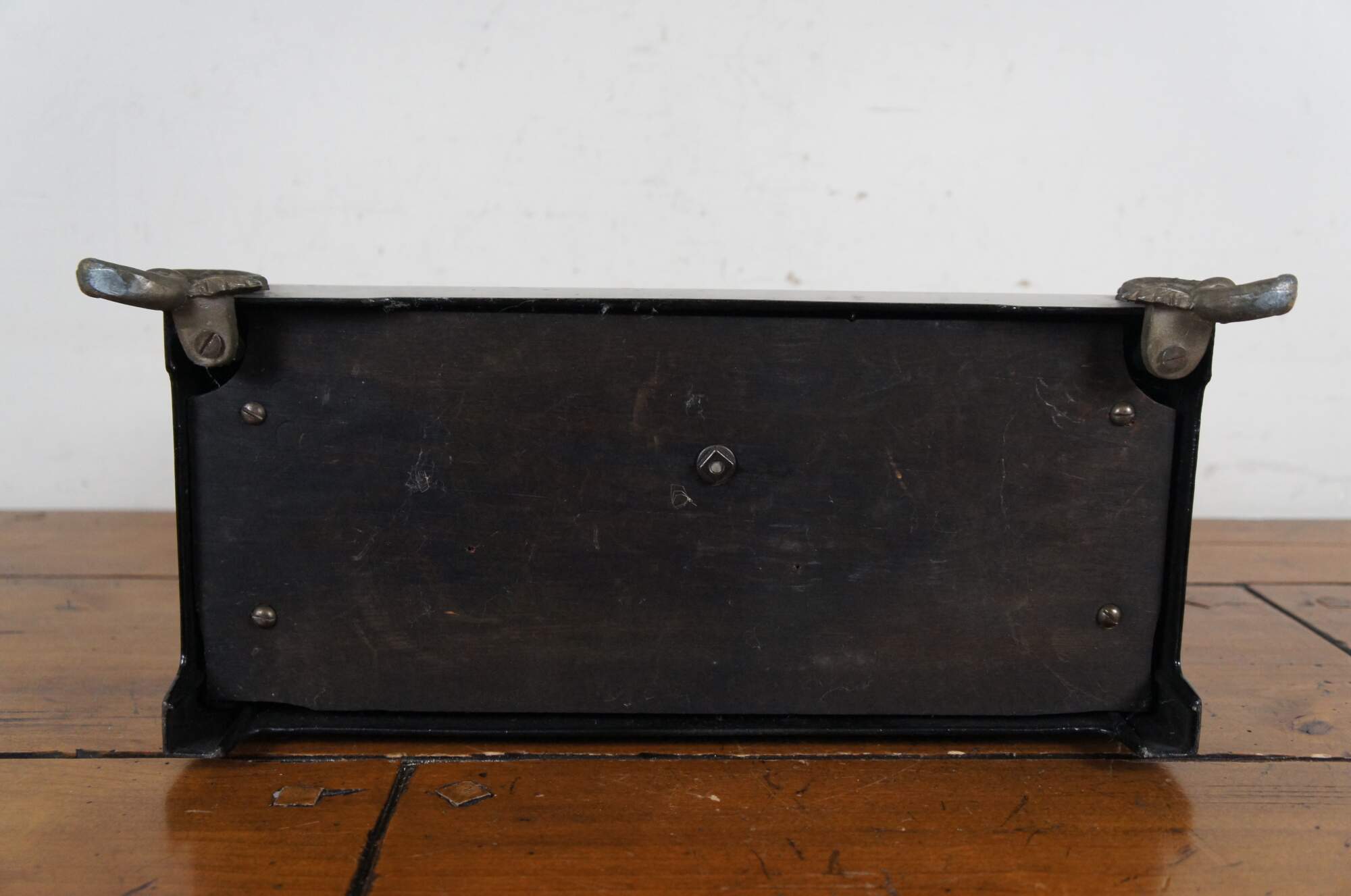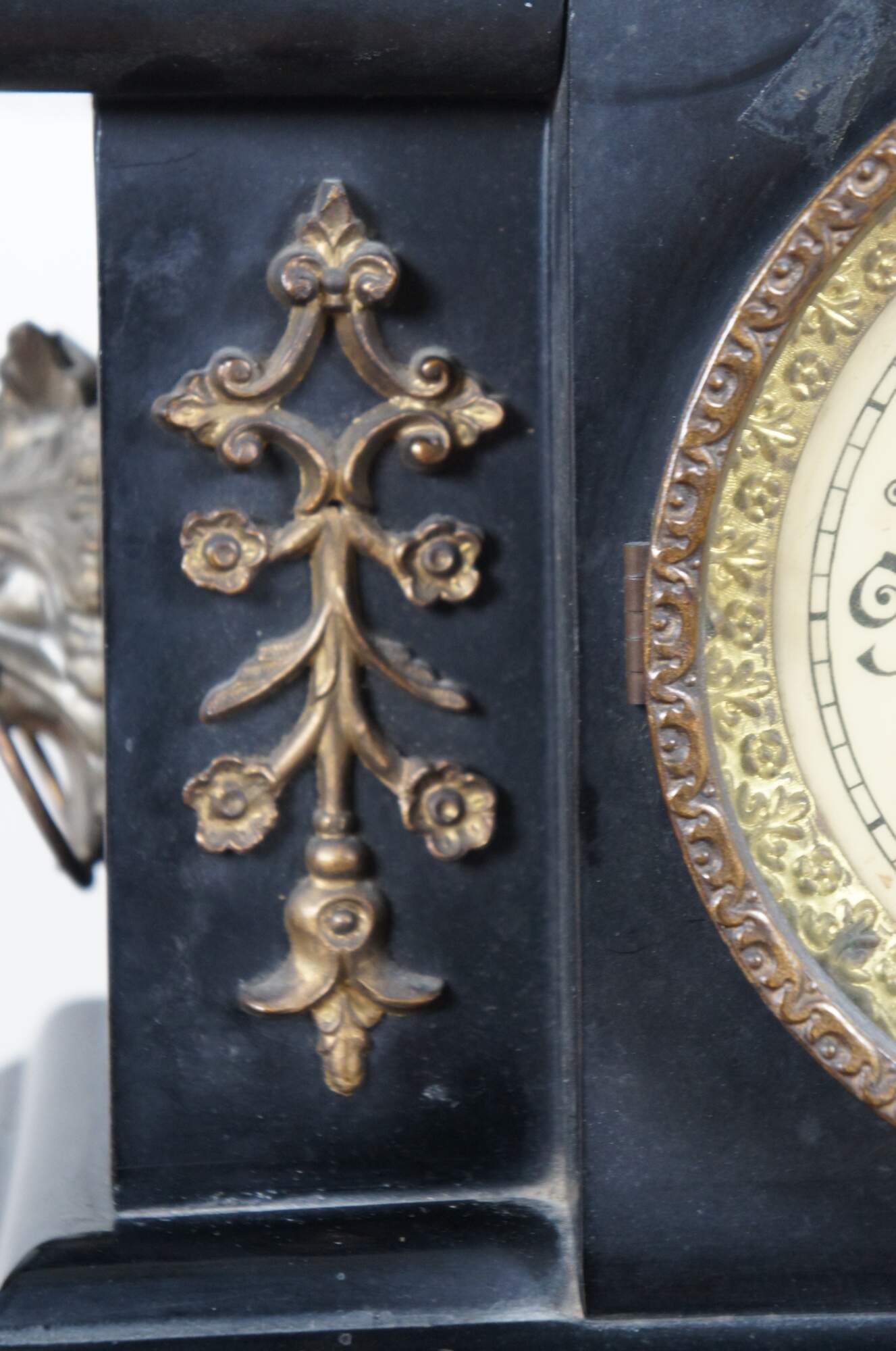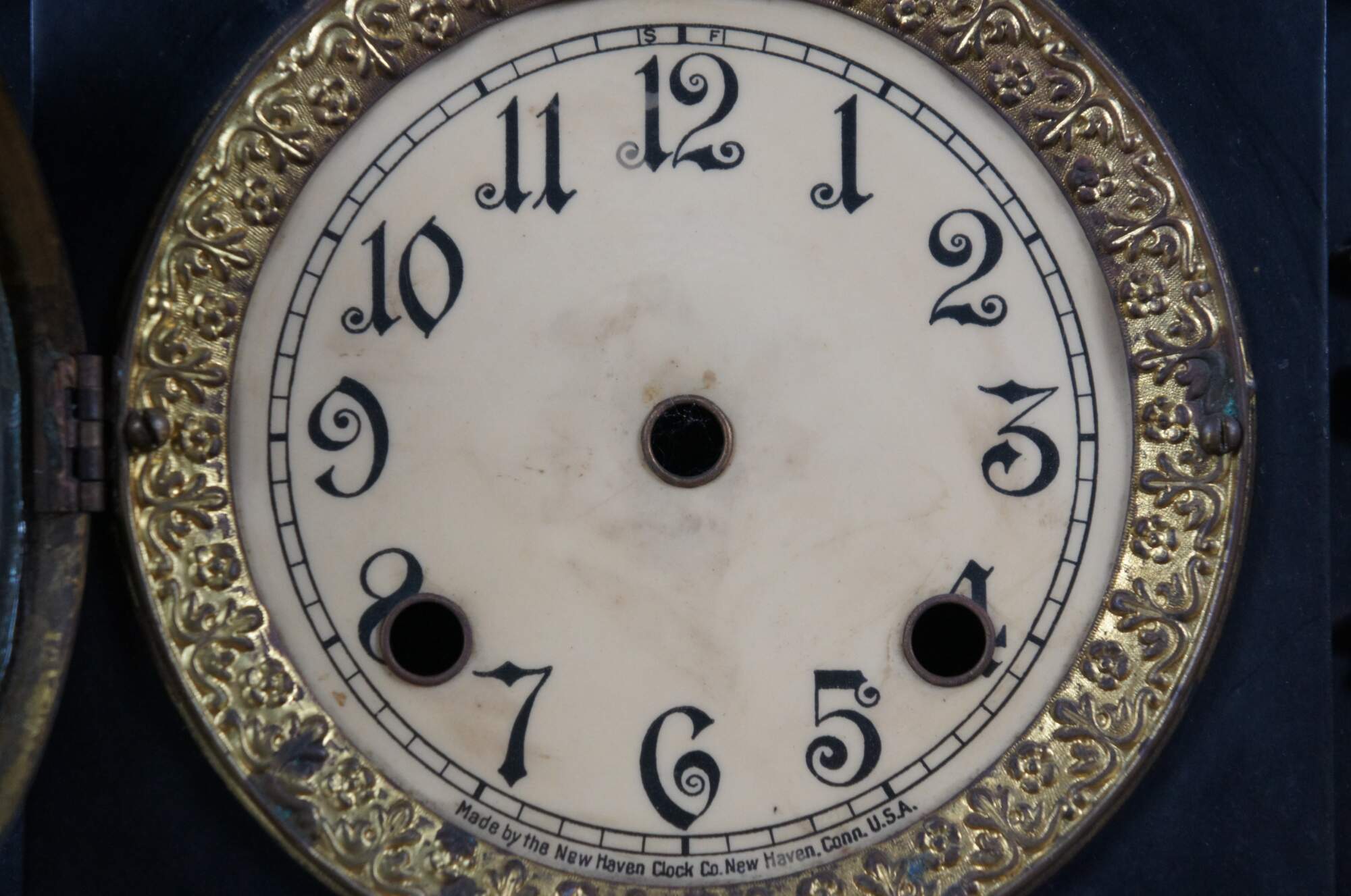 Early 20th century mantel clock case by the New Haven Clock Company. Black enameld cast iron case, rectangular form with footed base and pediment. Cornucopia shaped brass feet on front corners; brass dog / wolf / lion heads with ring handles on each side; floral vines flanking stamped brass frame around face. White face with black Arabic numerals. No movement / hands; case / parts only.