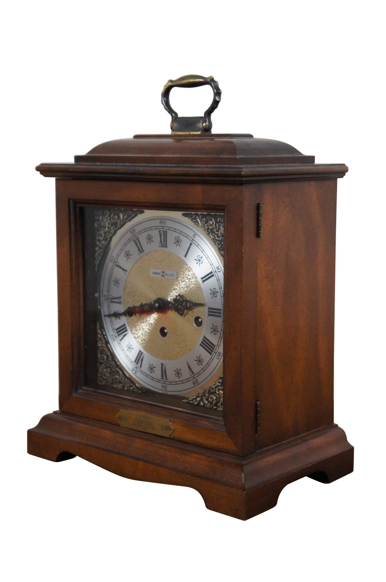Vintage late 1970's Model 4999, No 141 Westminster Chime Key Wind Movement bracket style mantel clock by Howard Miller Clock Company / Barwick Clock Division. Walnut case with footed base and pediment, topped with brass handle. Silver tone face with black Roman numerals framed with mottled gold tone center, brass foliate / face corners. Plaque on front reads: "C.R. Thomas In Appreciation of 25 Years Service Western Electric 1978." New movement 2003 - Frans Hermle - Two Jewels Unadjusted - Made in Germany - 340-020A.