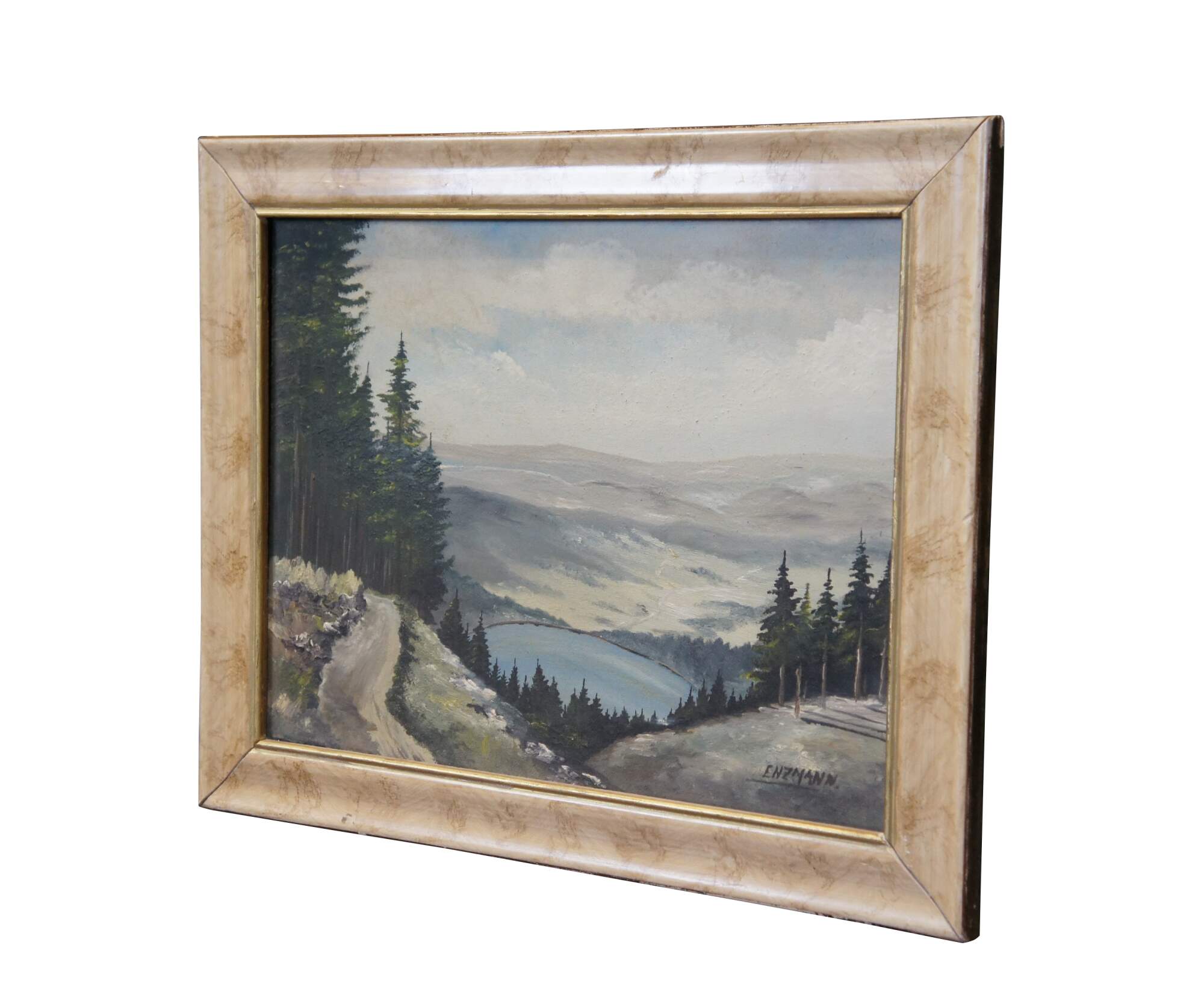 Early to mid 20th century oil on board landscape painting depicting an Apline mountain lake viewed from a pine covered hilltop. Signed Enzmann in lower right - attributed to Eduard Enzmann. Beveled painted wood frame with gold edge.