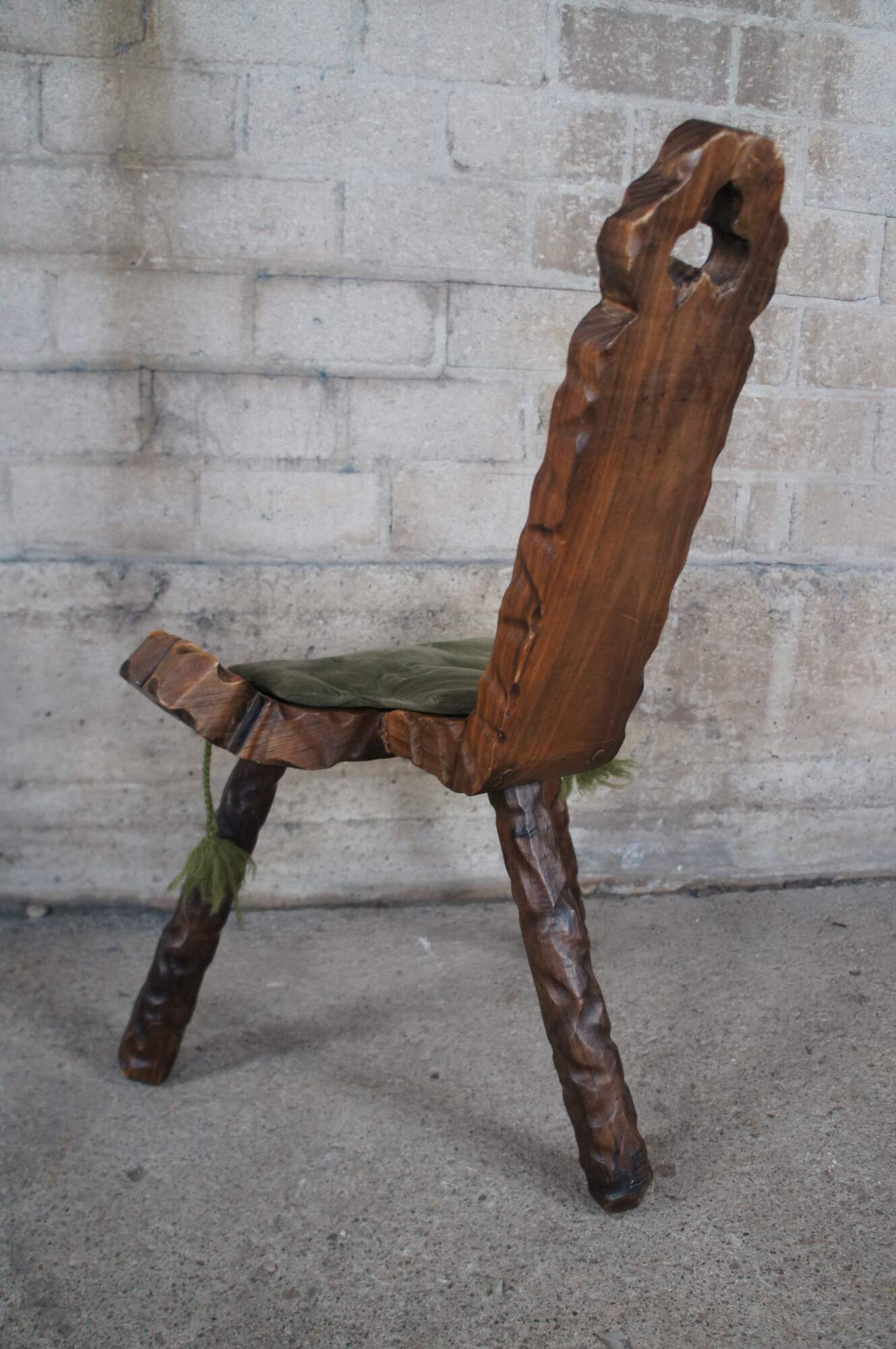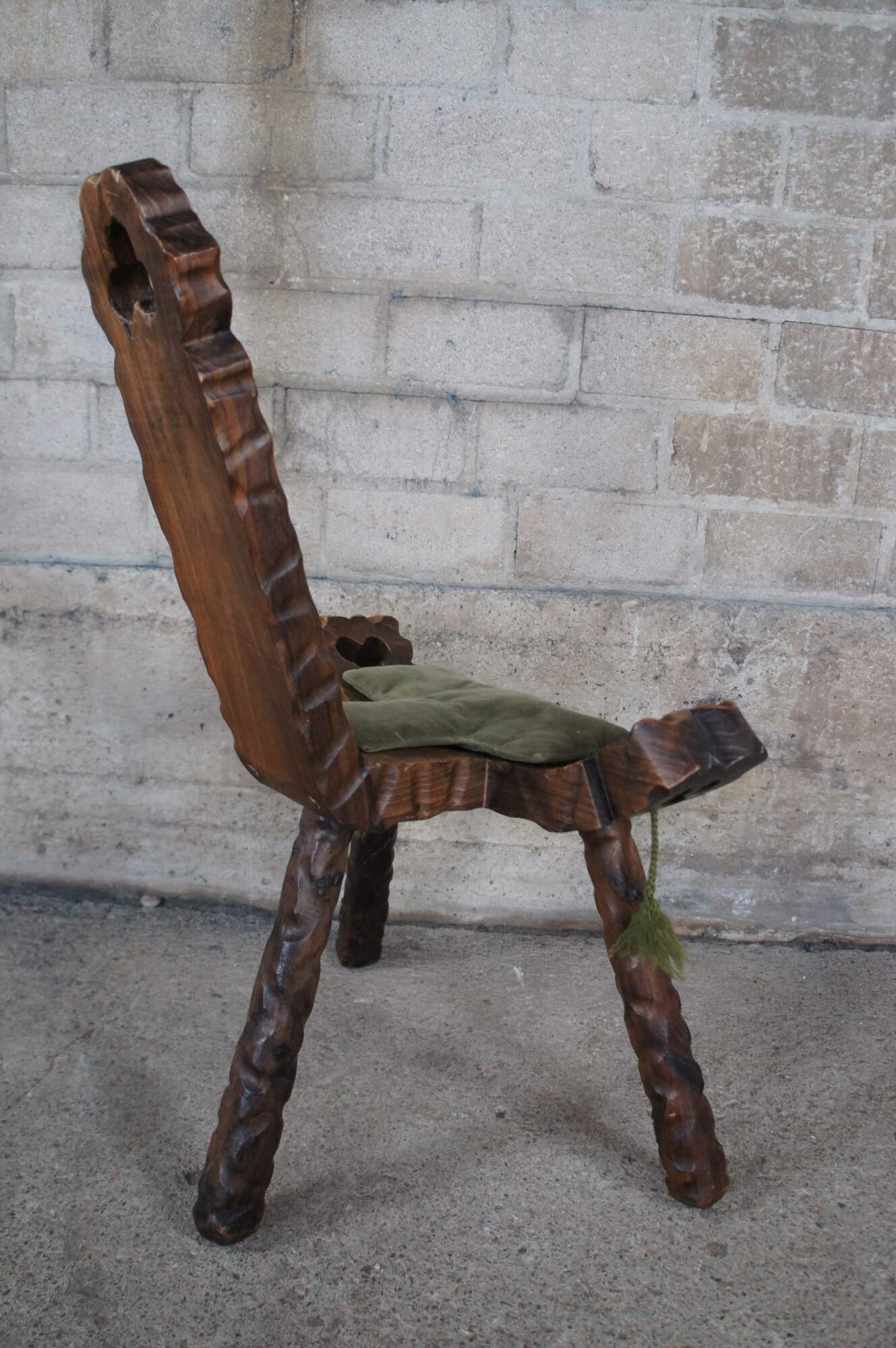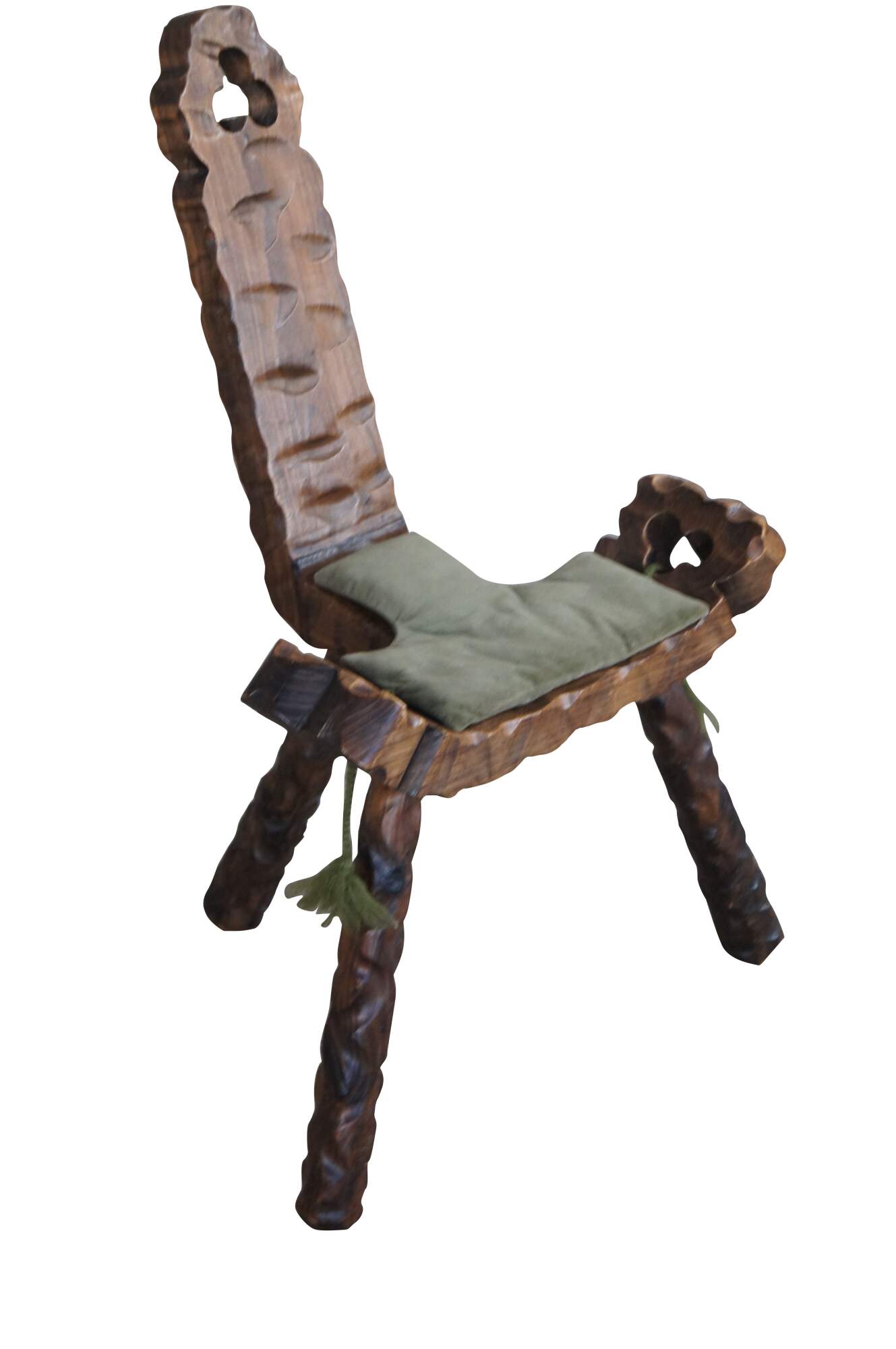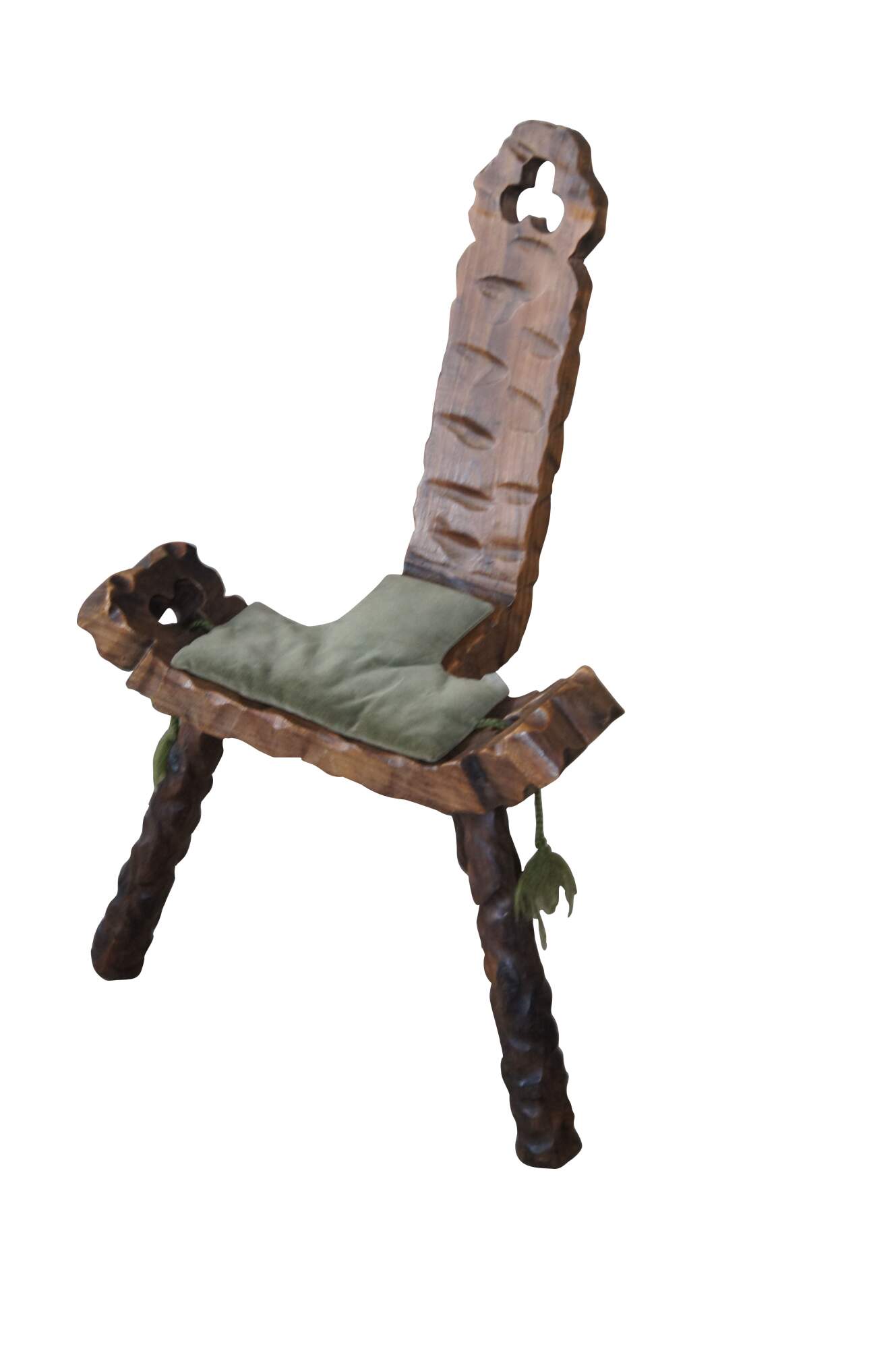 Mid century circa 1950s Spanish birthing stool or chair. Made of walnut featuring carved brutalist design with clover shaped cutouts, two handles / arms, and tripod base.
