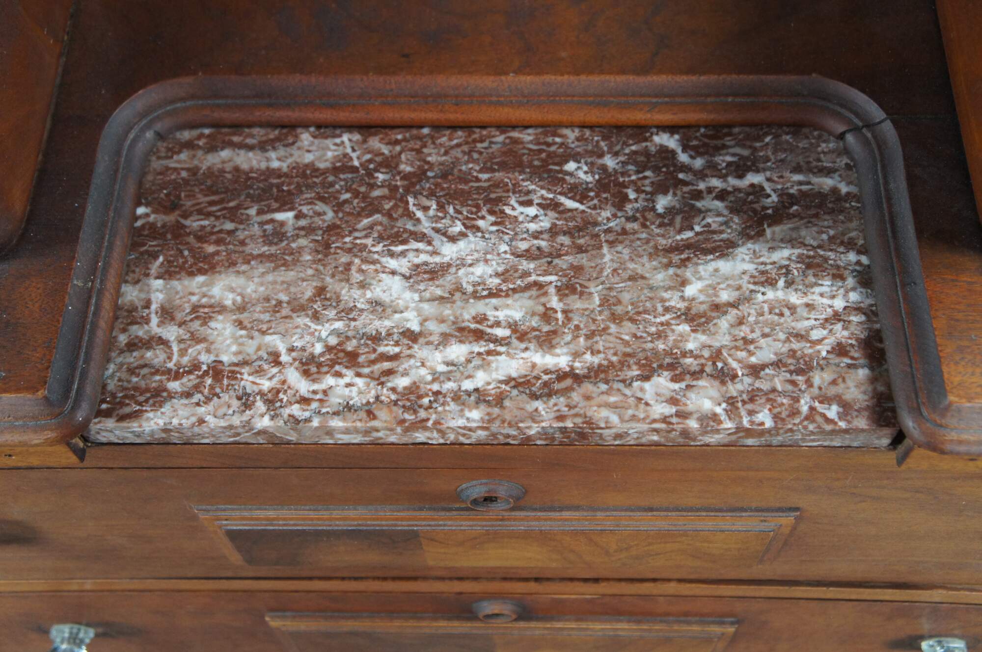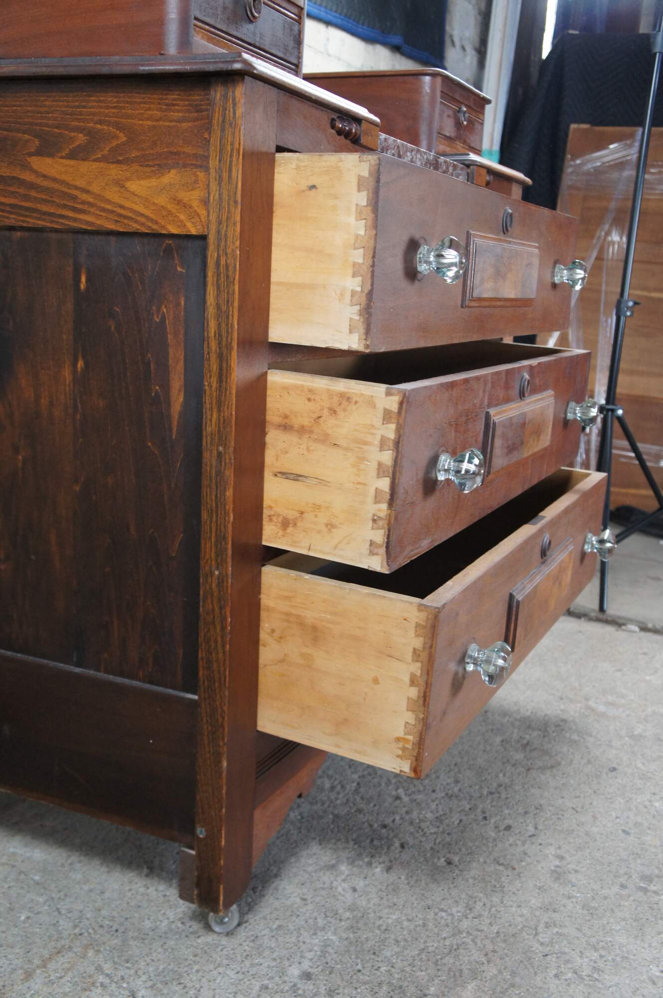 Circa 1880s Victorian dresser. Made from walnut with two glovebox drawers flanking a marble insert and three larger lower hand dovetailed drawers with paneled trim, glass knob pulls, wooden key hole escutcheons, over castors.