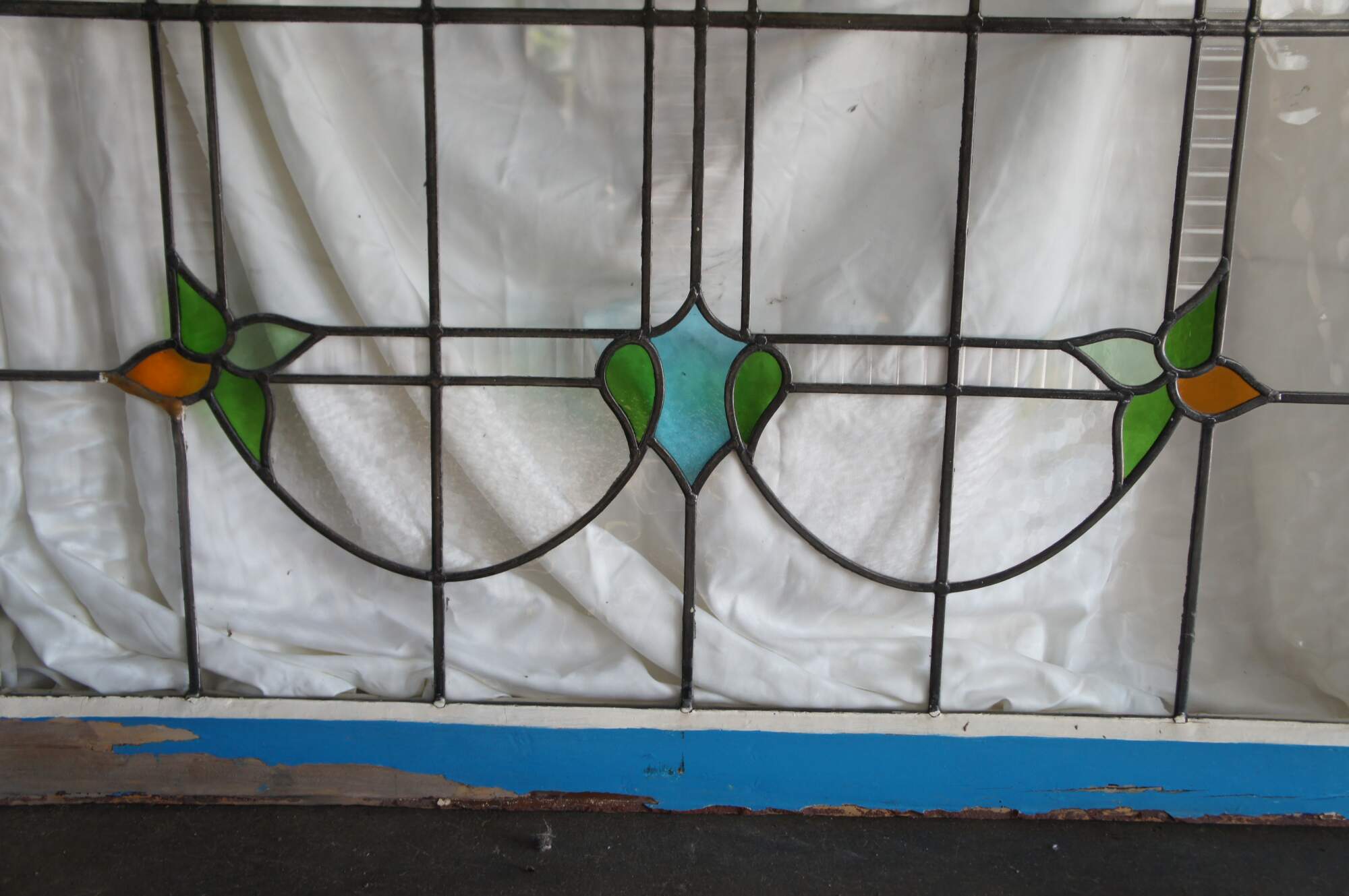 An exquisite pair of 19th century leaded stained glass windows. Features a large rectangular frame with arched area beneath a transom that opens via hinge to allow fresh air in. Each window is designed with clear, pebbled and textured glass set around ornate floral designs showcasing colors of blue, green, amber and purple. The glass is set within large original pine frames. A monumental set that will make for the perfect addition to any space.