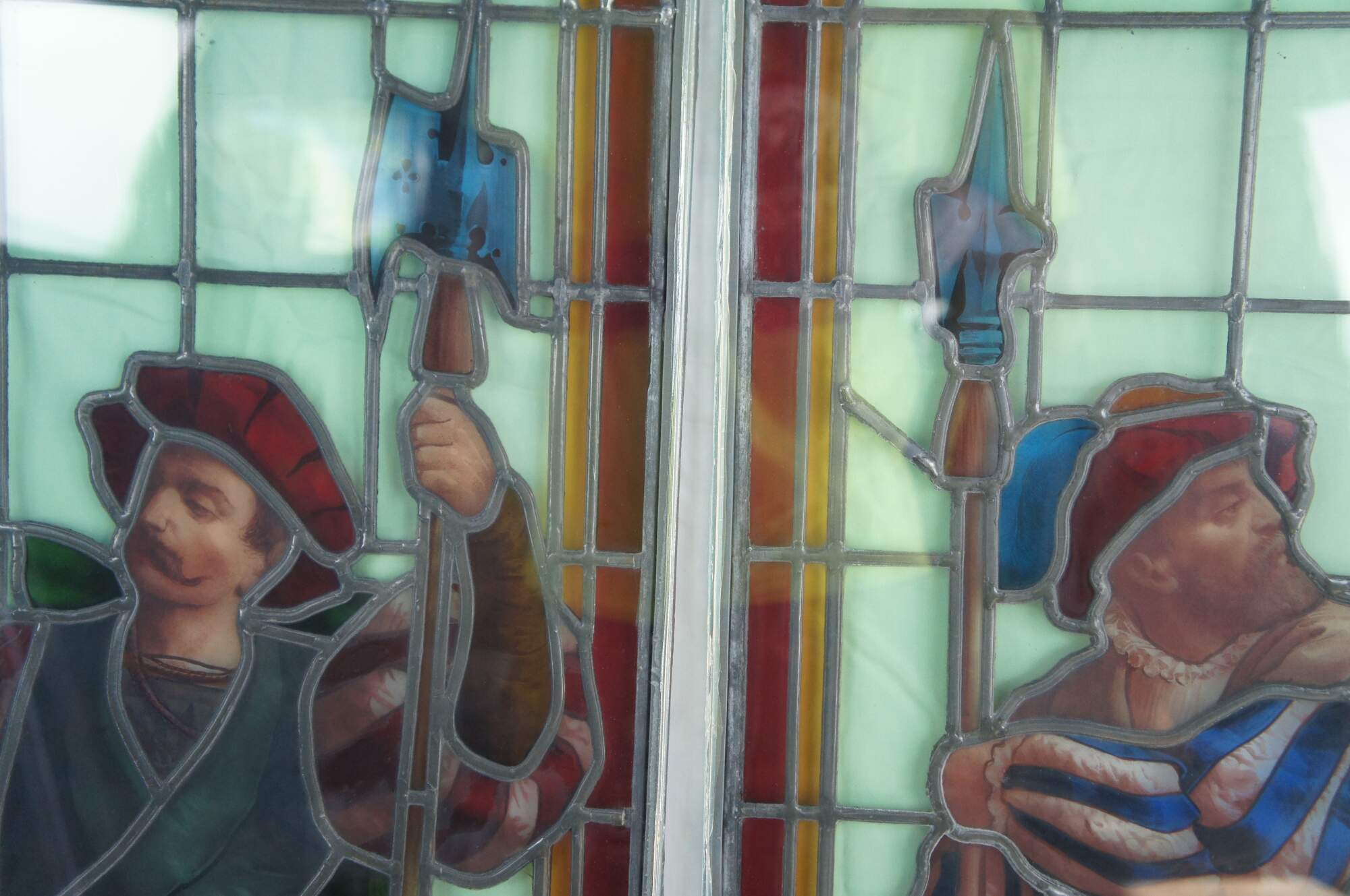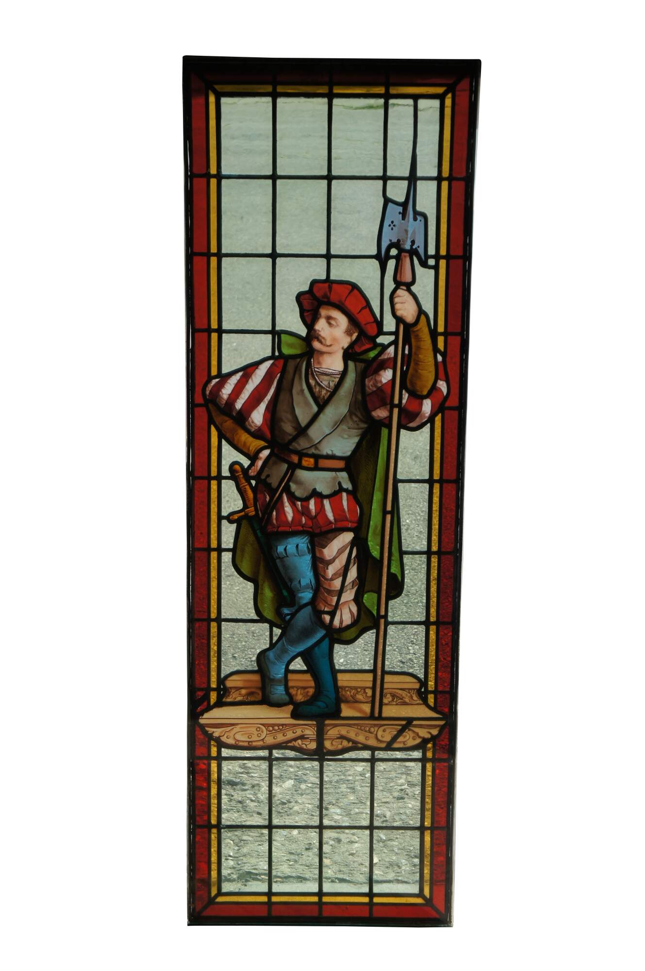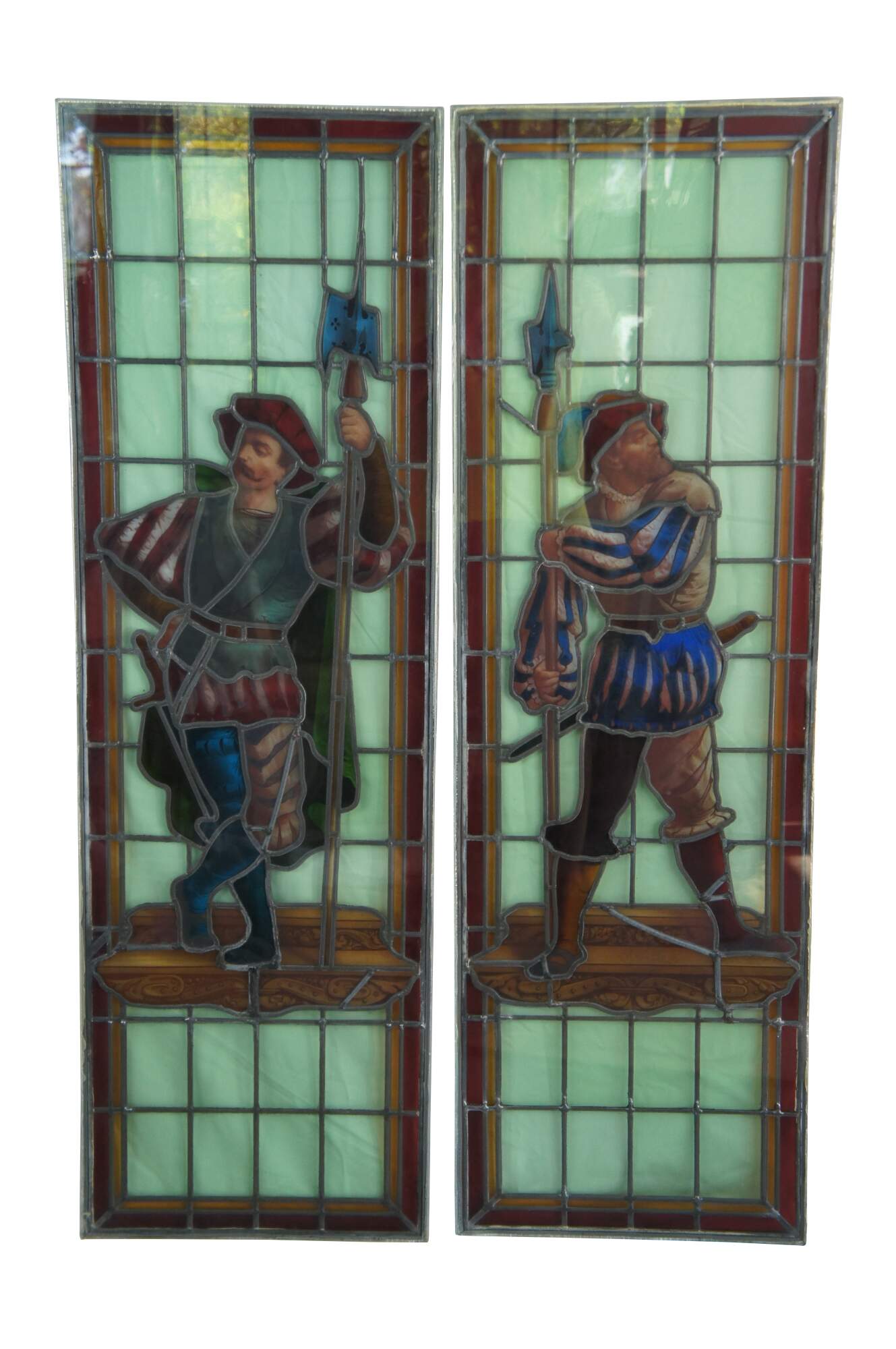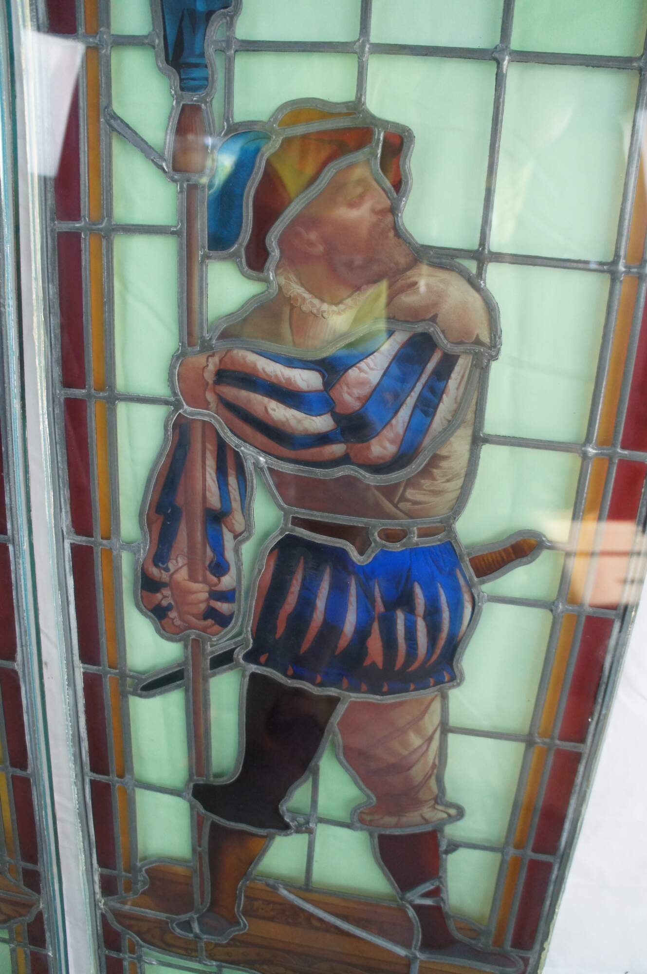 An impressive Pair of stained glass windows of the highest quality, painted with grisaille and enamels on cathedral glass, circa 19th century. Representing two Renaissance Halberdiers or Swiss Guards in colorful attire with swords along their waistline. Each is set in the middle of a tinted lattice background, framed in amber and red stained glass. The windows were fully restored by one of the best restorations specialist in the united stated around 1980. Each is sandwiched between two tempered glass panels for protection. Great for hanging within an existing space, or re-purposed for use in doors.