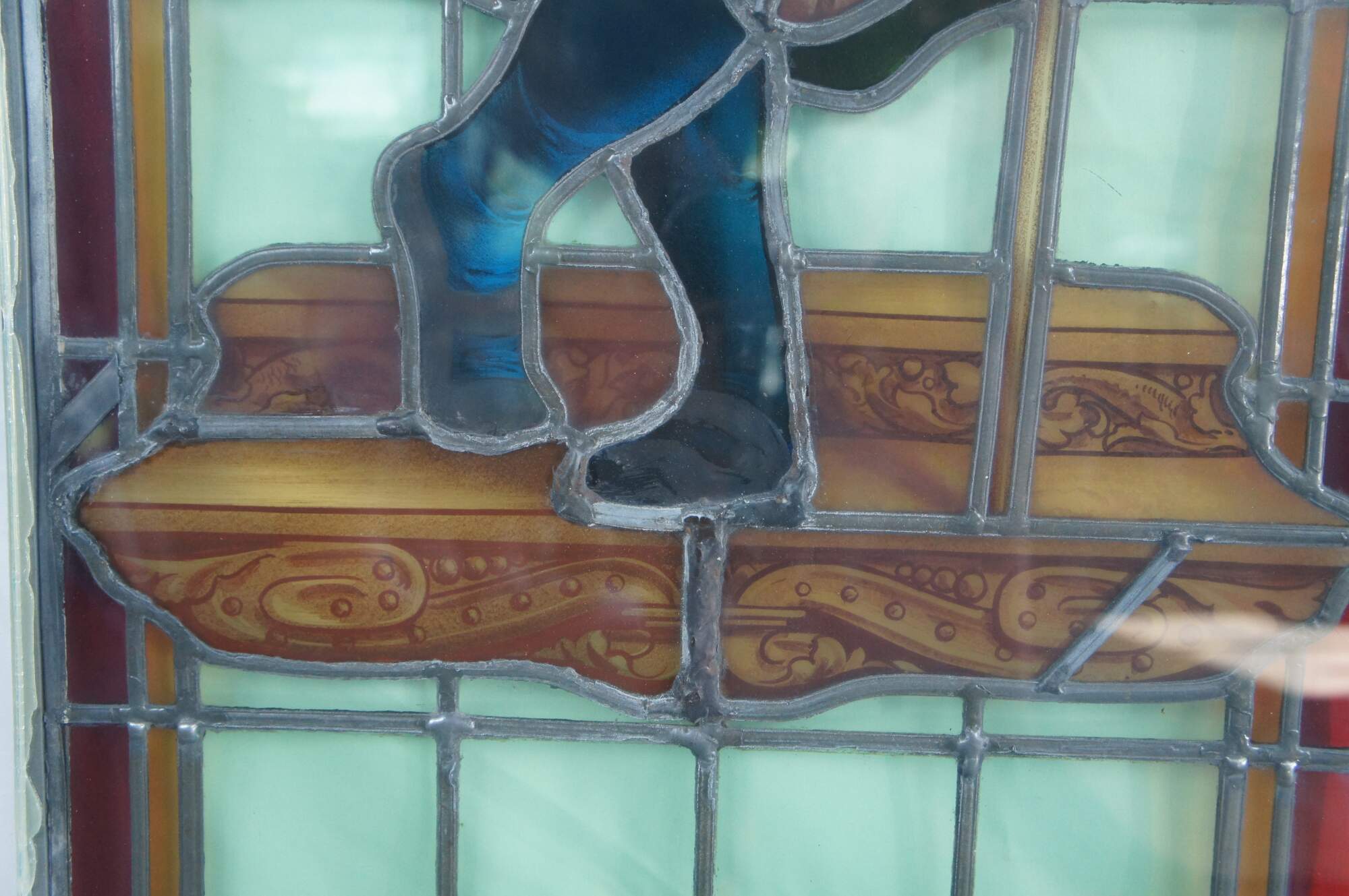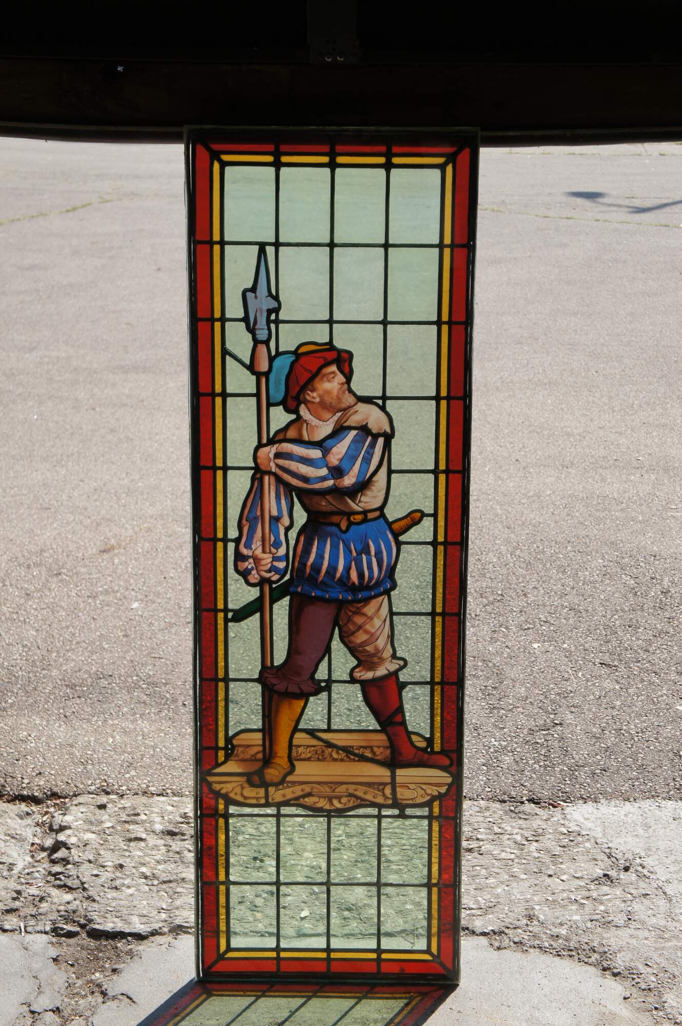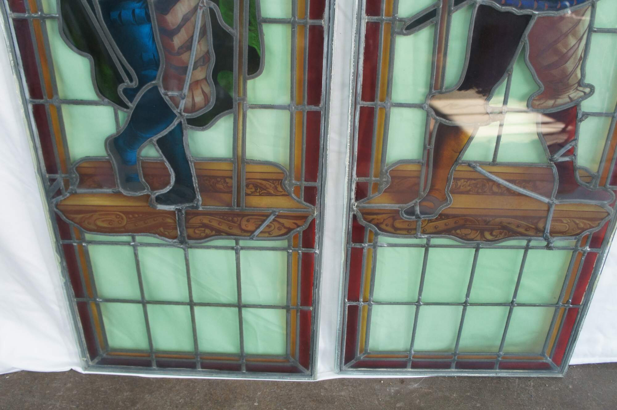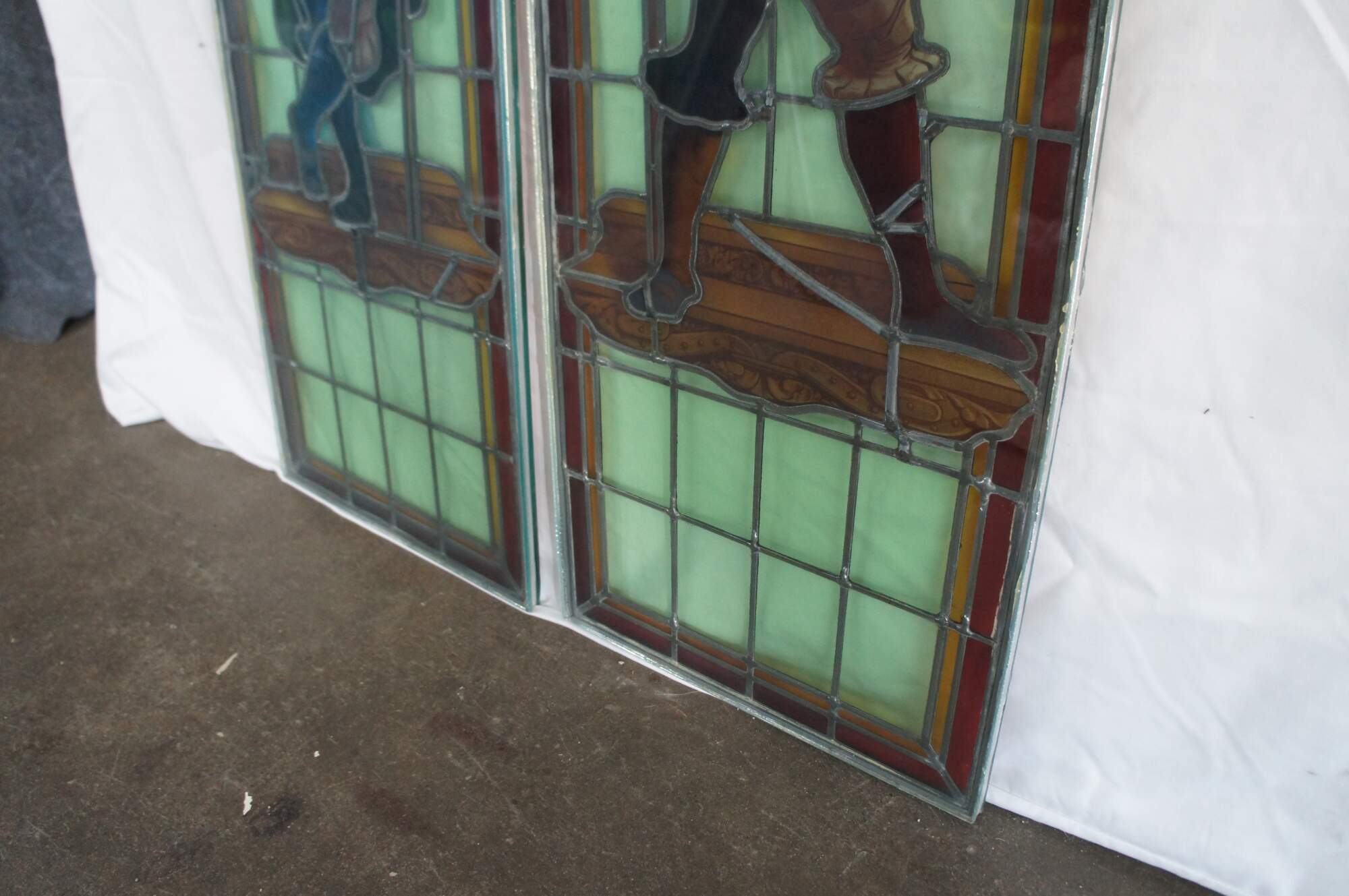 An impressive Pair of stained glass windows of the highest quality, painted with grisaille and enamels on cathedral glass, circa 19th century. Representing two Renaissance Halberdiers or Swiss Guards in colorful attire with swords along their waistline. Each is set in the middle of a tinted lattice background, framed in amber and red stained glass. The windows were fully restored by one of the best restorations specialist in the united stated around 1980. Each is sandwiched between two tempered glass panels for protection. Great for hanging within an existing space, or re-purposed for use in doors.