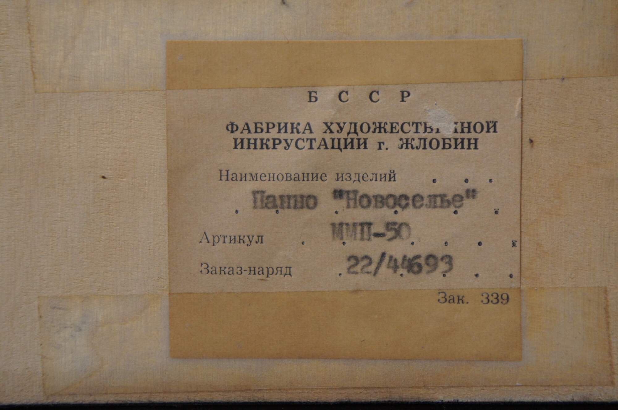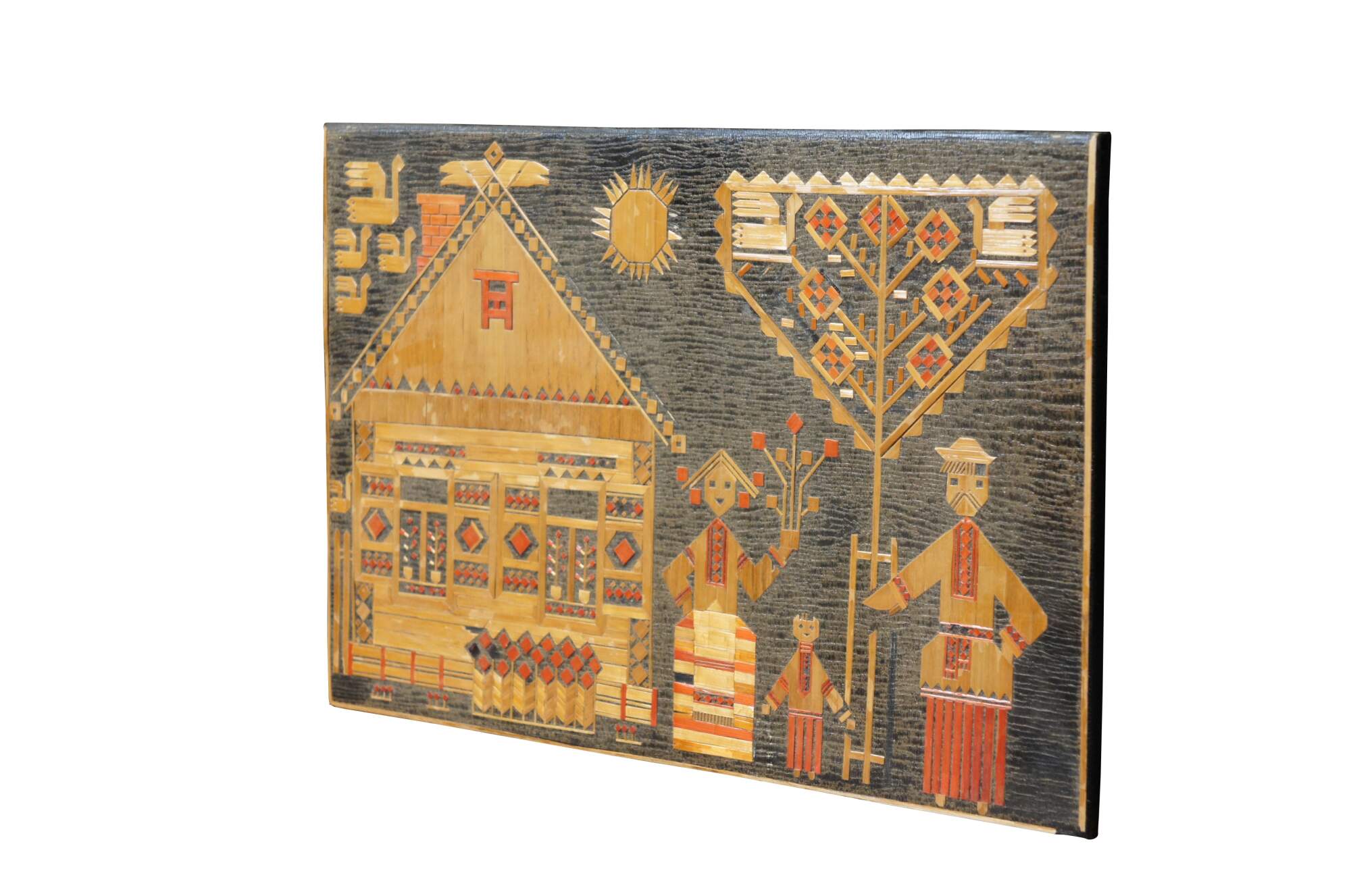 Vintage Russian folk art wall plaque titled "Housewarming," featuring a black painted wood background on which is laid a marquetry style scene of a family standing under a tree beside their farm / cottage, done in cut pieces of plain and colored straw. USSR - Factory of Art, Inlaying, Zholbin - Product Name Panel "Housewarming" - Item MMIT-50 - Work Order 22/44693 - Zak. 339