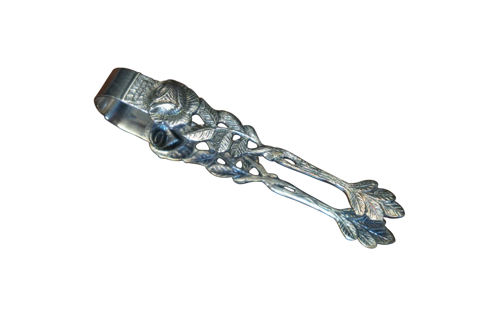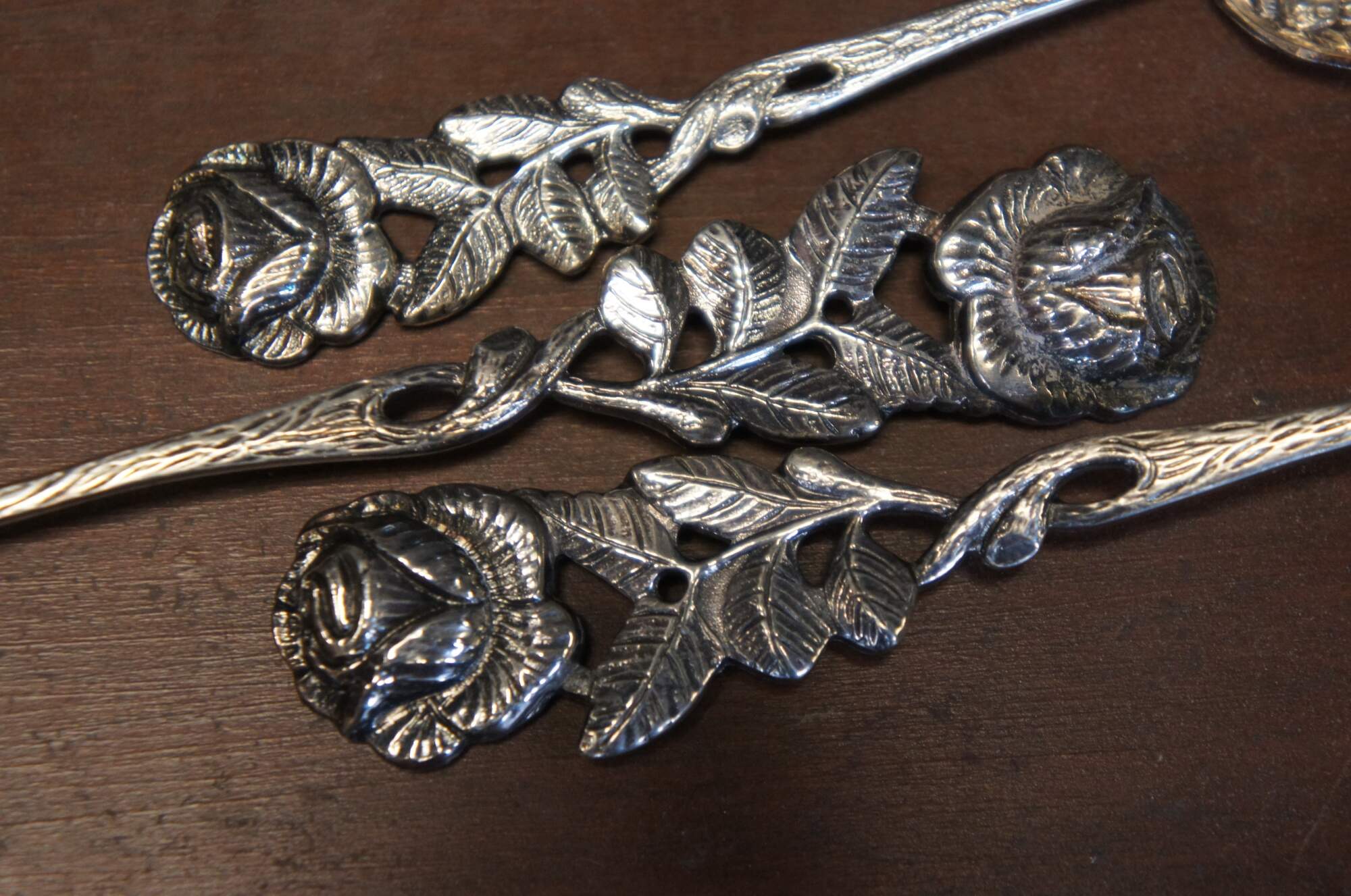 Vintage set of four Antiko 100 silverplated serving pieces in the Hildesheimer Rose pattern. Includes cake server, two spoons, and tongs. Includes original boxes. Originally purchaces at Hambach-Kalb, Fulda.